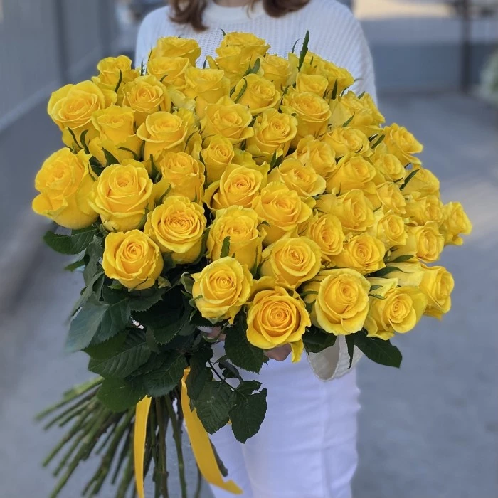 Букет из 51 высокой желтой розы Хай Еллоу с красивым крупным бутоном.