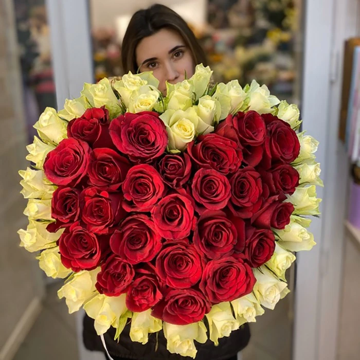Cостав: 55 белых и красных роз 40 см