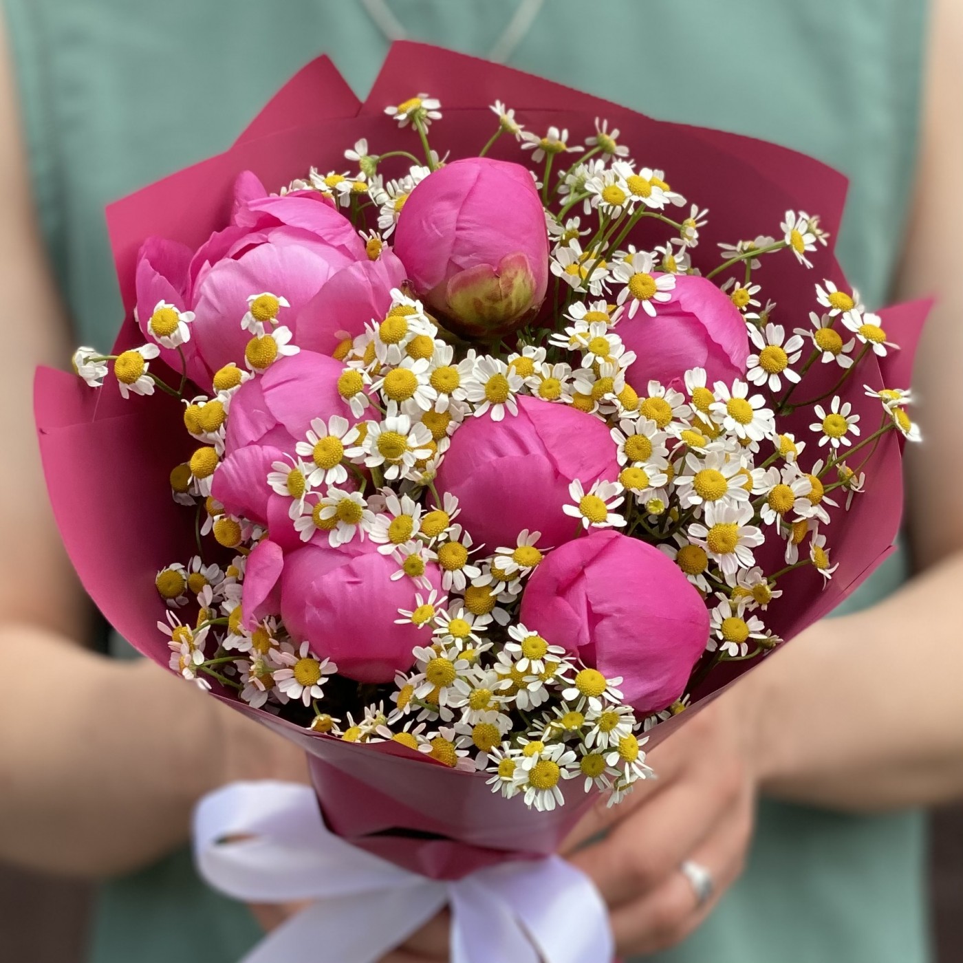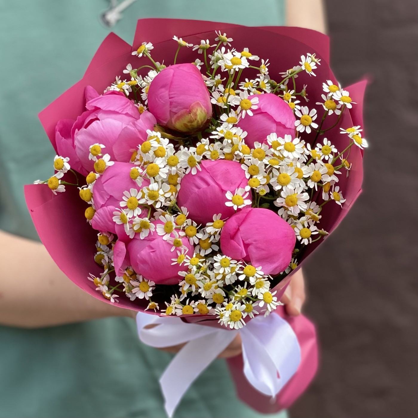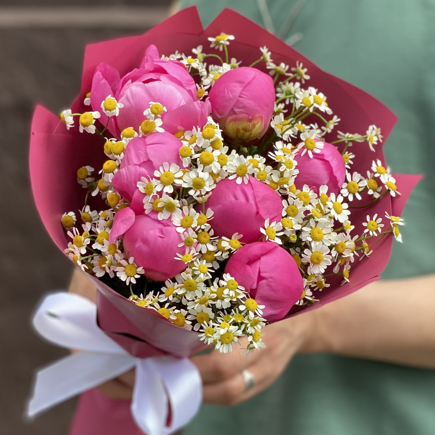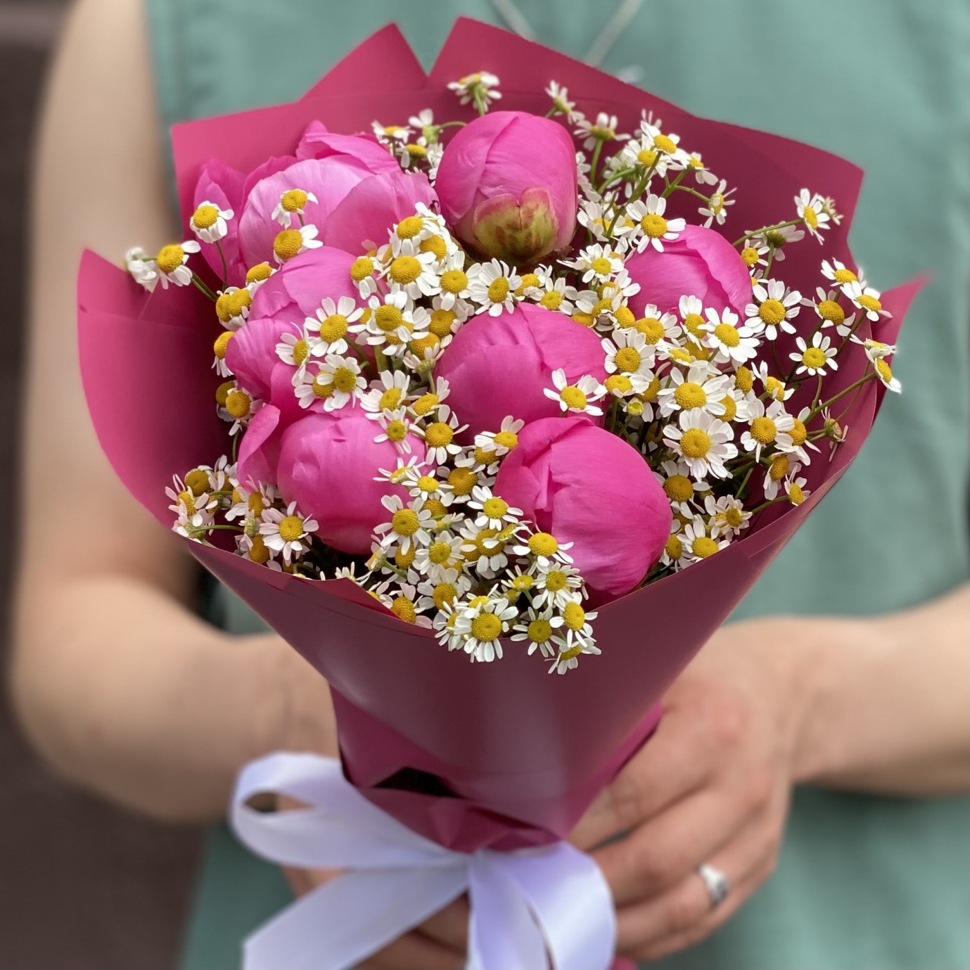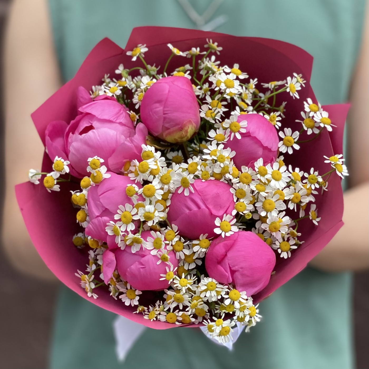 Потрясающий, роскошный и сочный букет из ярко-розового пиона Флеминг и нежных ромашек (танацетума). Удивительное сочетание цветов и эмоций способно привнести в жизнь великолепие и страсть, наполнить пространство свежестью и ярким цветом. 7 розовых пионов с ромашками отлично подойдут в качестве дополнения к подарку или как отдельное подношение по важному поводу, будь то годовщина, день рождения, 8 марта, 14 февраля и любая другая важная дата.