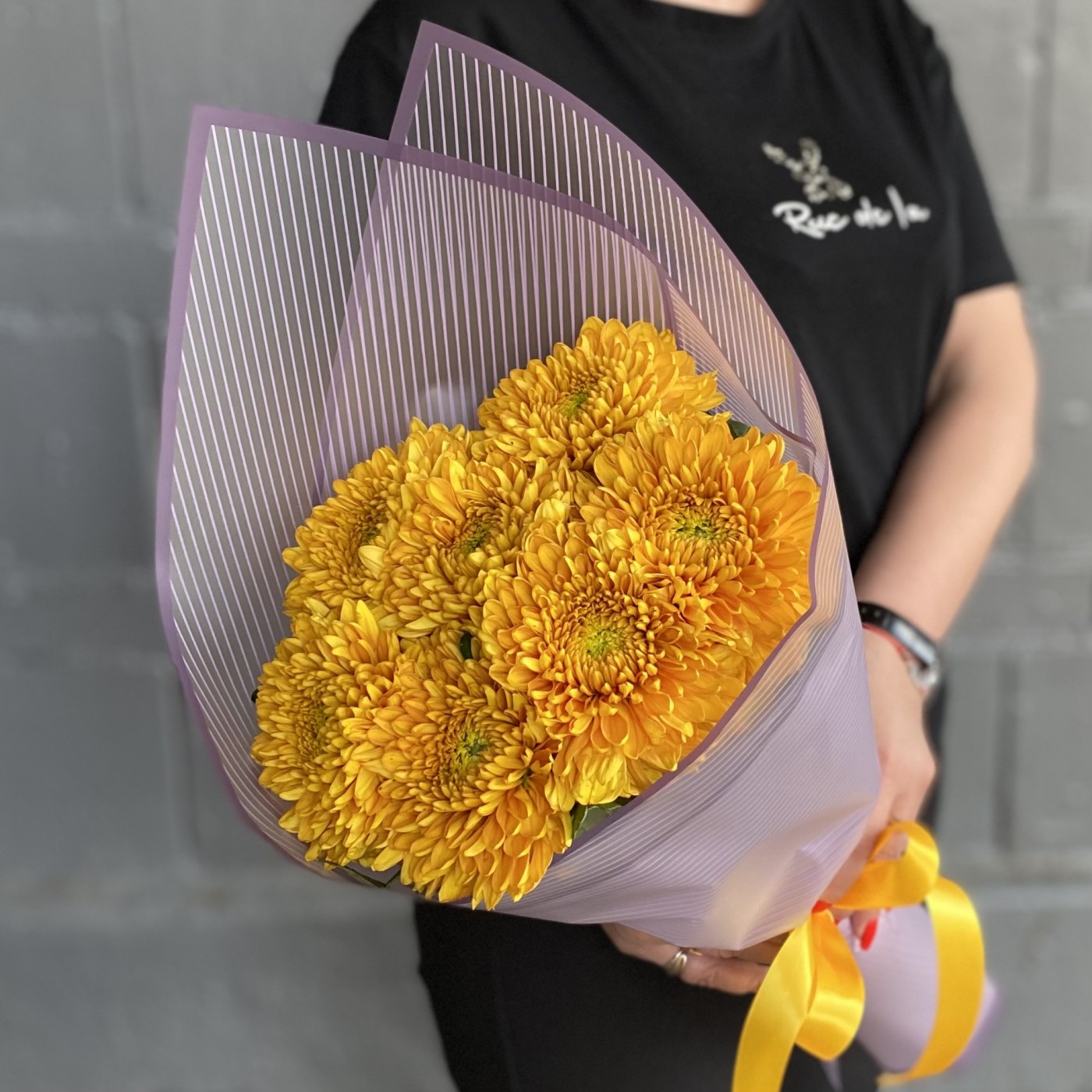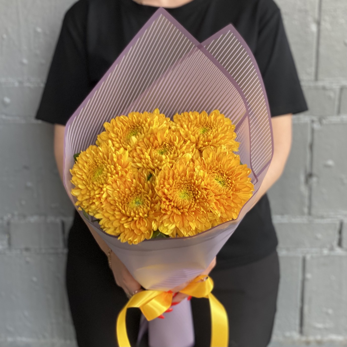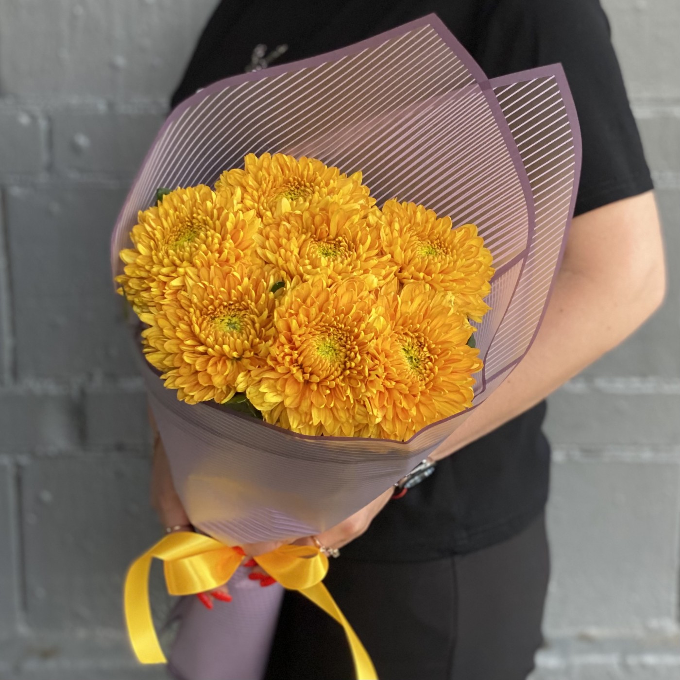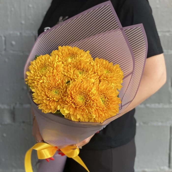 7 крупных оранжевых хризантем — это отличный вариант подарка девушке или женщине по любому поводу.
