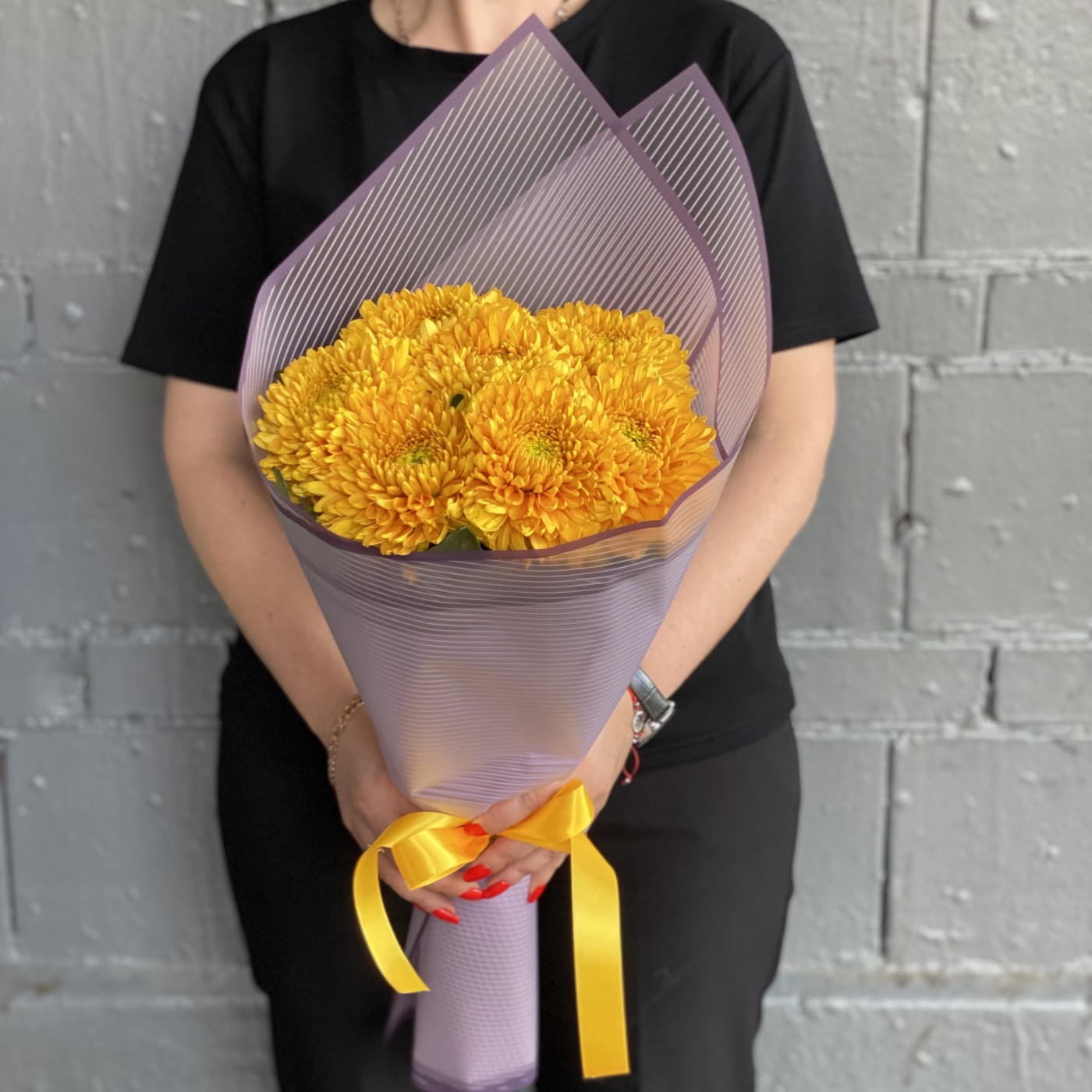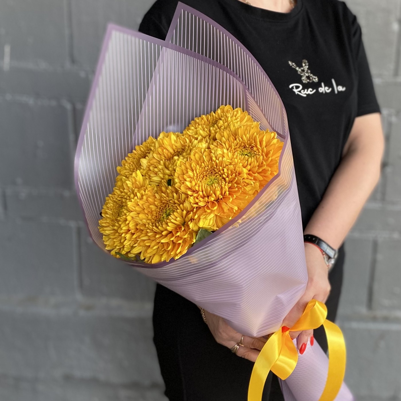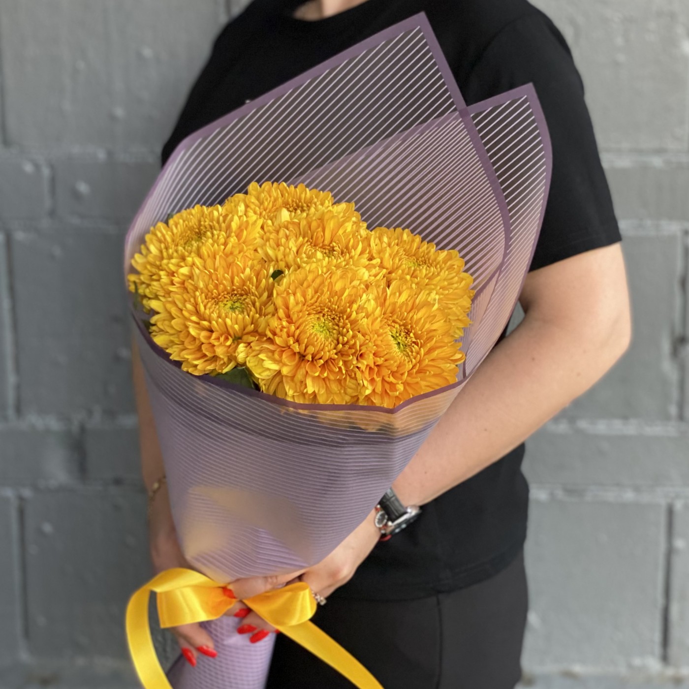 7 крупных оранжевых хризантем — это отличный вариант подарка девушке или женщине по любому поводу.