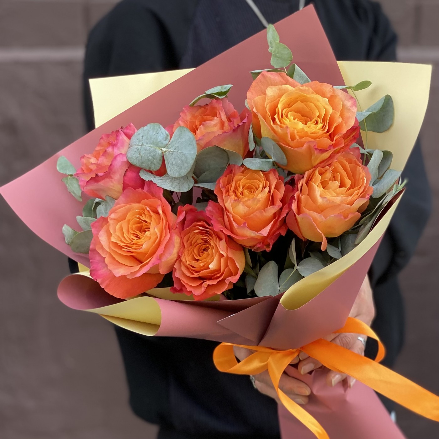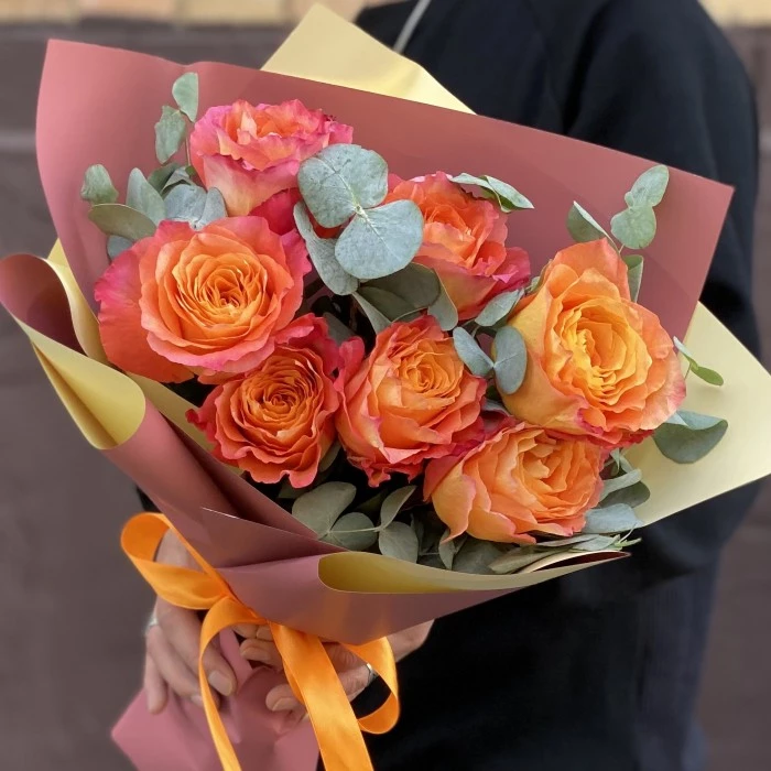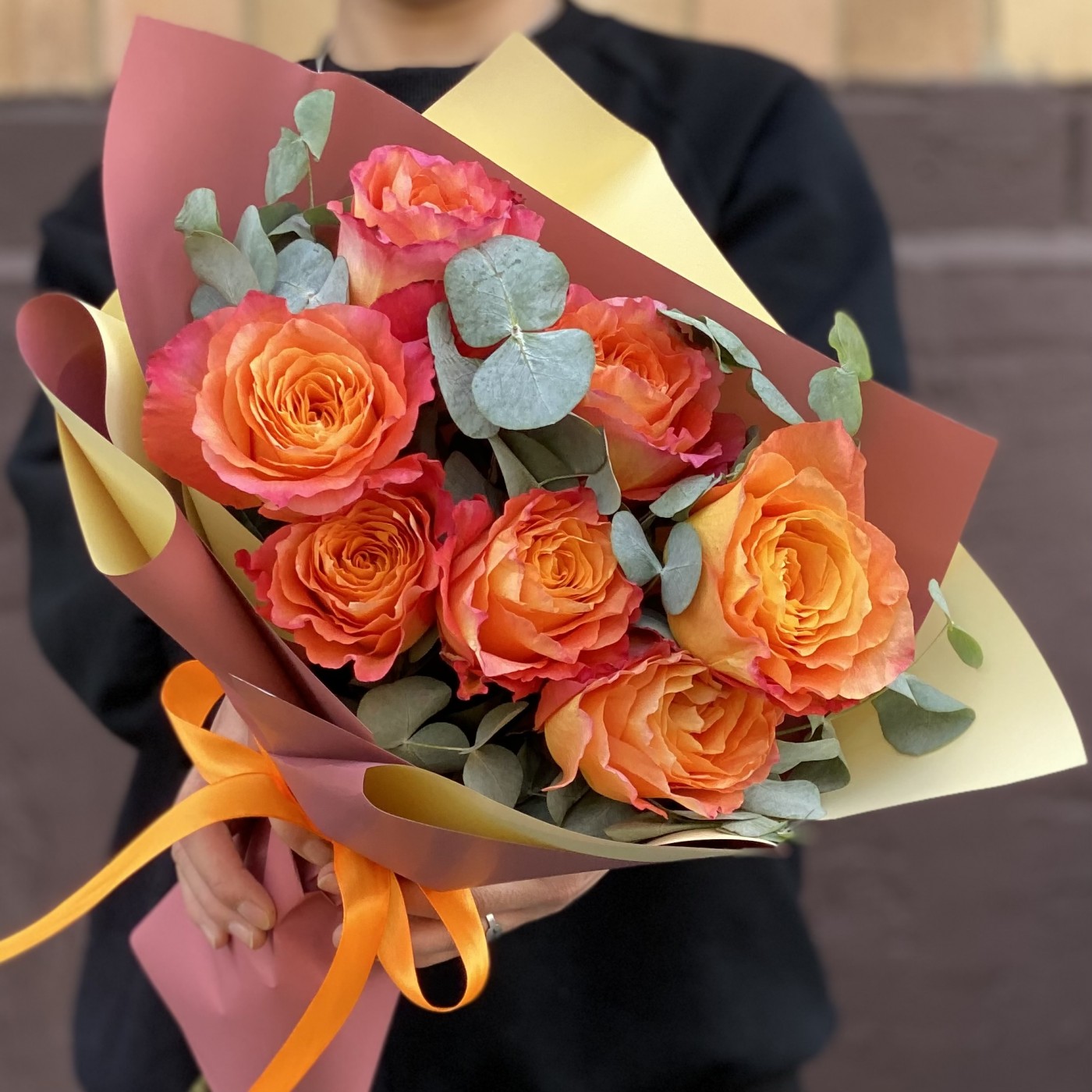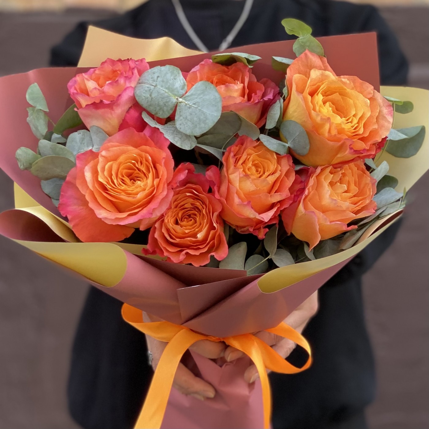 Букет из 7 роз сорта Фри Спирит. Яркий, легкий, очень выразительный букет, который прекрасно подойдет и для школьного праздника и для семейного торжества. Оранжевая роза с крупным бутоном, которая каждый день по мере своего раскрытия будет радовать своего получателя.