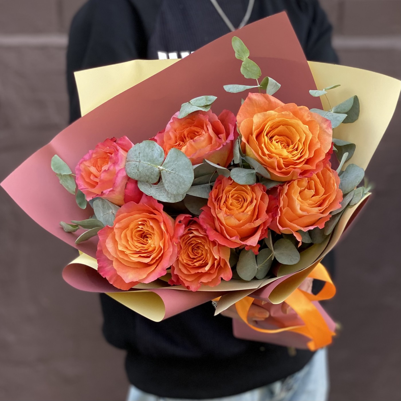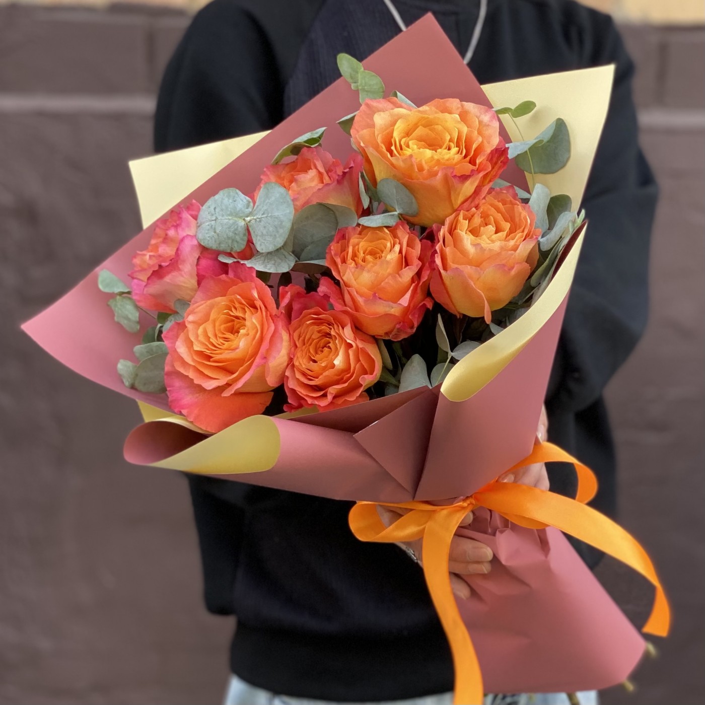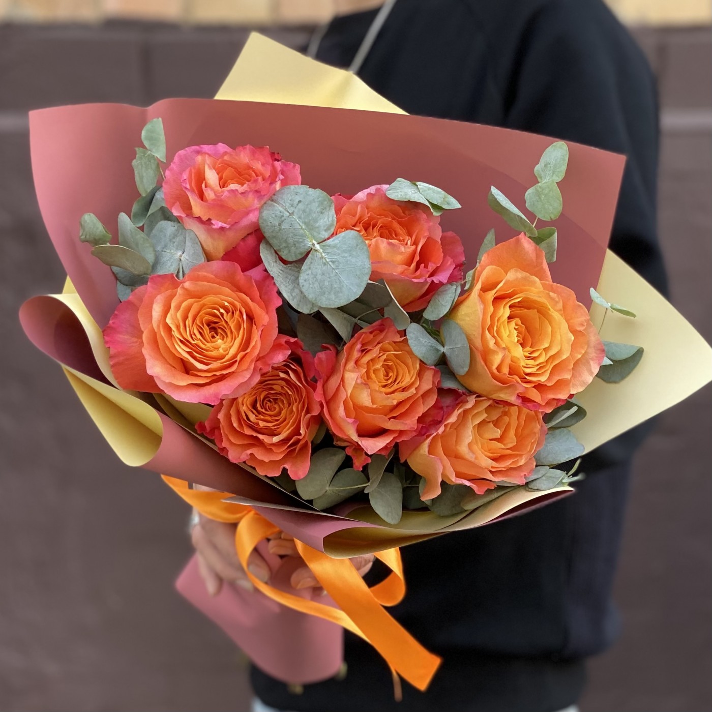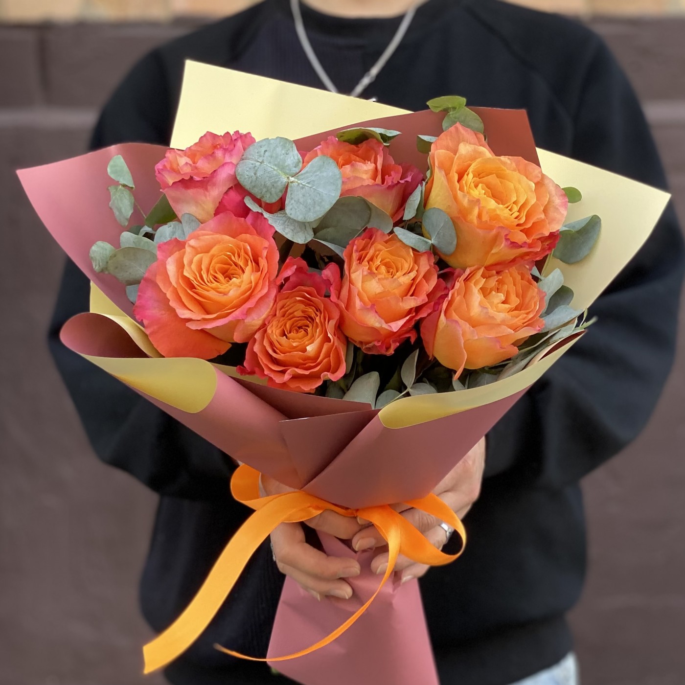 Букет из 7 роз сорта Фри Спирит. Яркий, легкий, очень выразительный букет, который прекрасно подойдет и для школьного праздника и для семейного торжества. Оранжевая роза с крупным бутоном, которая каждый день по мере своего раскрытия будет радовать своего получателя.