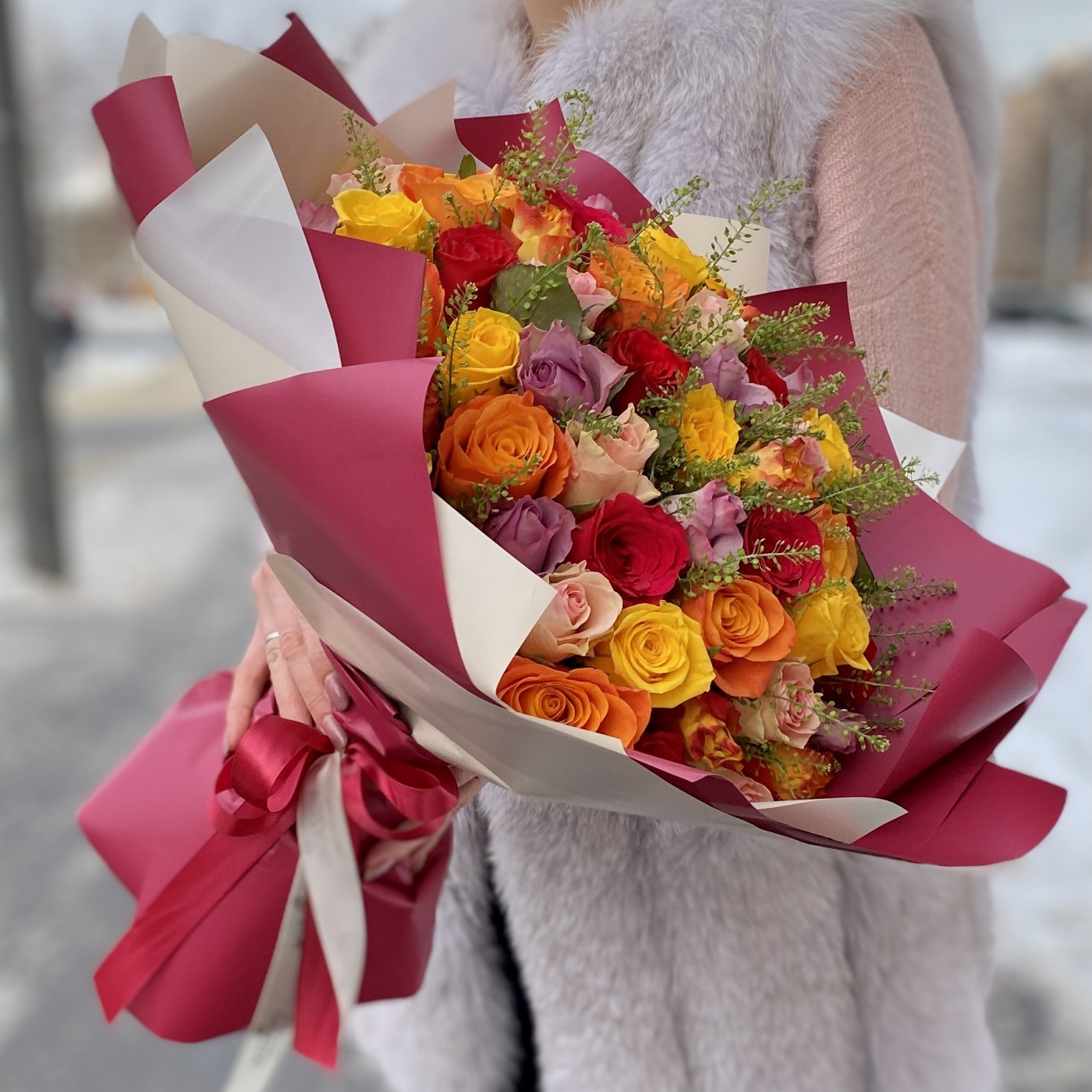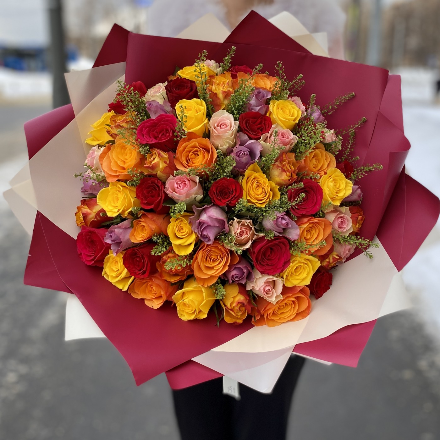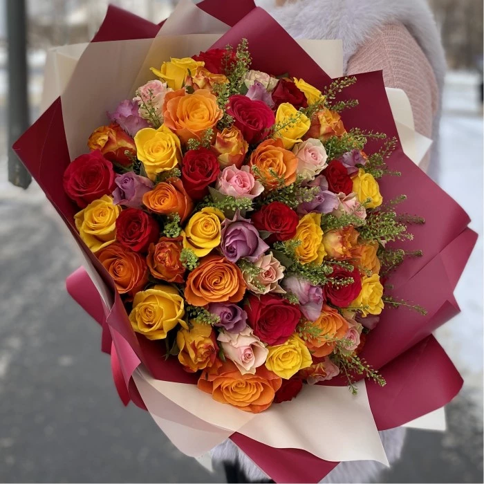 Яркий, лучезарный, роскошный букет составлен из 75 роз разных оттенков, которые удивительно точно сочетаются между собой. В композицию включены жизнерадостные желтые и оранжевые розы, харизматичные сиреневые и нежные розовые, а также страстные красные цветы. Яркие оттенки бутонов сливаются в гармоничный букет, который при одном только взгляде на него способен вызывать самые восторженные эмоции и поднять настроение. Уравновешивается буйство красок утонченным видом гринбелла. Композиция восхищает своим внешним видом и источает прекрасный аромат.