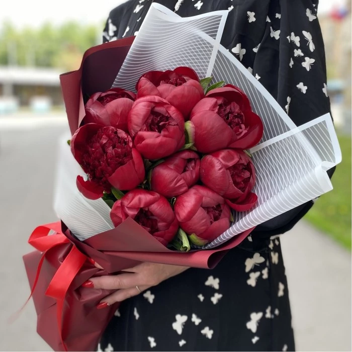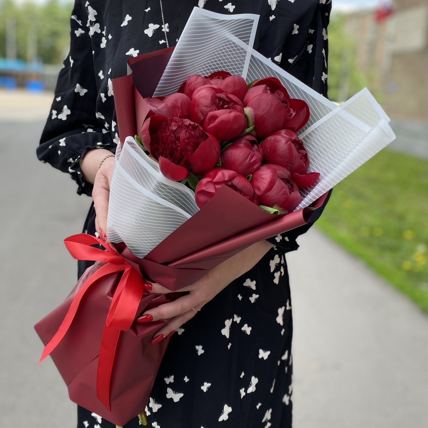 Очаровательный букет бордовых пионов — символ любви и благородства. Элитные ароматные пионы красных оттенков — самые желанные и любимые цветы для многих. Получить букет свежих, ароматных пионов мечтает каждая девушка. Поразите любимую букетом из потрясающих крупных бордовых пионов с неповторимым летним запахом. Букет пионов лучше любых слов расскажет о Вашем особом отношении к близкому человеку.