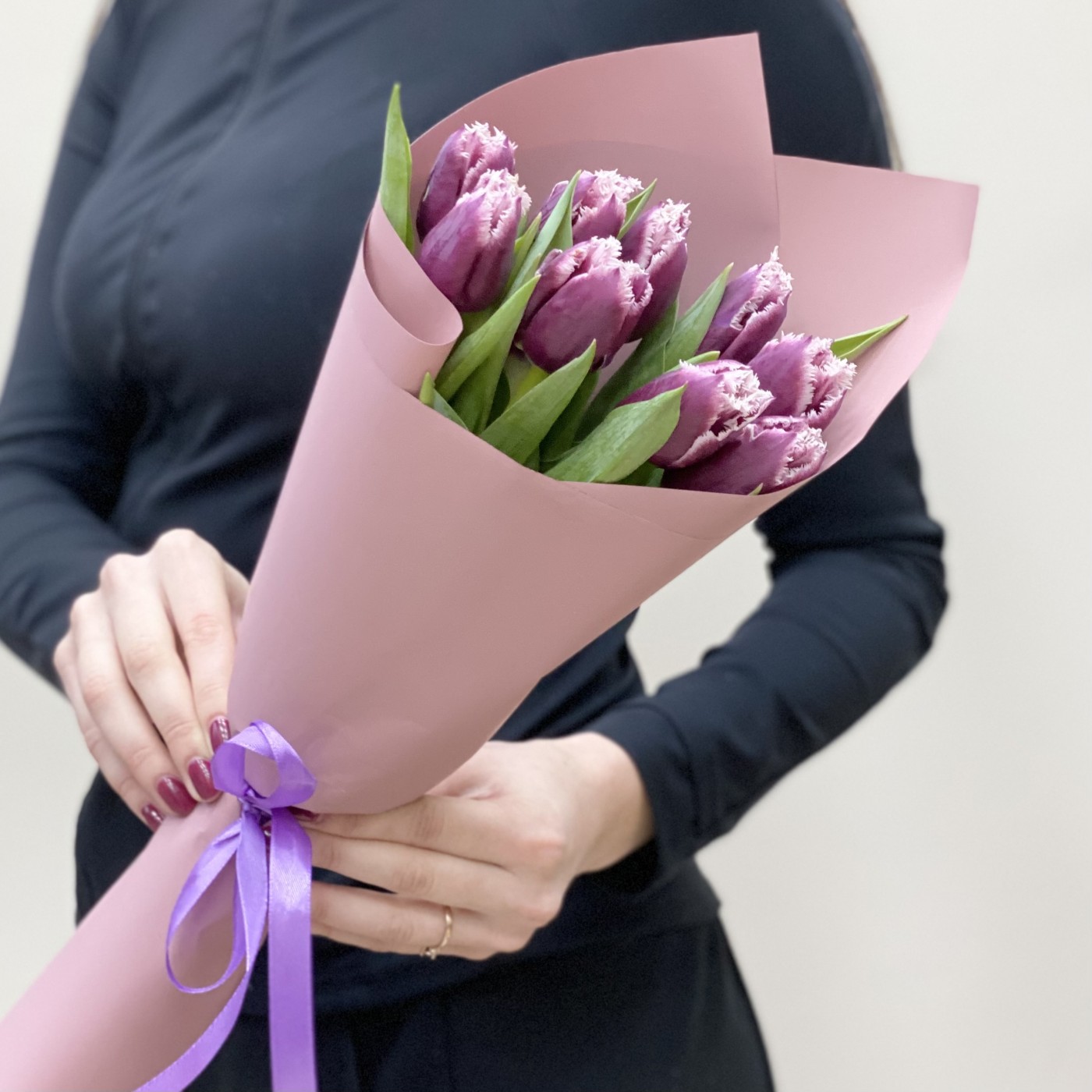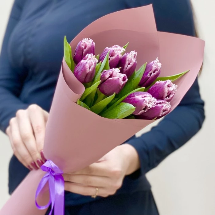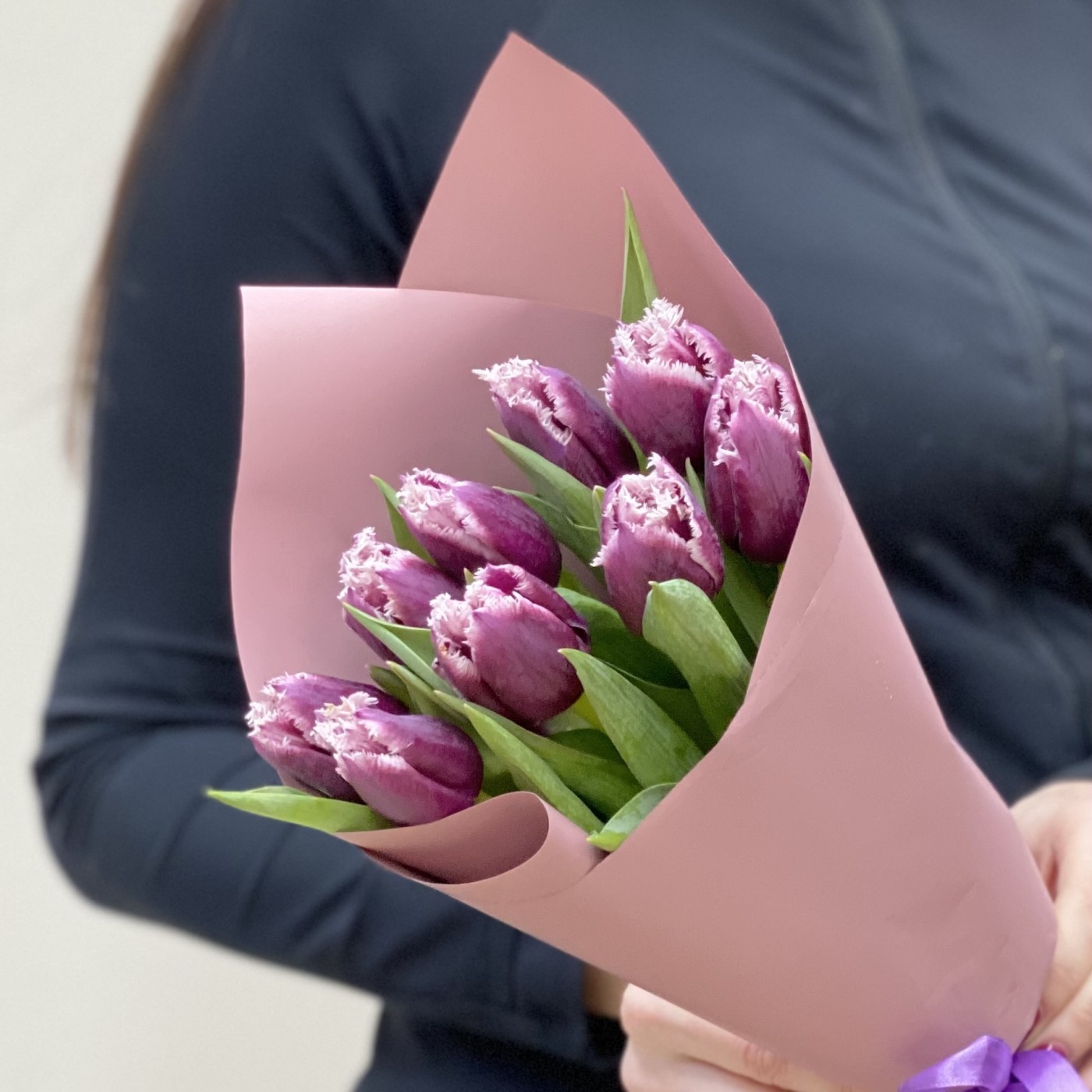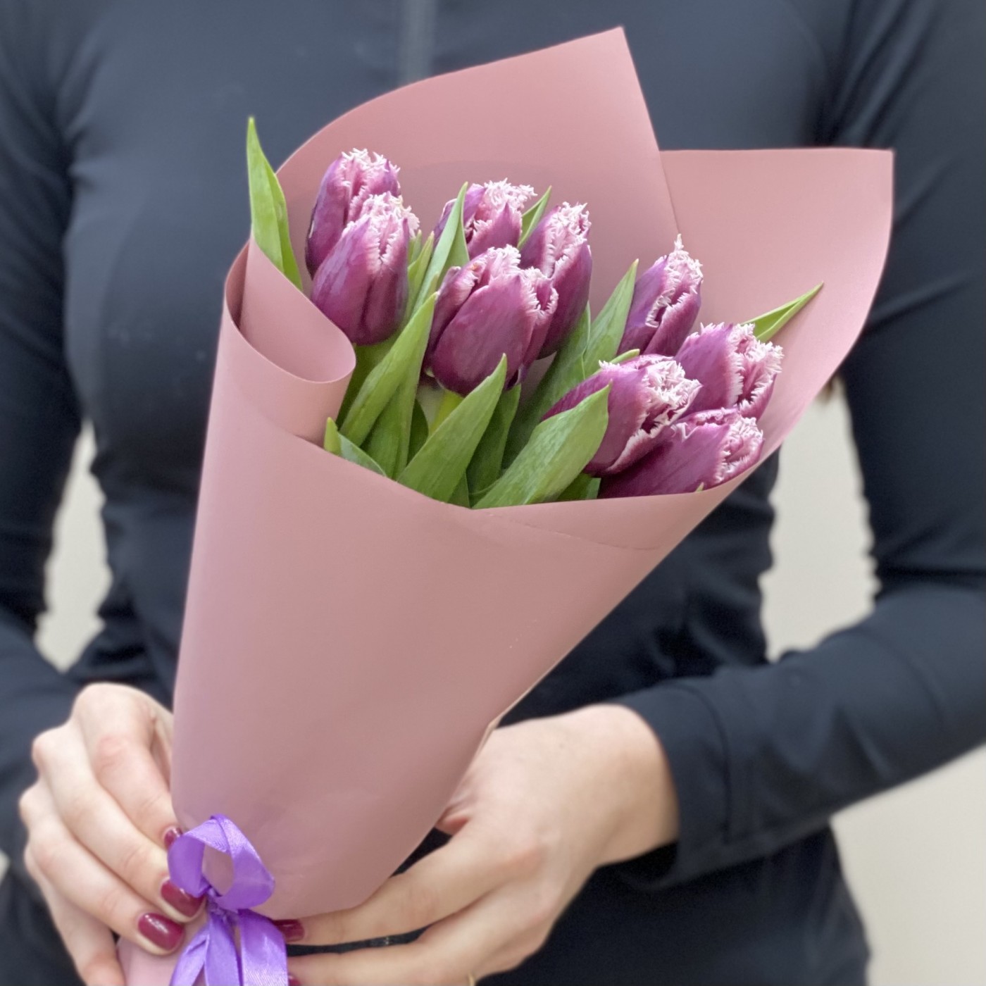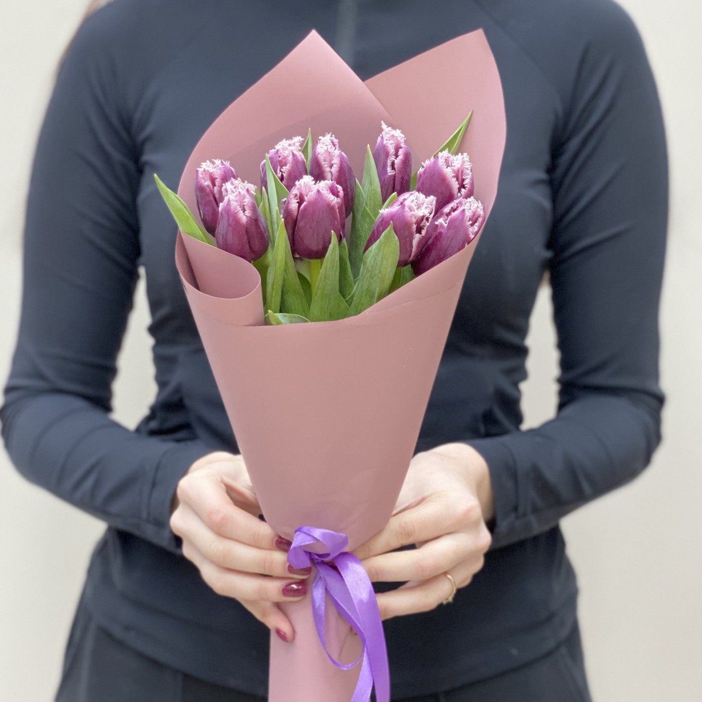 Мини букет из махровых тюльпанов фиолетового цвета в стильной упаковке. Прекрасный корпоративный вариант подарка на 8 марта.