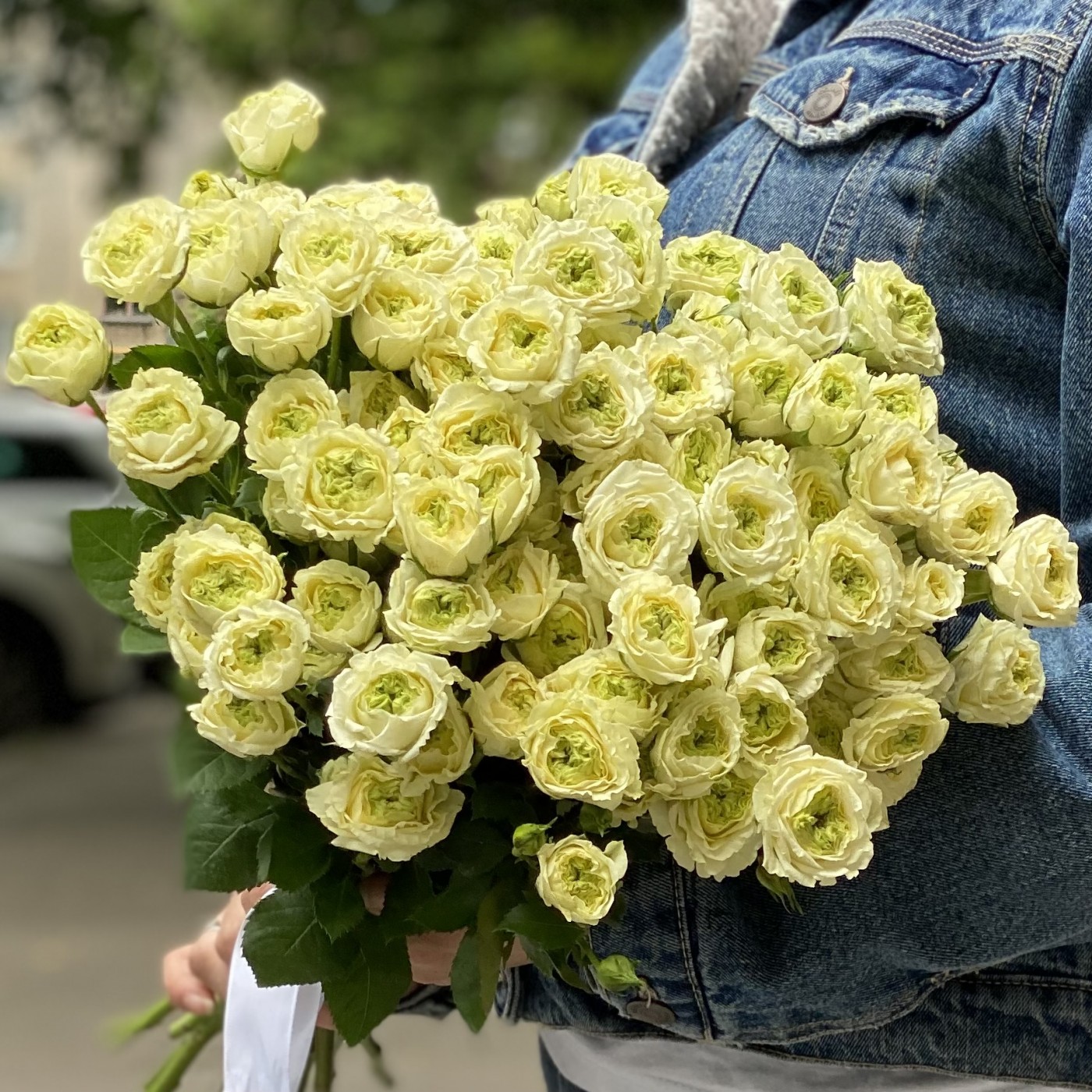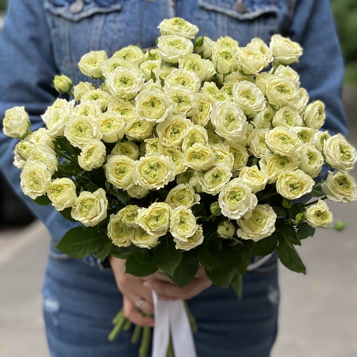 Нежные и ароматные пионовидные розы сорта Эмеральд Квин тонкого зеленовато-белого оттенка, само воплощение свежести и стиля. Этот сорт кустовых роз впечатляет своей красотой и чарующей хрупкостью легких и плотных цветочных головок. Такой букет можно подарить на день рождения, свидание или просто преподнести как приятный комплимент. На фото представлена 51 роза.