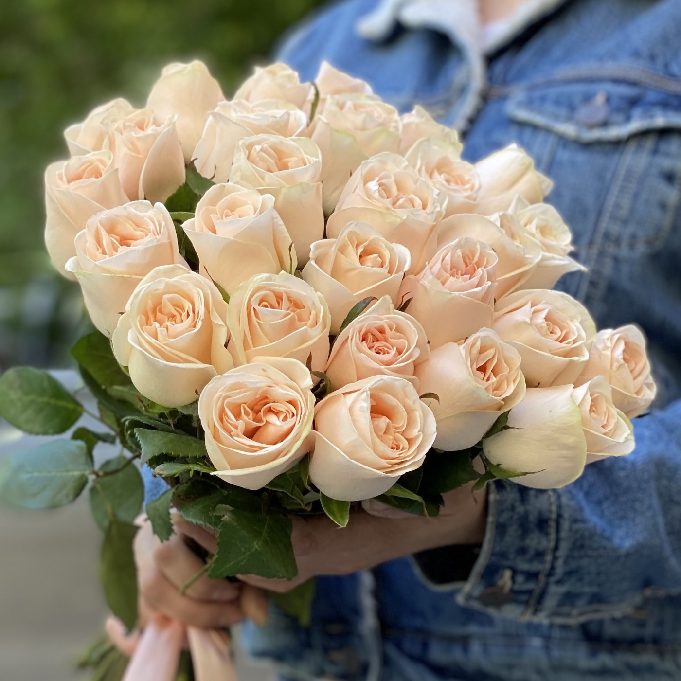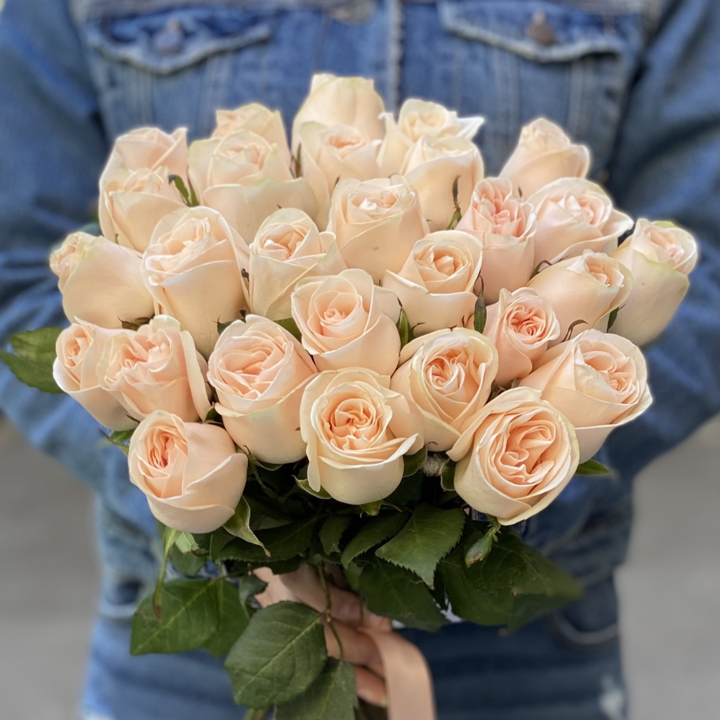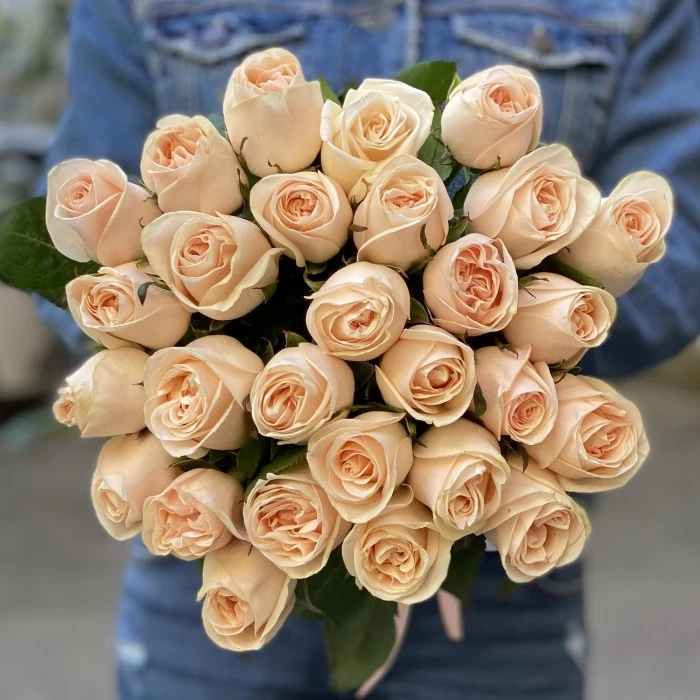 На фото представлено 25 роз сорта Модести. Нежный кремовый оттенок цветов расскажет о ваших самых теплых чувствах и бесконечном восхищении! Деликатный пастельный окрас лепестков делает букет уместным в самом изысканном интерьере, в руках юной леди и взрослой красавицы.