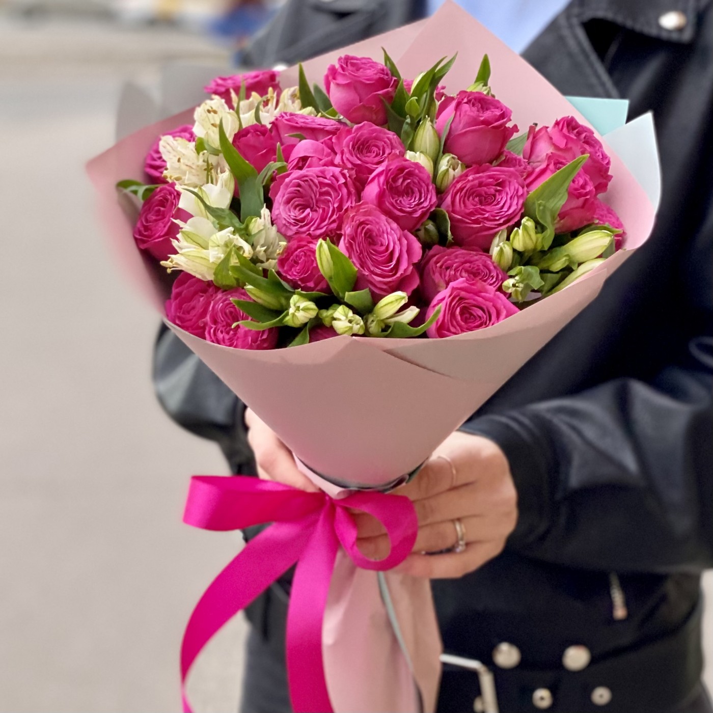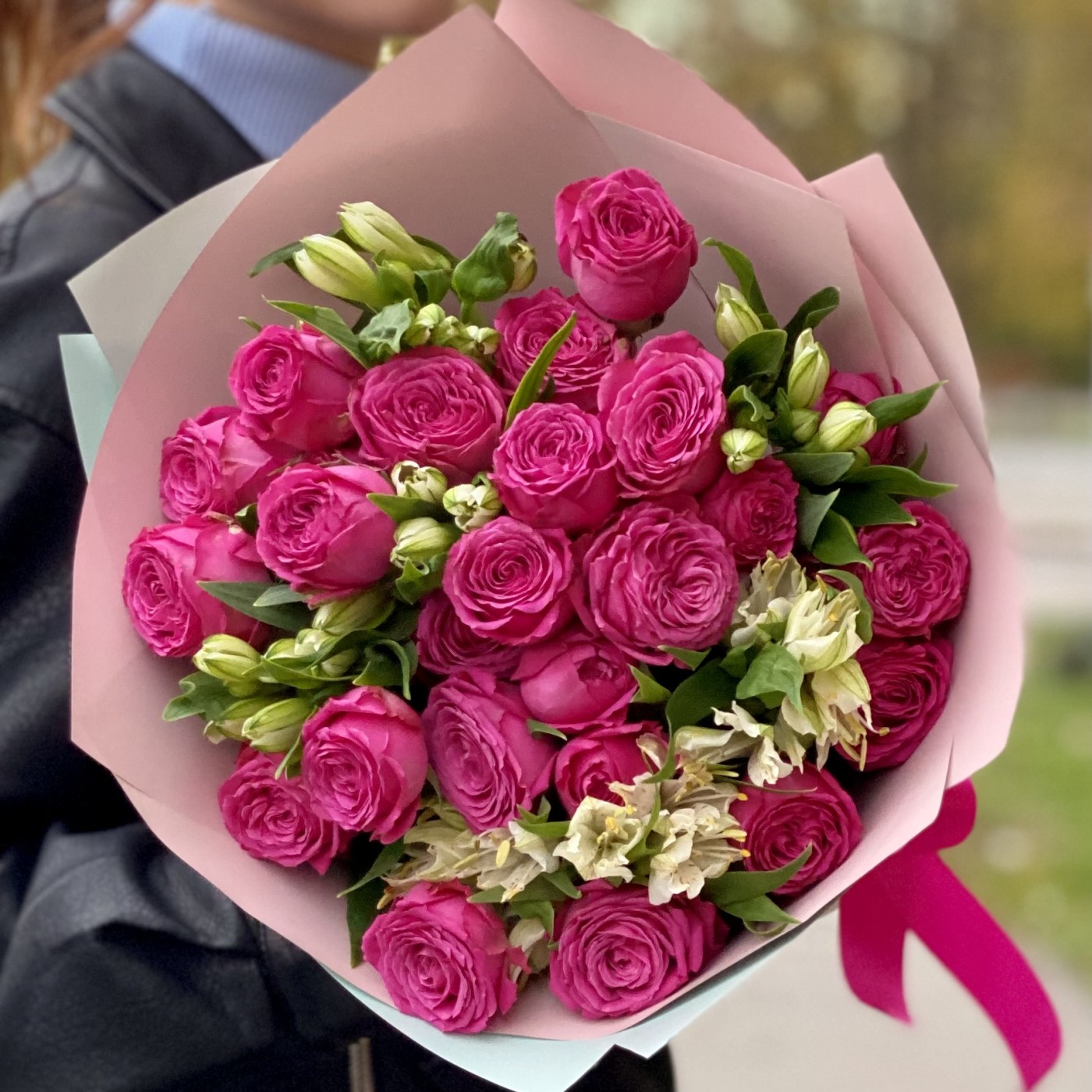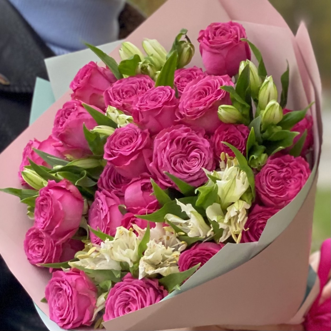 Пионовидные розы сорта Classic Sensation вместе с изящной белой альстромерией. Великолепный розовый букет, наполненный цветом и ароматом свежесрезанных растений украсит ваш праздник или важную встречу с любимым человеком.