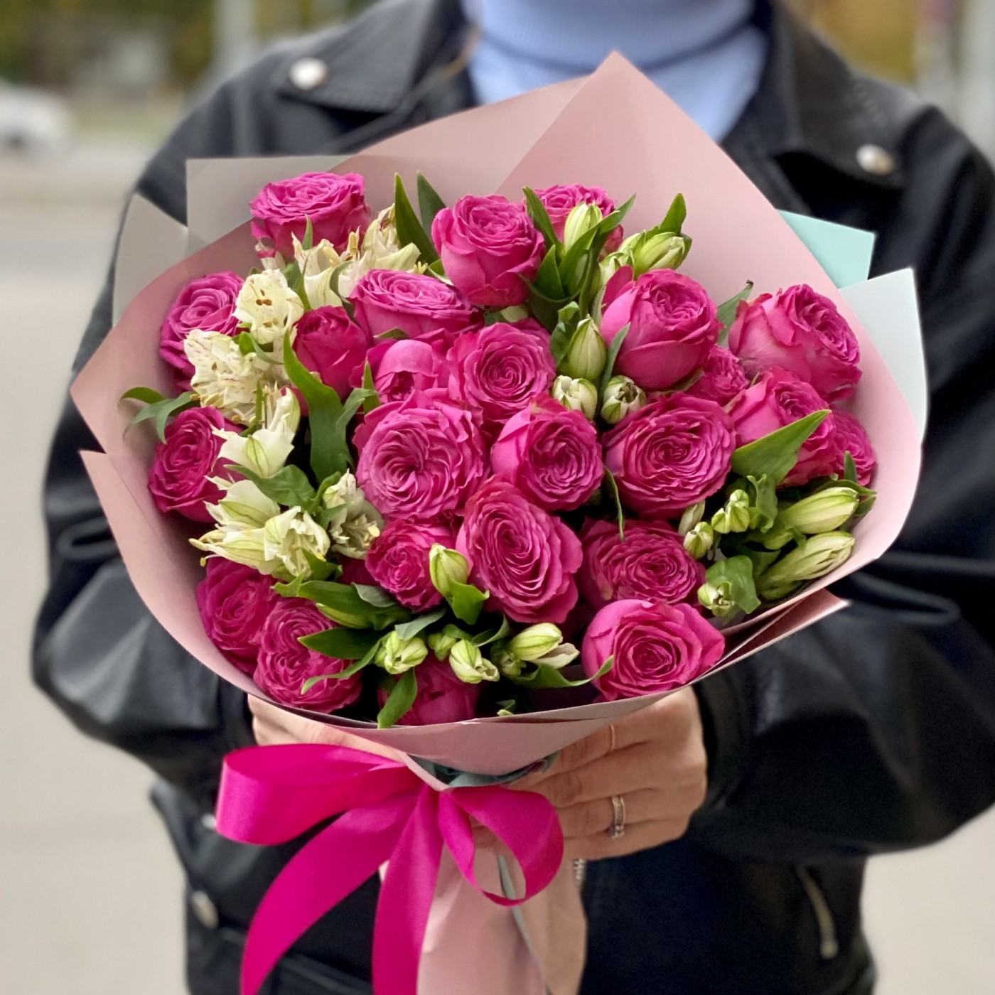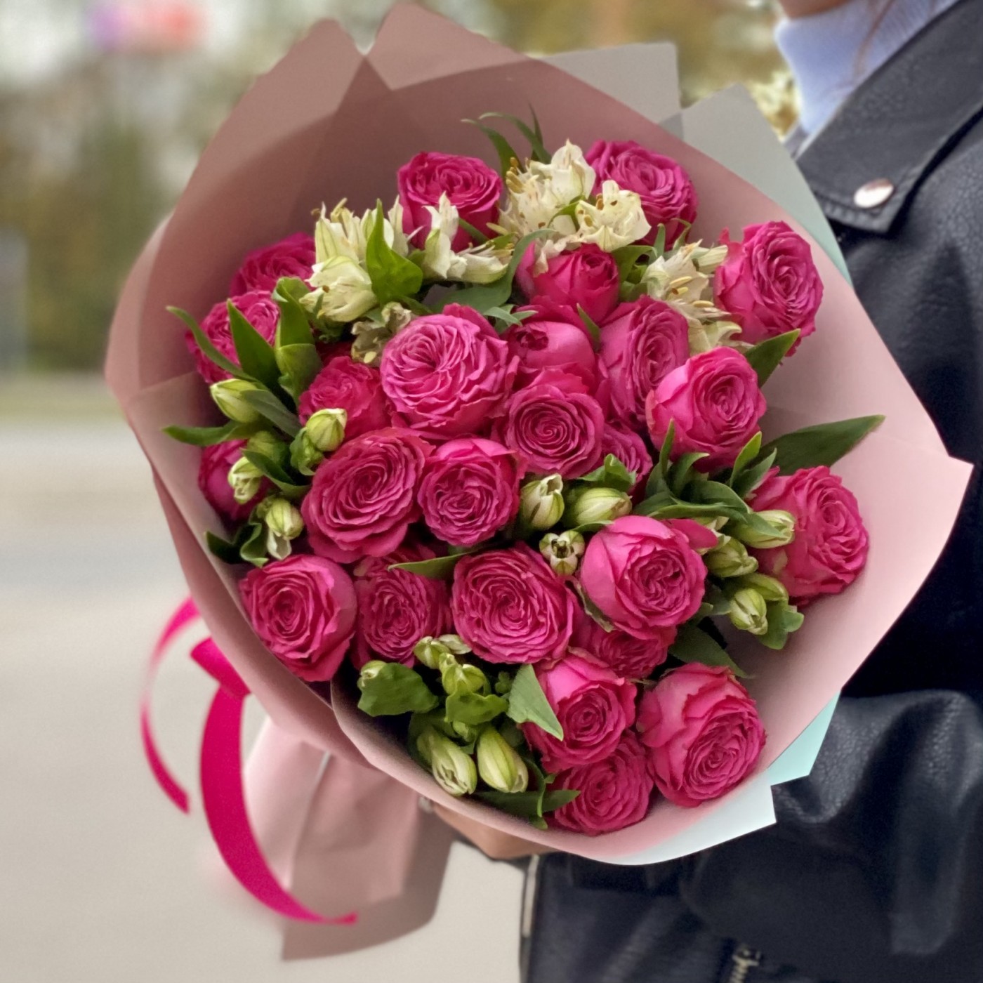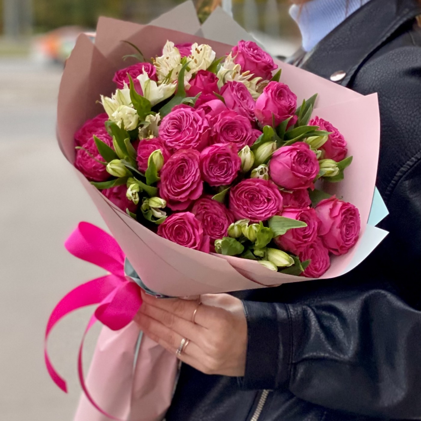 Пионовидные розы сорта Classic Sensation вместе с изящной белой альстромерией. Великолепный розовый букет, наполненный цветом и ароматом свежесрезанных растений украсит ваш праздник или важную встречу с любимым человеком.