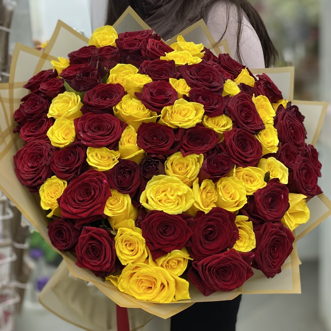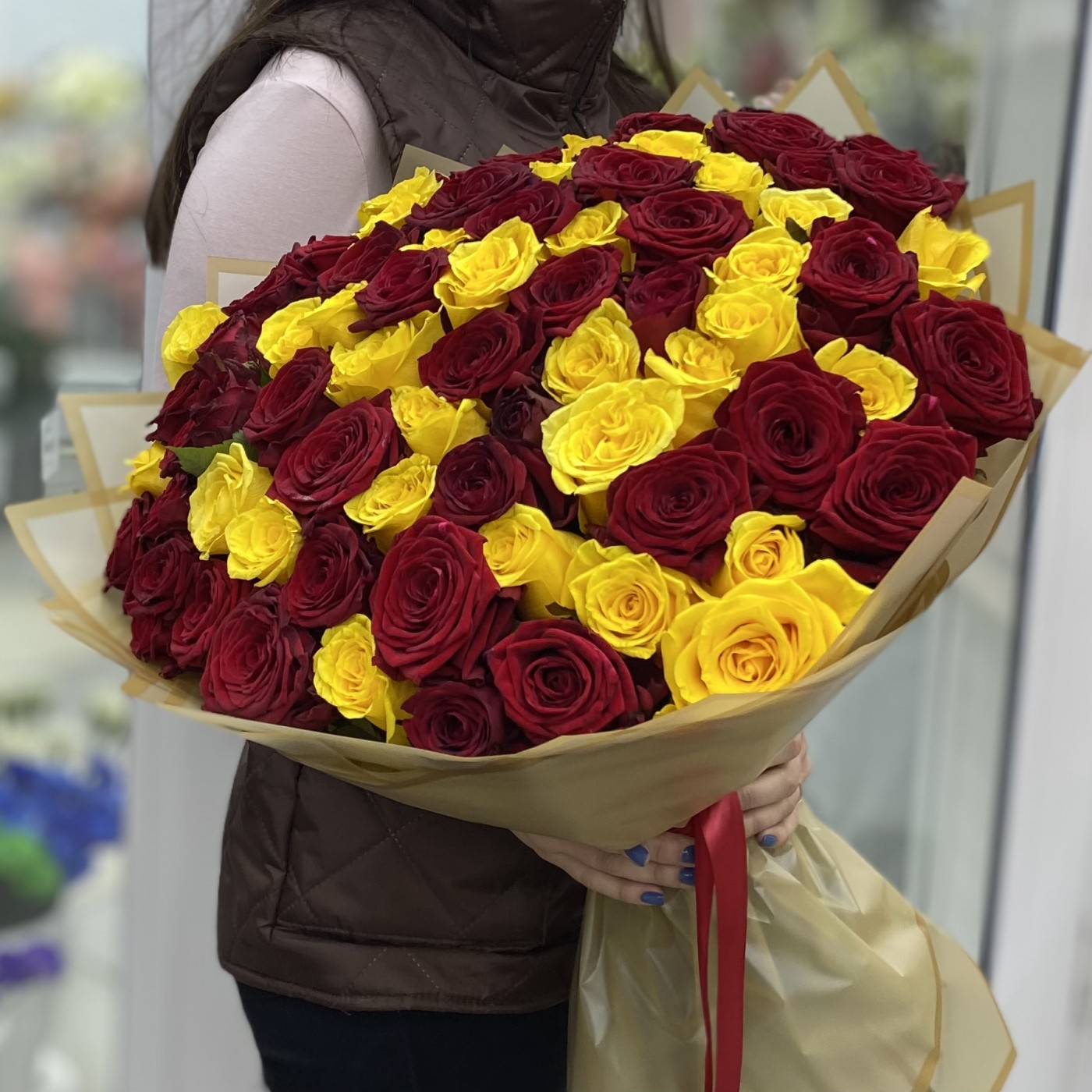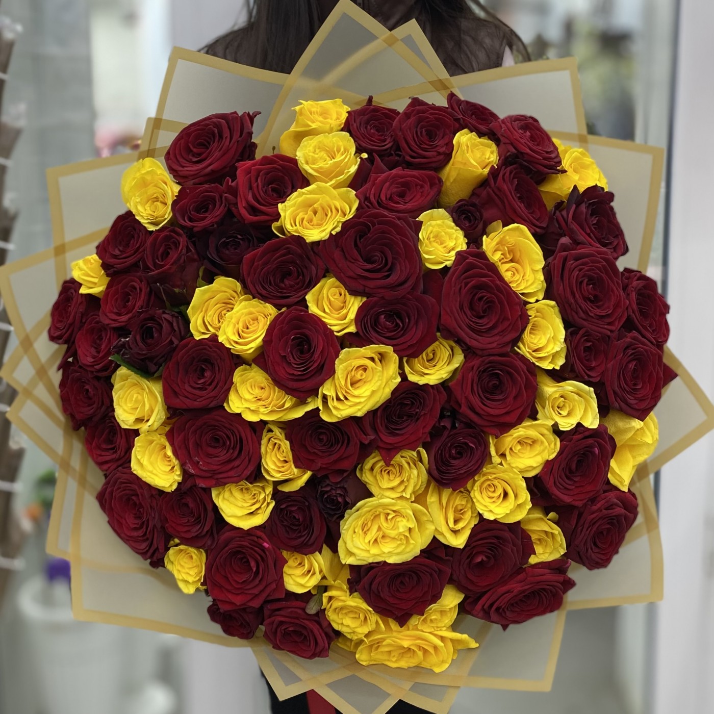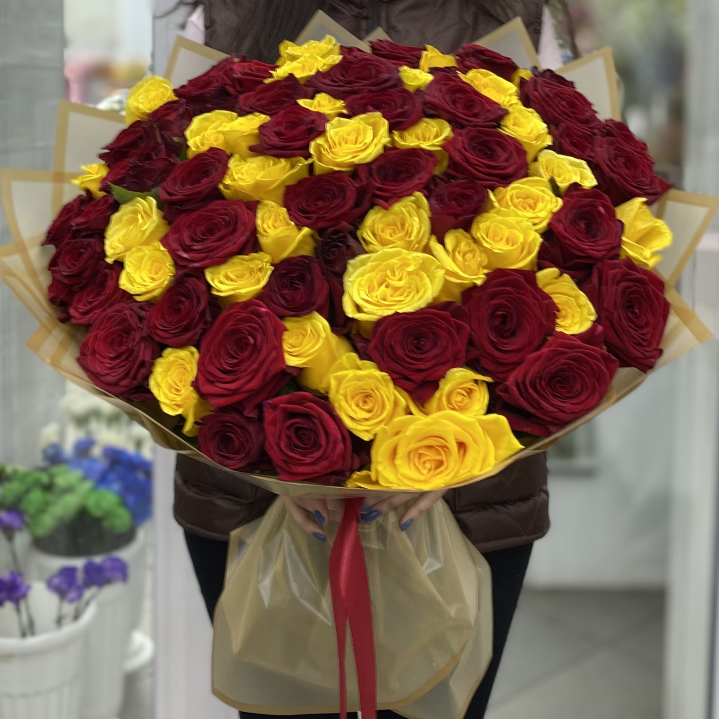 Букет из розы разных сортов красно-желтого цвета. Большой, яркий и презентабельный букет для праздничных мероприятий.