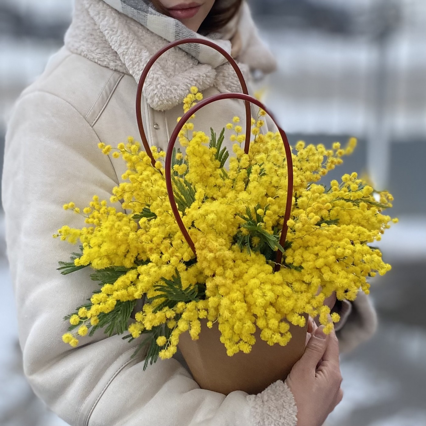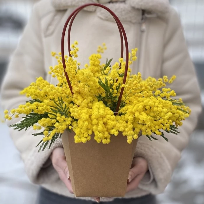 Солнечная и весенняя композиция из мимозы в крафтовой сумочке. Подарите своим дамам немного тепла и хорошего весеннего настроение.