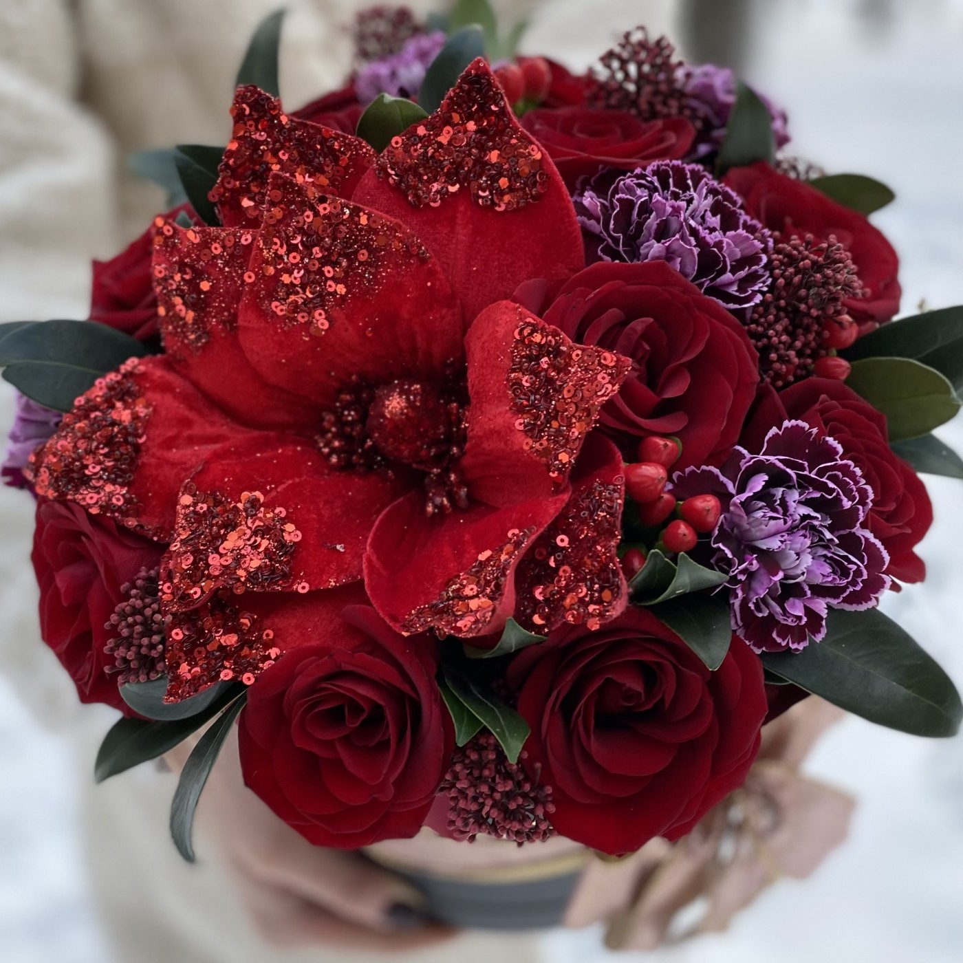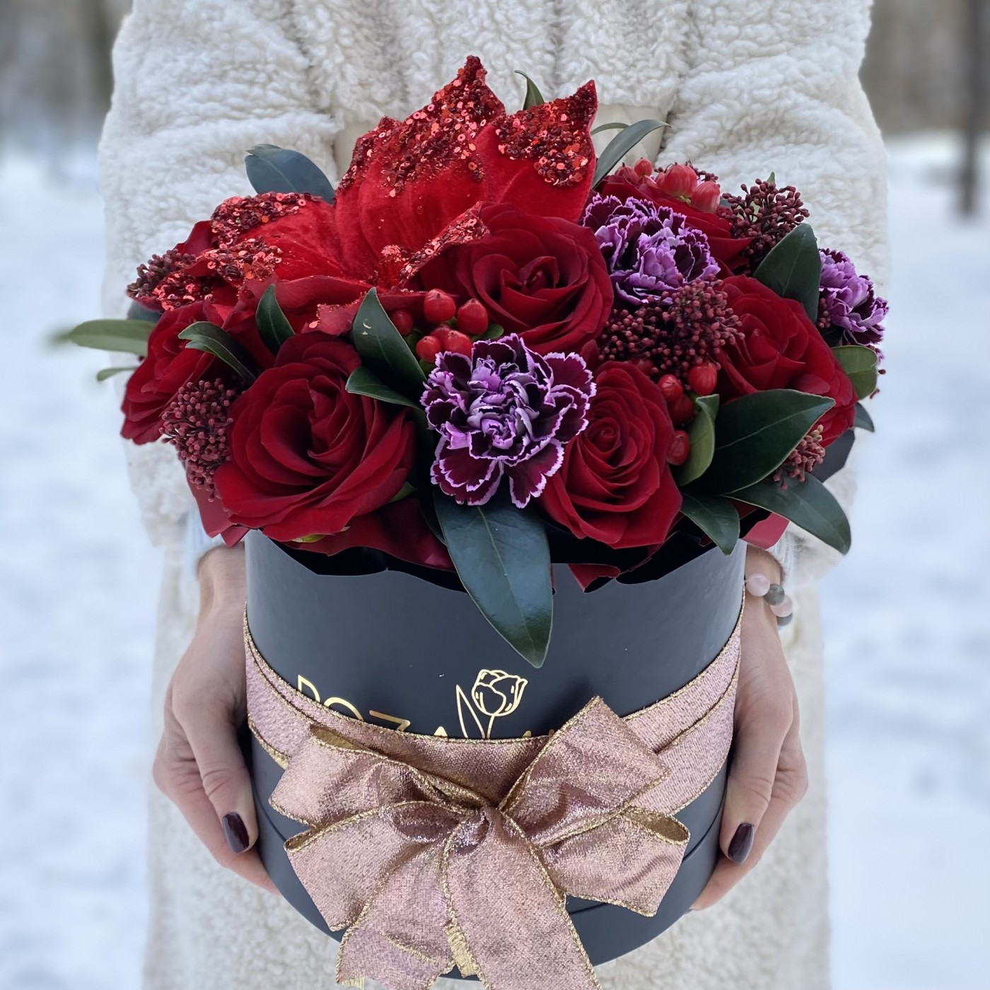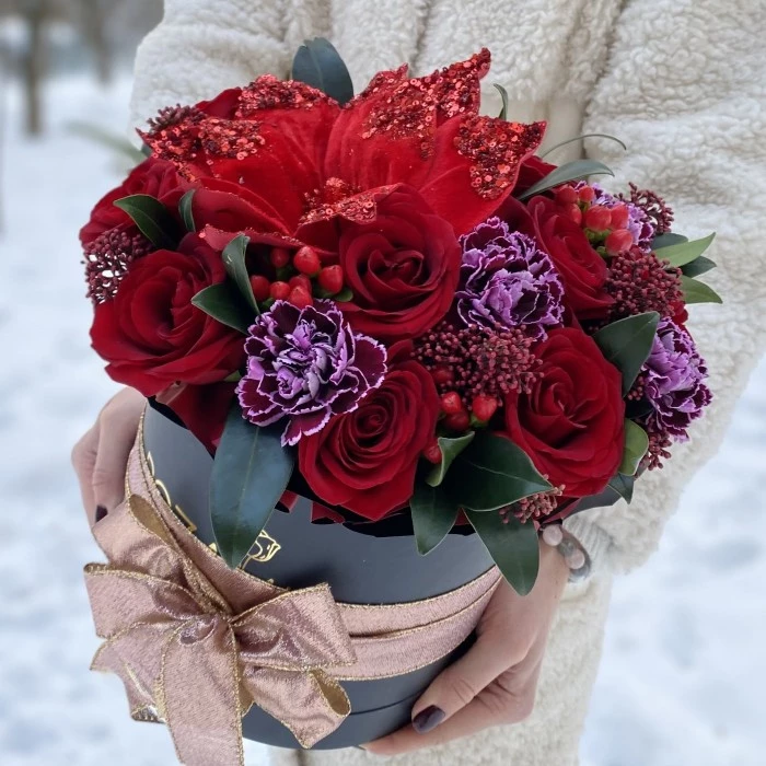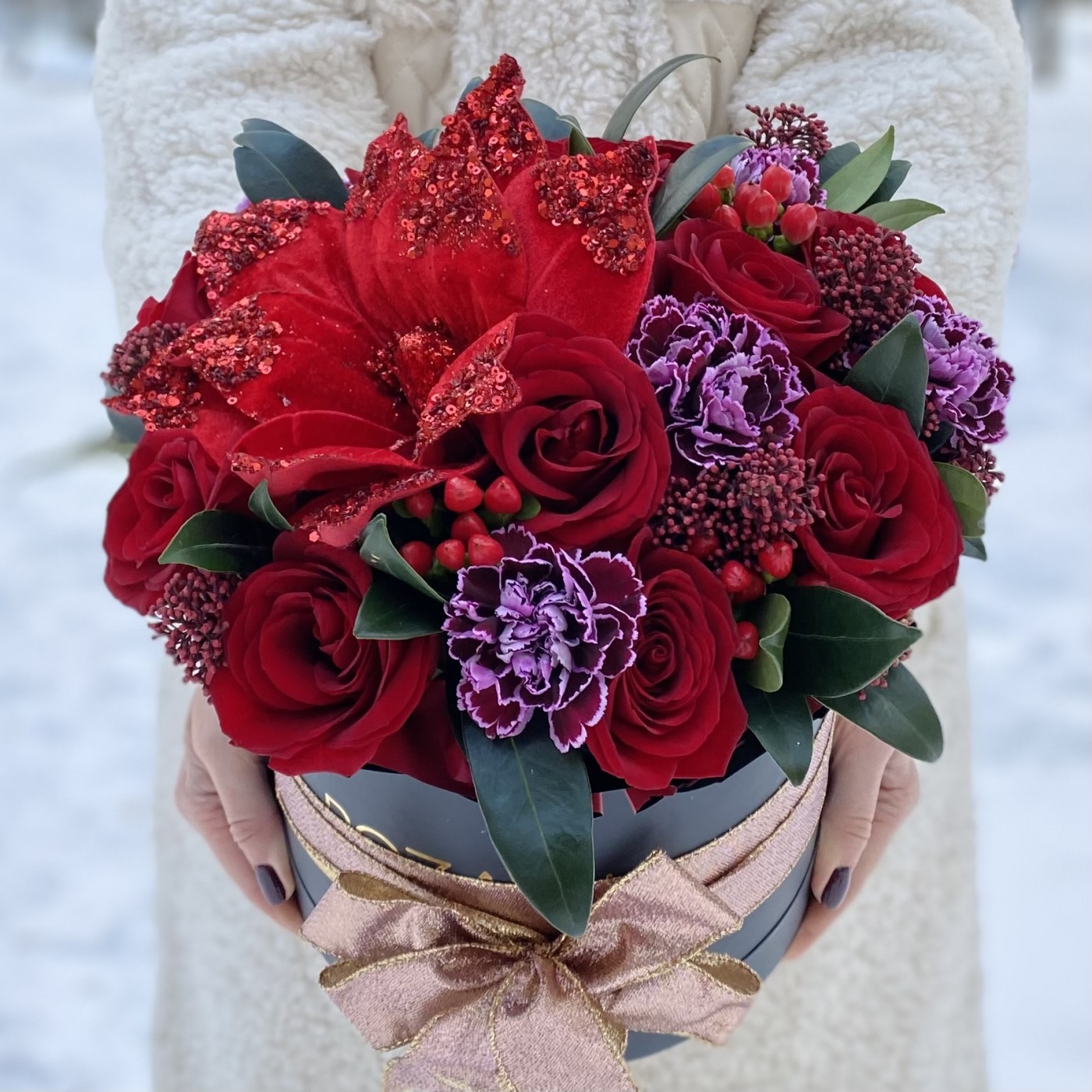диантусами и большим цветком пуансеттии из велюра со стразами. Коробка в
