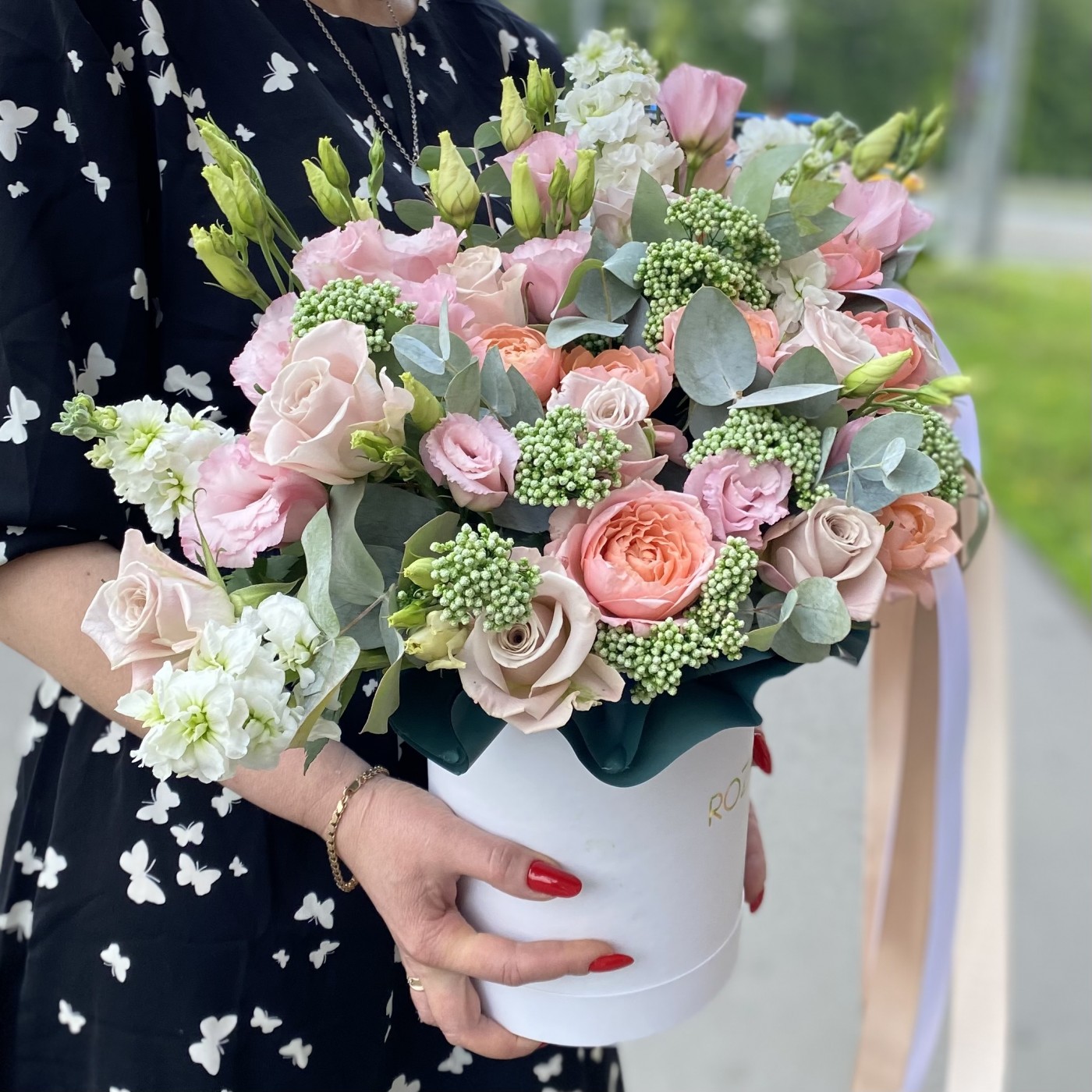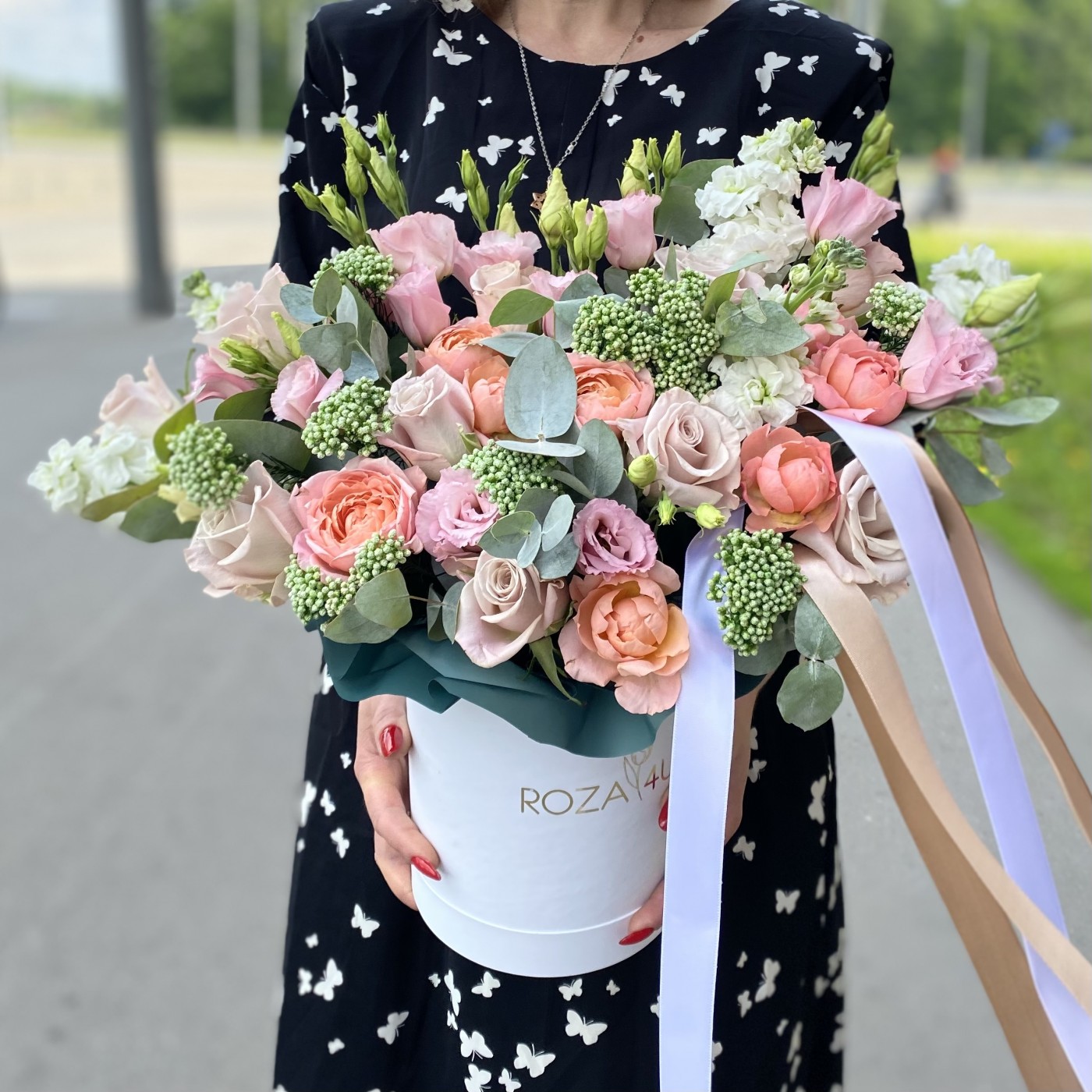 Нежная и стильная коробка из разных роз и зелени. В состав входят розы, кустовые пионовидные розы, эустома, декоративная зелень. Такая коробка может подойти в качестве подарка на день рождения, свадьбу или просто как красивый комплимент.