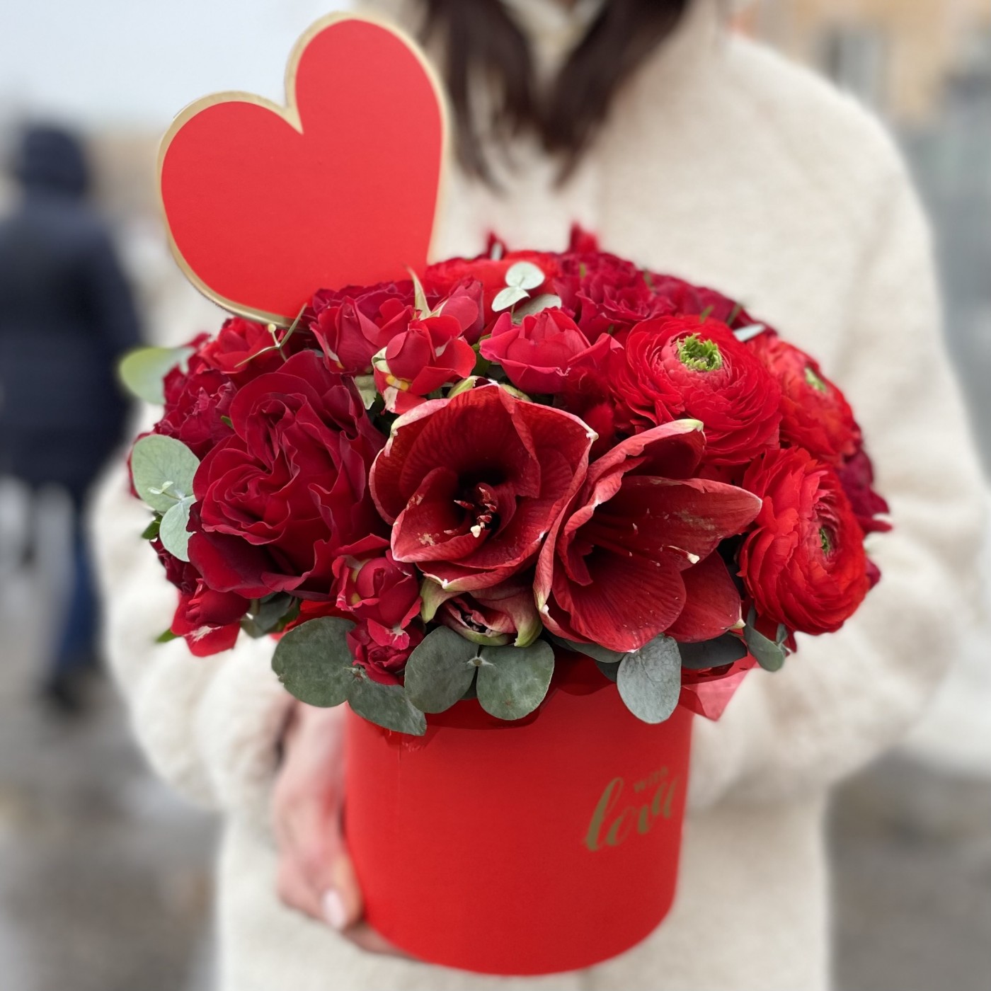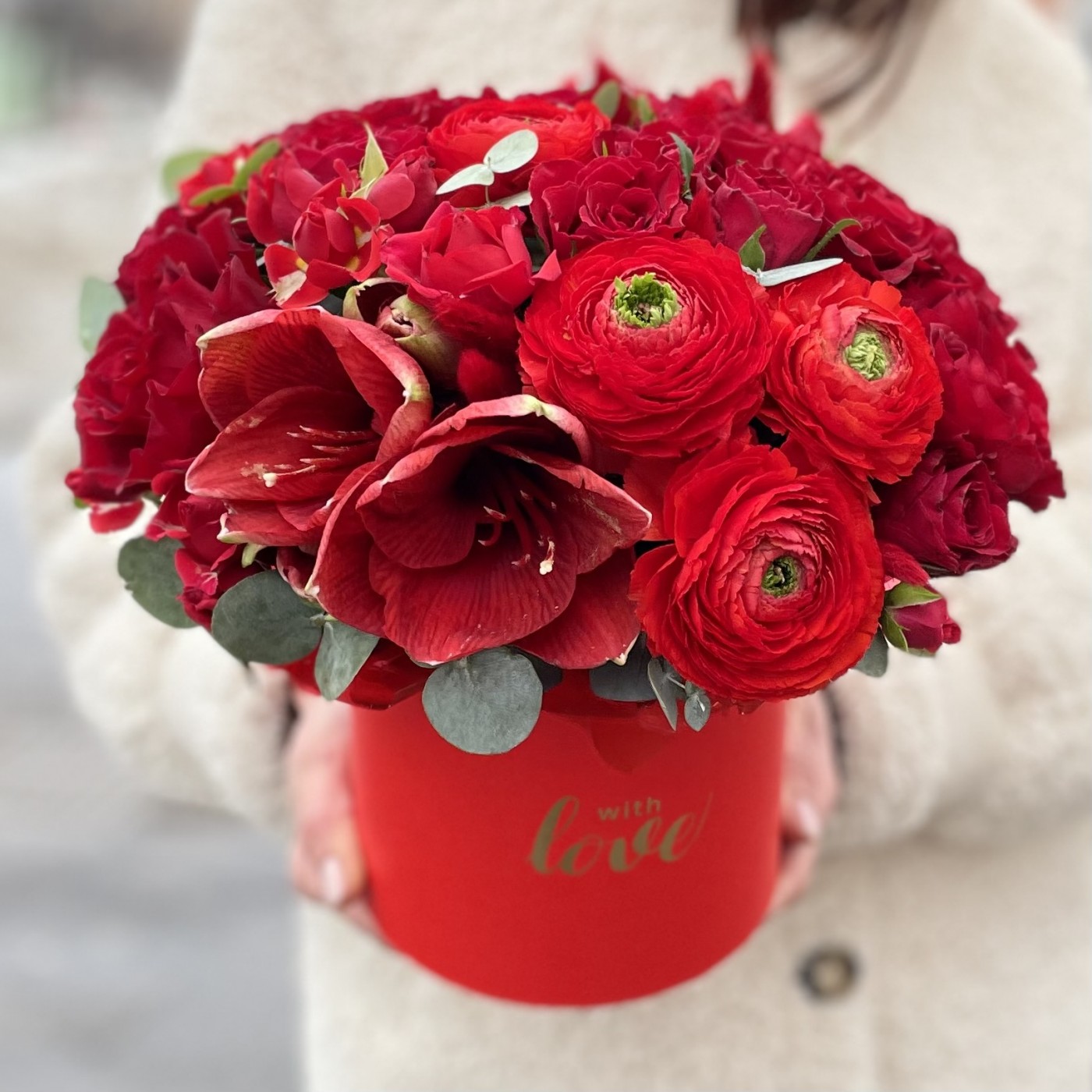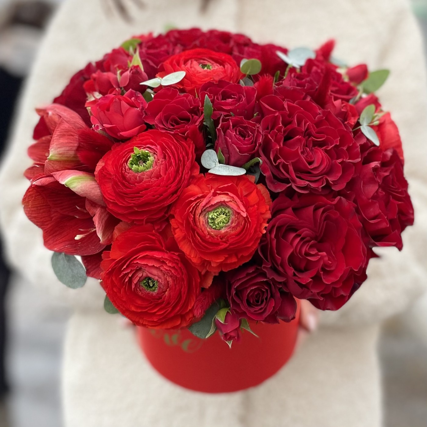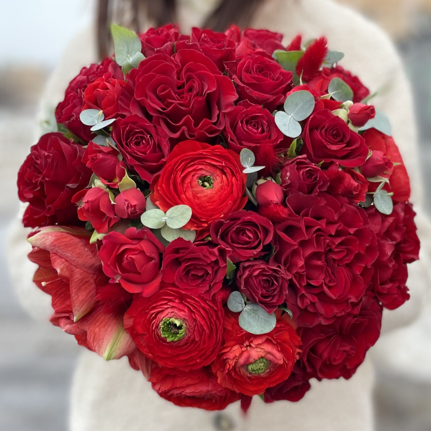 Авторская композиция в благородных и глубоких красных и бордовых оттенках. Эта палитра отличается особой чувственностью и передает многое даже без слов. Красный цвет - общепризнанный символ любви и страсти, он говорит о чувствах напрямую, а более сдержанный бордовый оттеняет его и делает букет элегантнее.