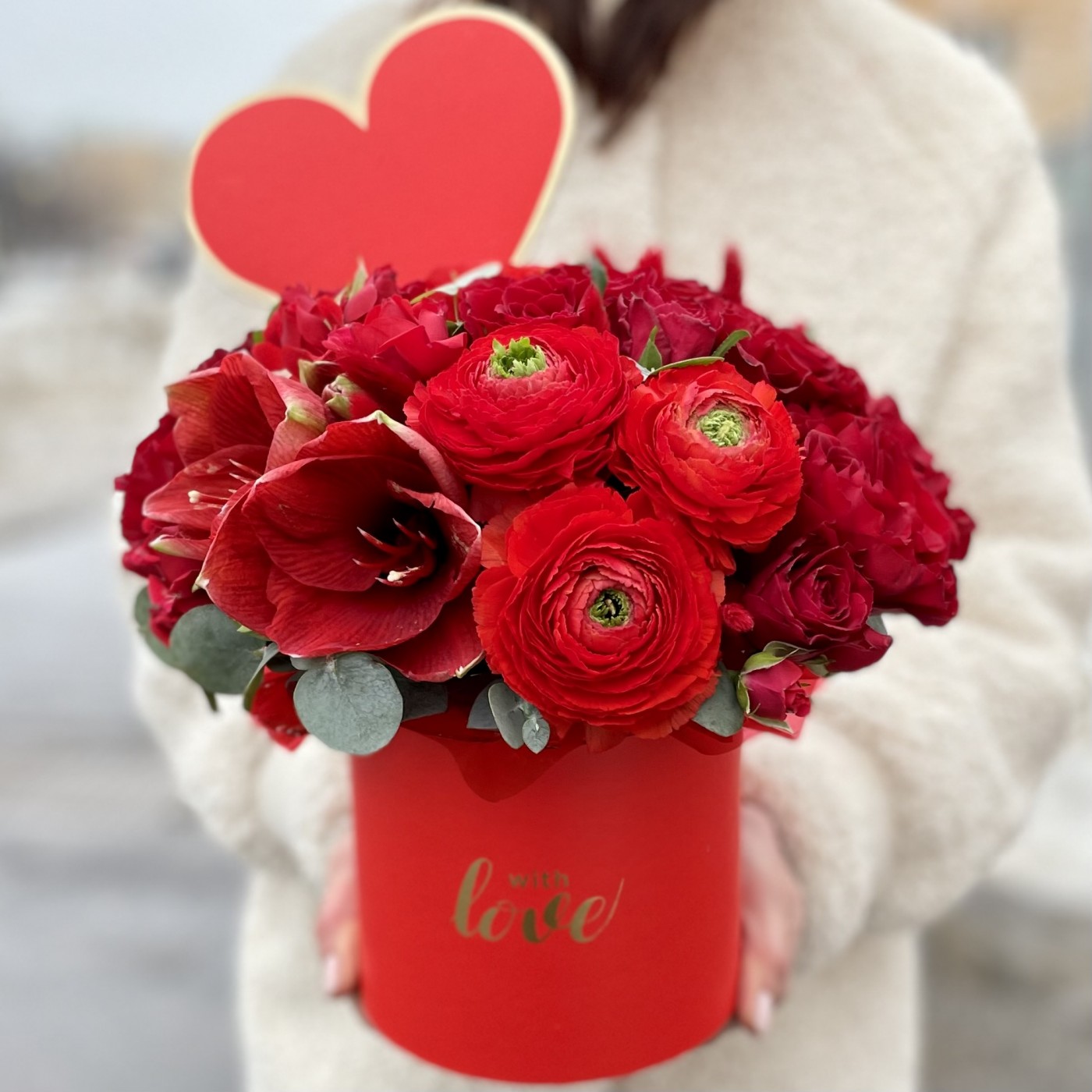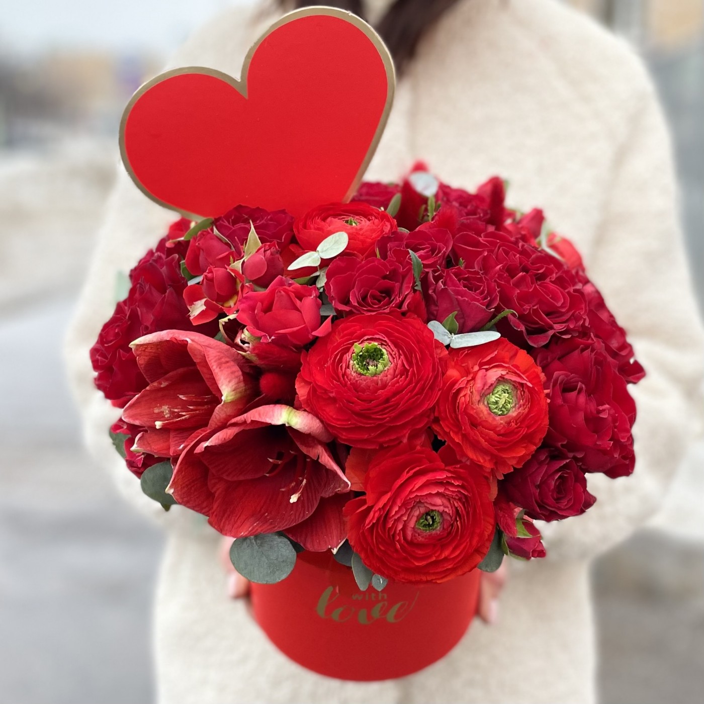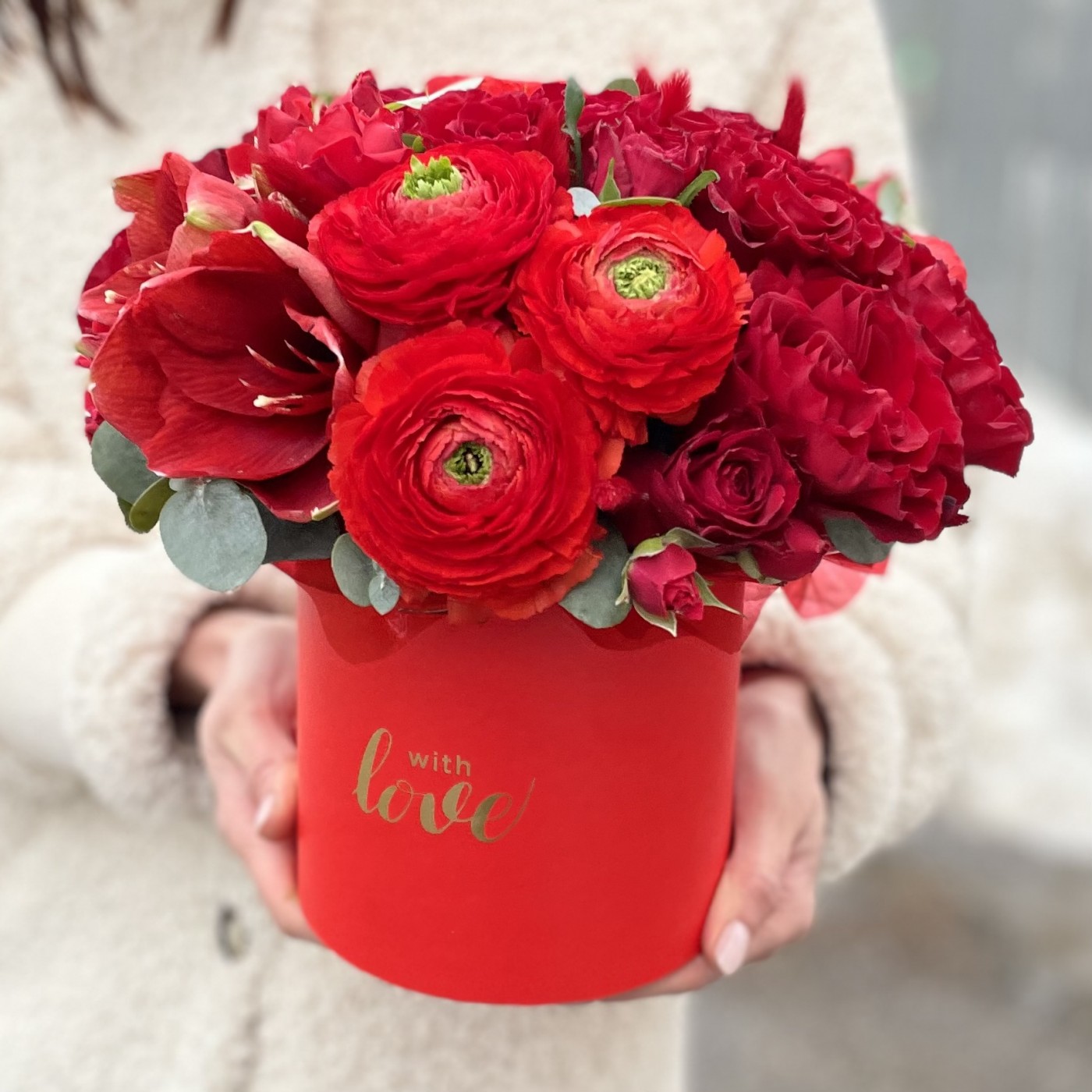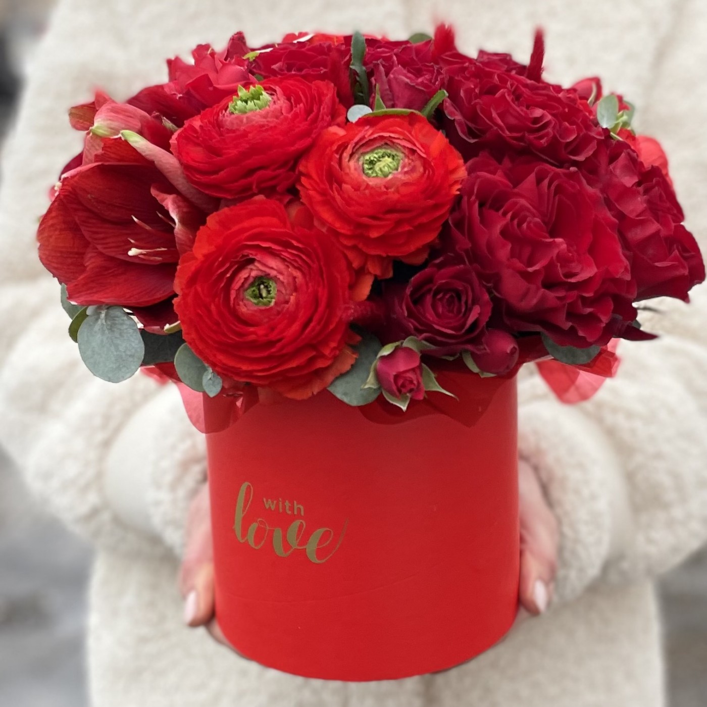 Авторская композиция в благородных и глубоких красных и бордовых оттенках. Эта палитра отличается особой чувственностью и передает многое даже без слов. Красный цвет - общепризнанный символ любви и страсти, он говорит о чувствах напрямую, а более сдержанный бордовый оттеняет его и делает букет элегантнее.