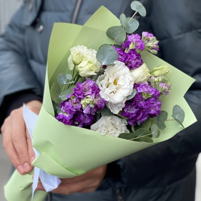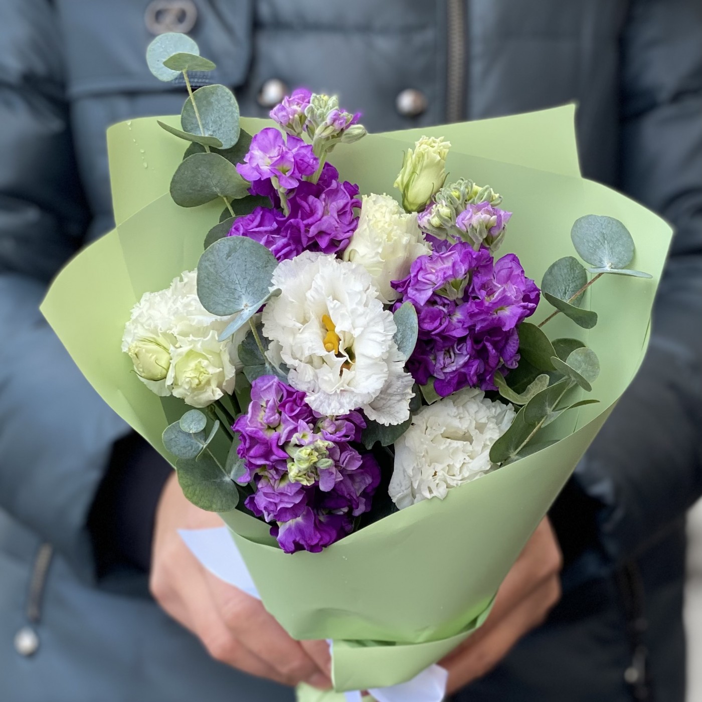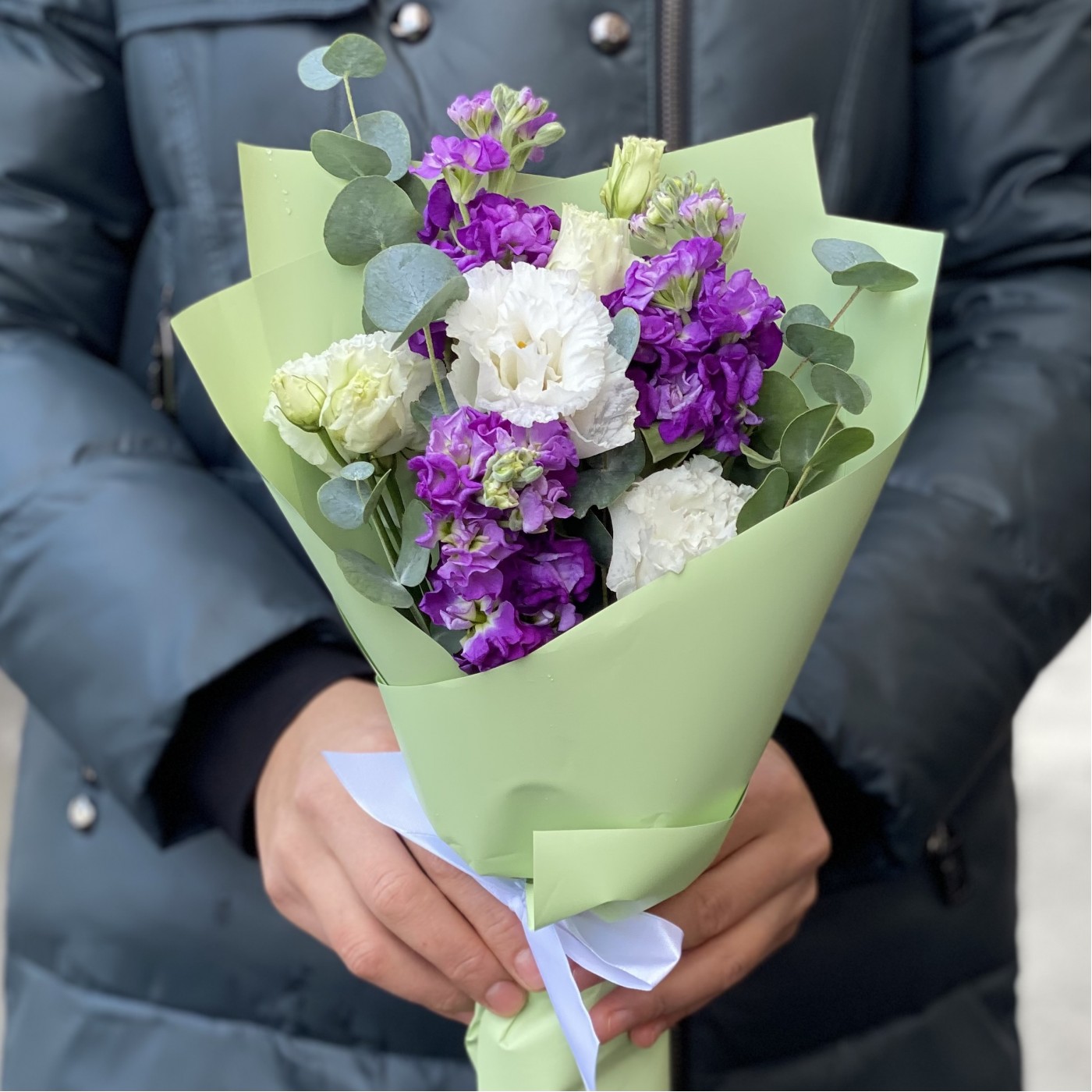 Воздушный, компактный и обворожительный дуэт маттиолы и эустомы с веточкой эвкалипта - нескучный вариант для комплимента или корпоративного поздравления.