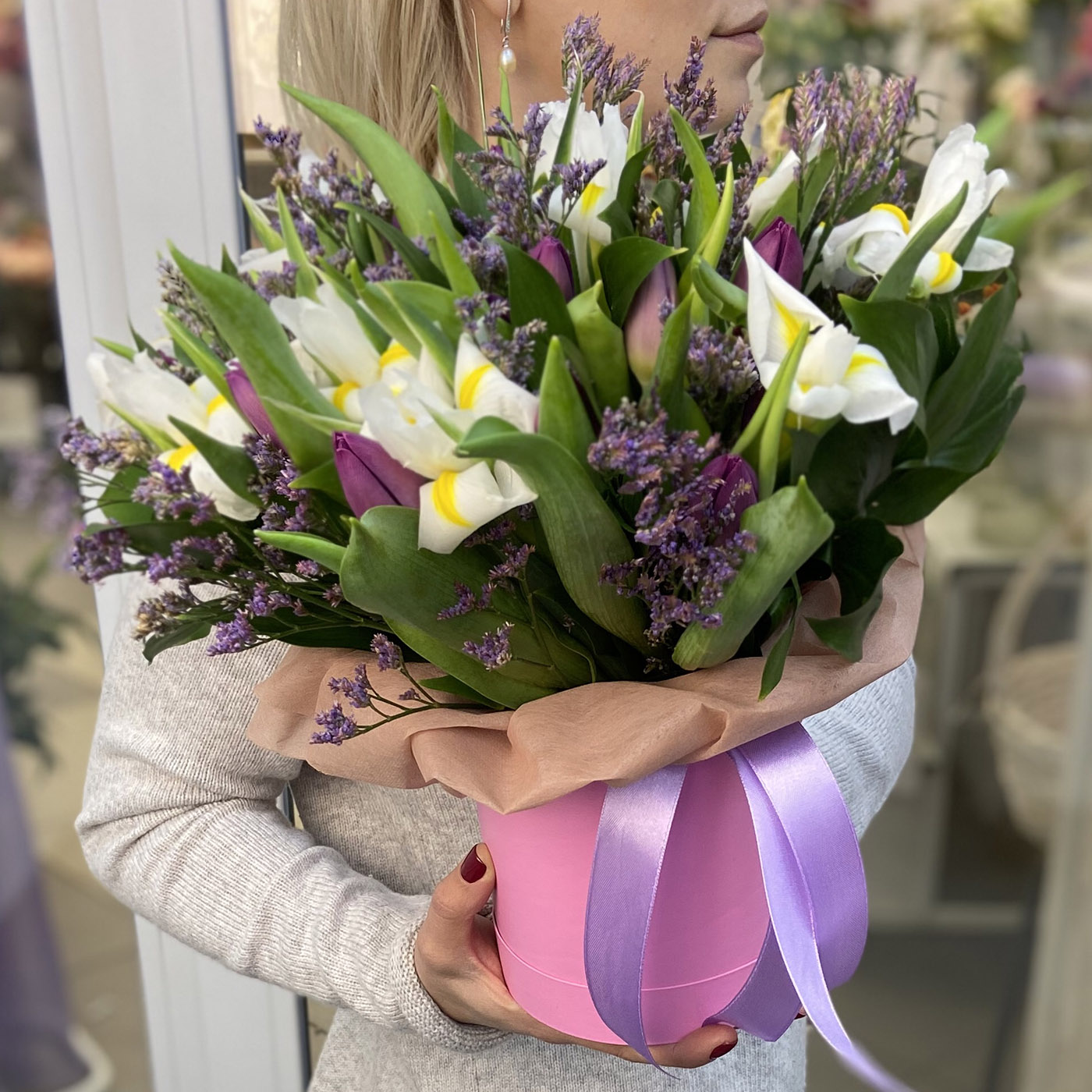 Тюльпаны и белые ирисы в шляпной коробке