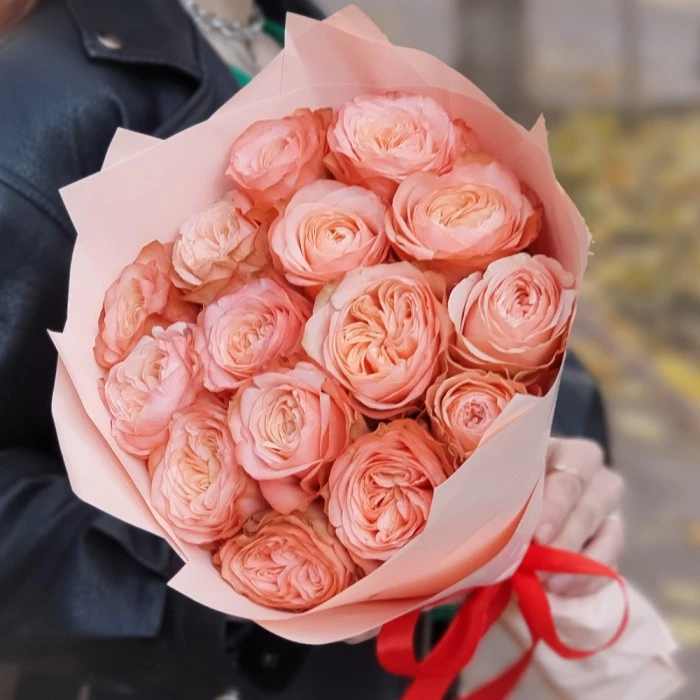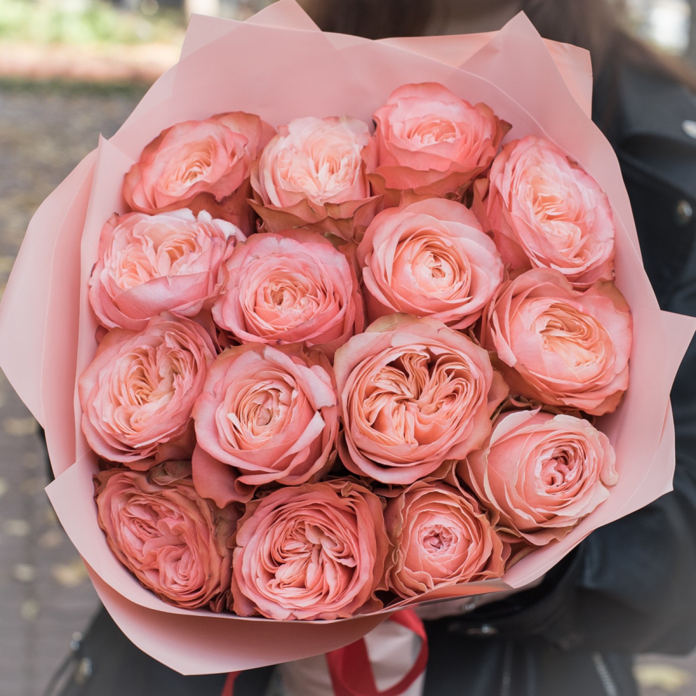 15 пионовидных роз Кахала — это элегантная цветочная композиция в розово-персиковых оттенках, которая станет прекрасным подарком любом женщине, так как букет выражает самые трепетные и романтичные чувства дарителя.