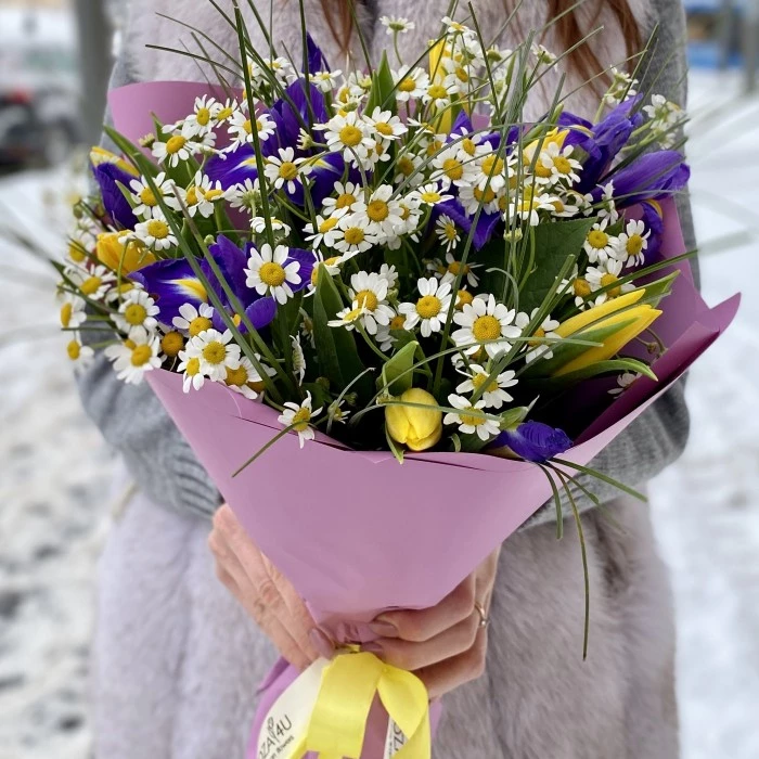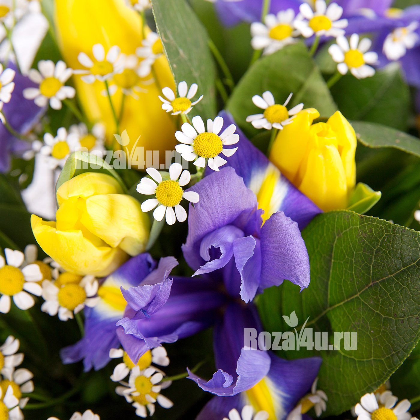 Праздничный недорогой букет на 8 Марта из ярких фиолетовых ирисов и солнечно-желтых тюльпанов станет великолепным подарком и самым приятным комплиментом как для возлюбленной, так и для членов Вашей семьи или друзей. Он напомнит о тёплых весенних днях, первых лучах солнца и великолепии окружающей природы, поднимет настроение и вызовет на лице улыбку даже в самую пасмурную погоду!