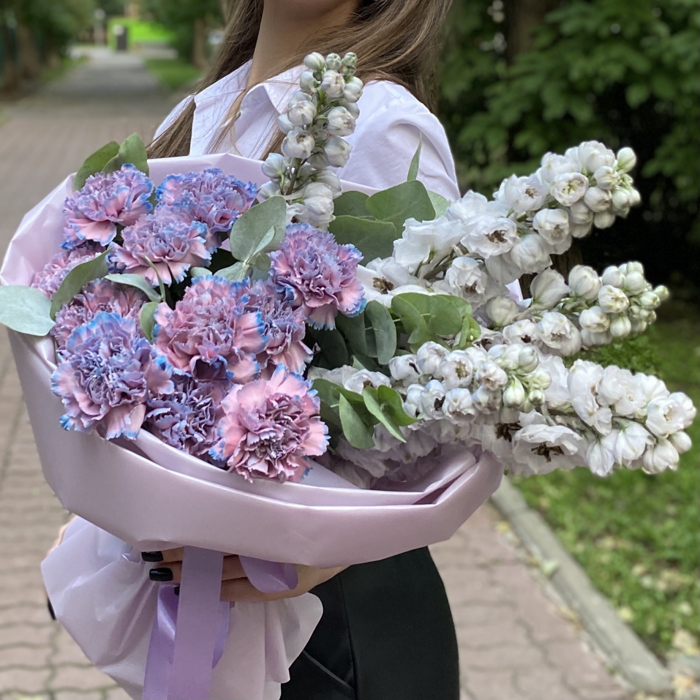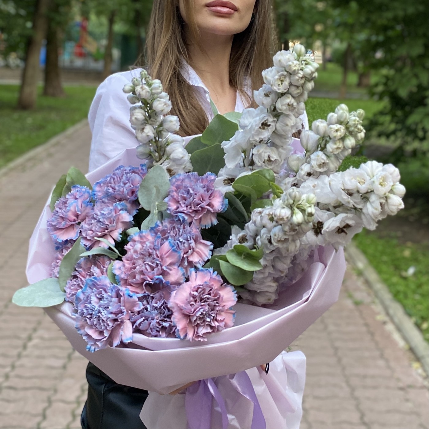 Стильный букет из пышного Дельфиниума и гвоздики сорта Пинк блю Молли. Красивый пудрово-голубой оттенок гвоздик и лавандового дельфиниума влюбляет в себя с первого взгляда!