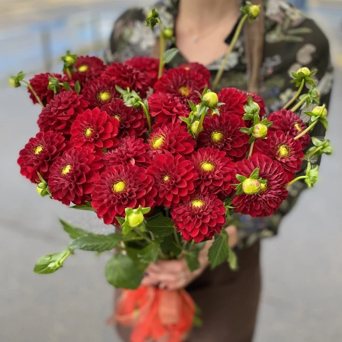 Яркая композиция из георгинов - превосходный подарок к празднику или без повода.