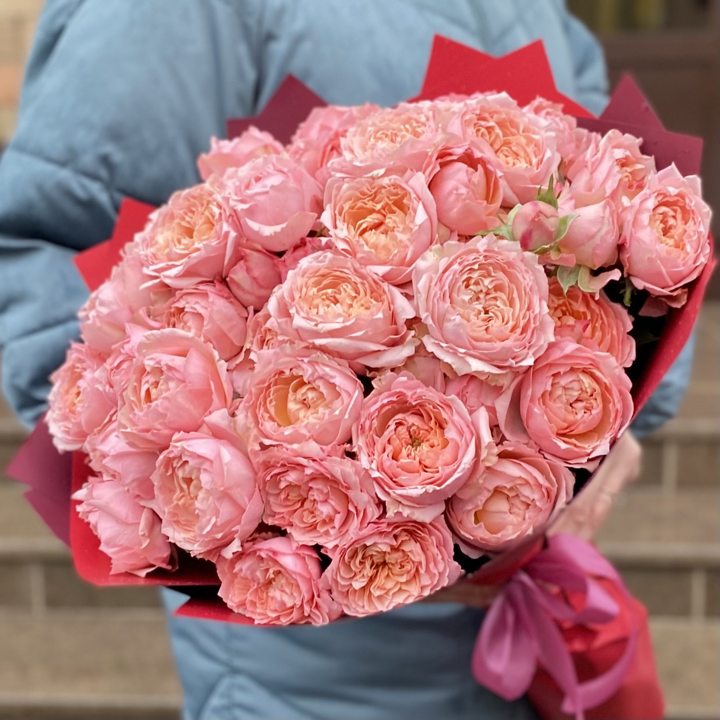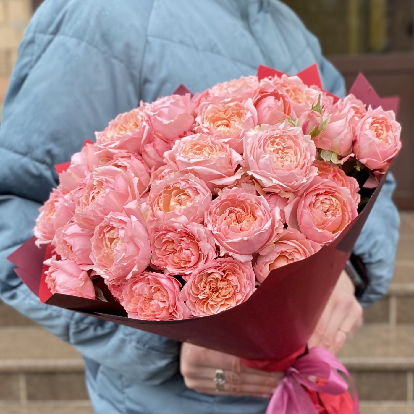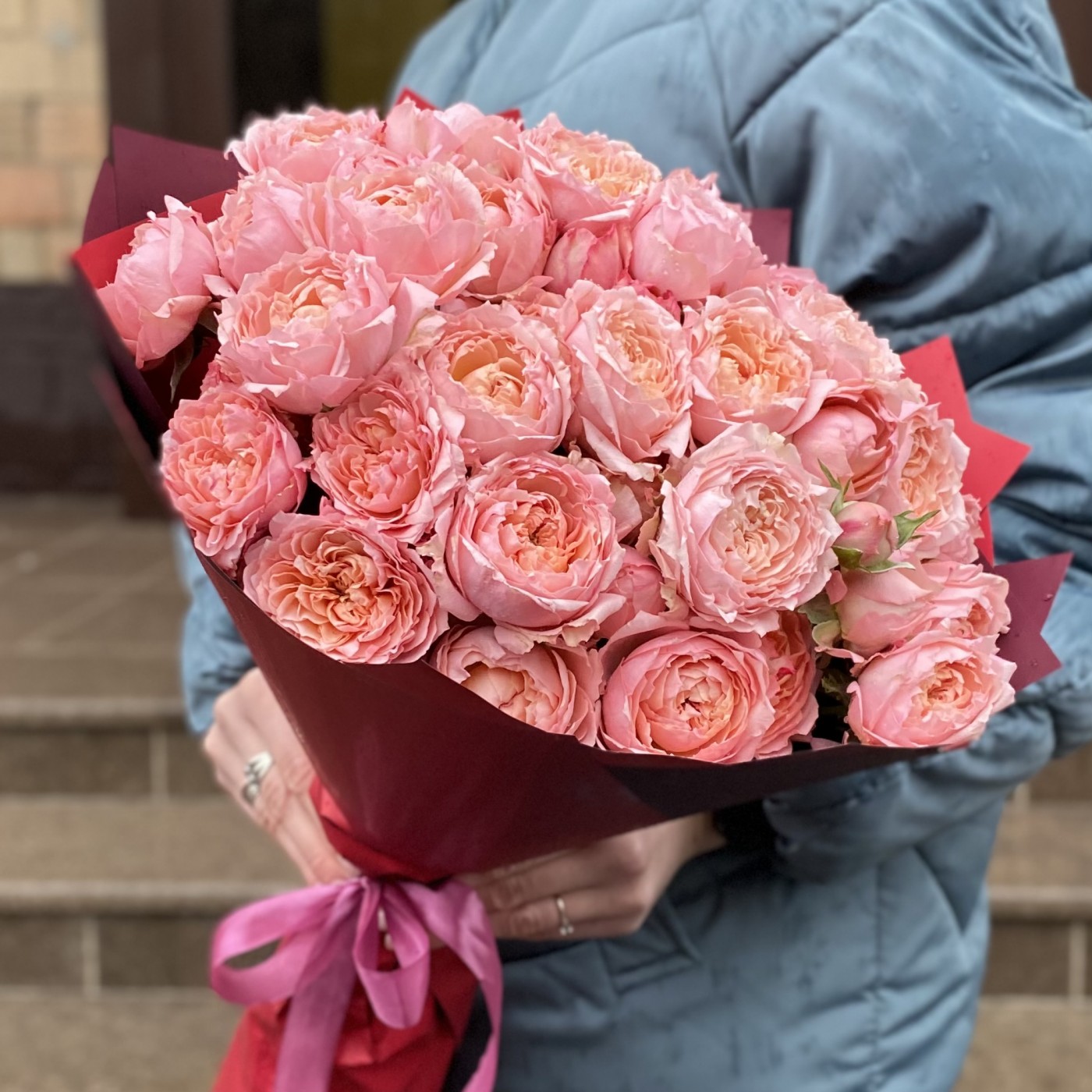 Состав букета: кустовая пионовидная роза Джульетта - 11 шт, упаковка, лента (упаковку можем подобрать любую на Ваш вкус).