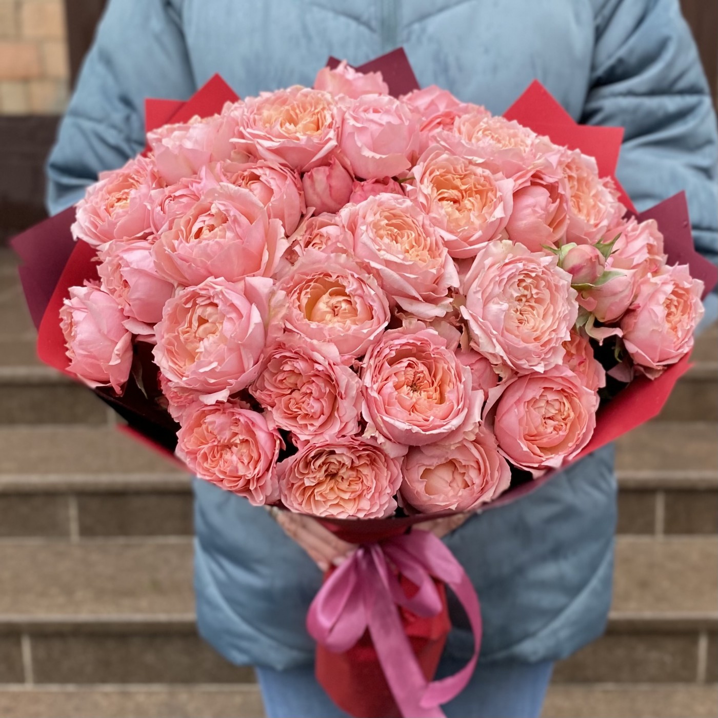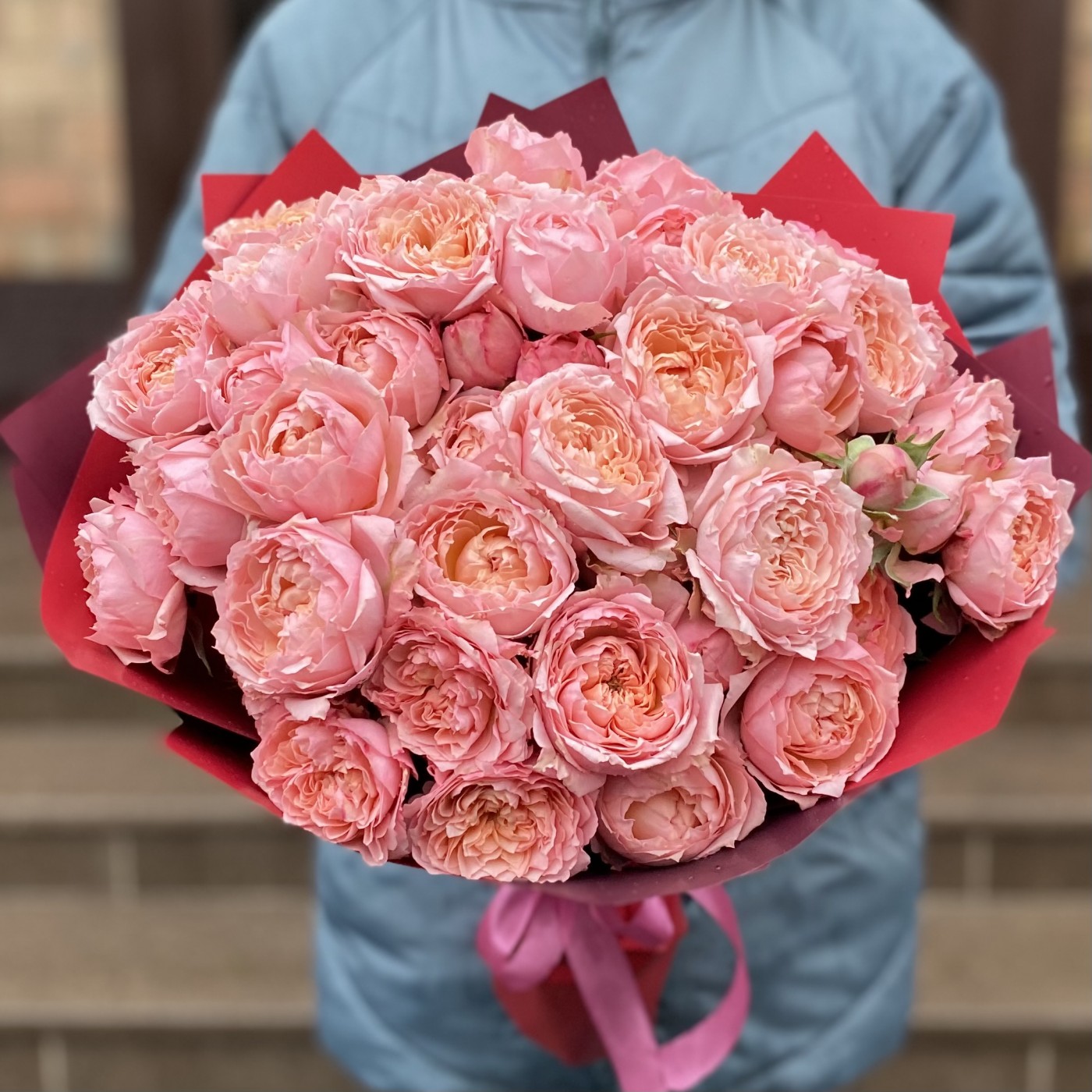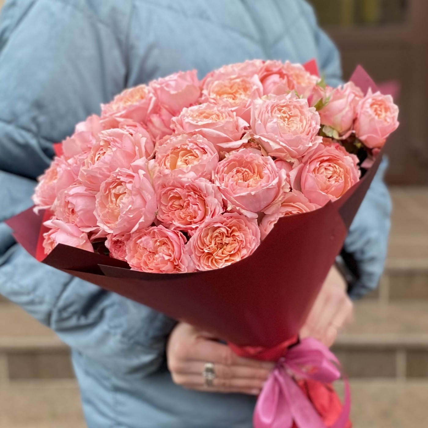 Состав букета: кустовая пионовидная роза Джульетта - 11 шт, упаковка, лента (упаковку можем подобрать любую на Ваш вкус).