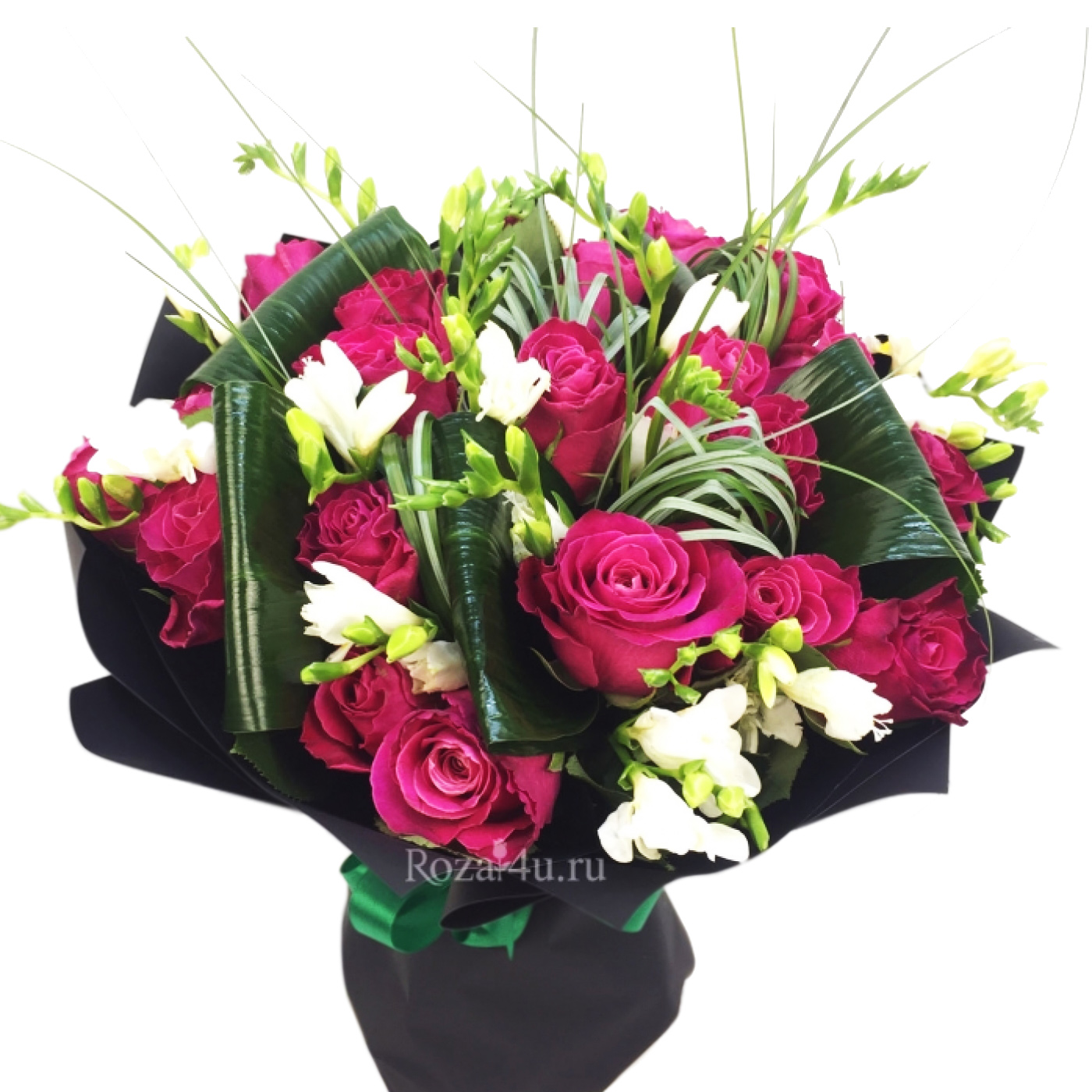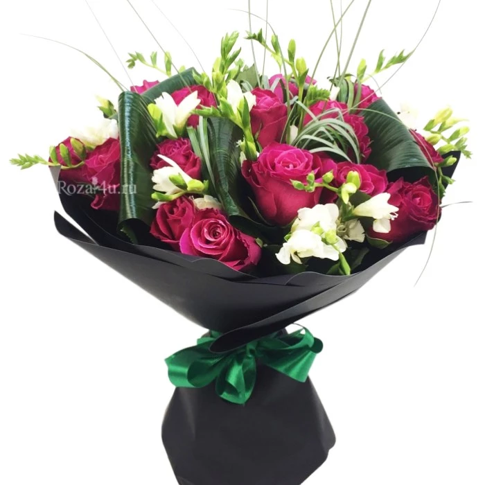 Анна о заказе: 51 малиновая розаСпасибо! Букет великолепный! Цветы свежайшие, упругие, очень красивые, крупные. Добавлено 4 коралловые розы и зелень