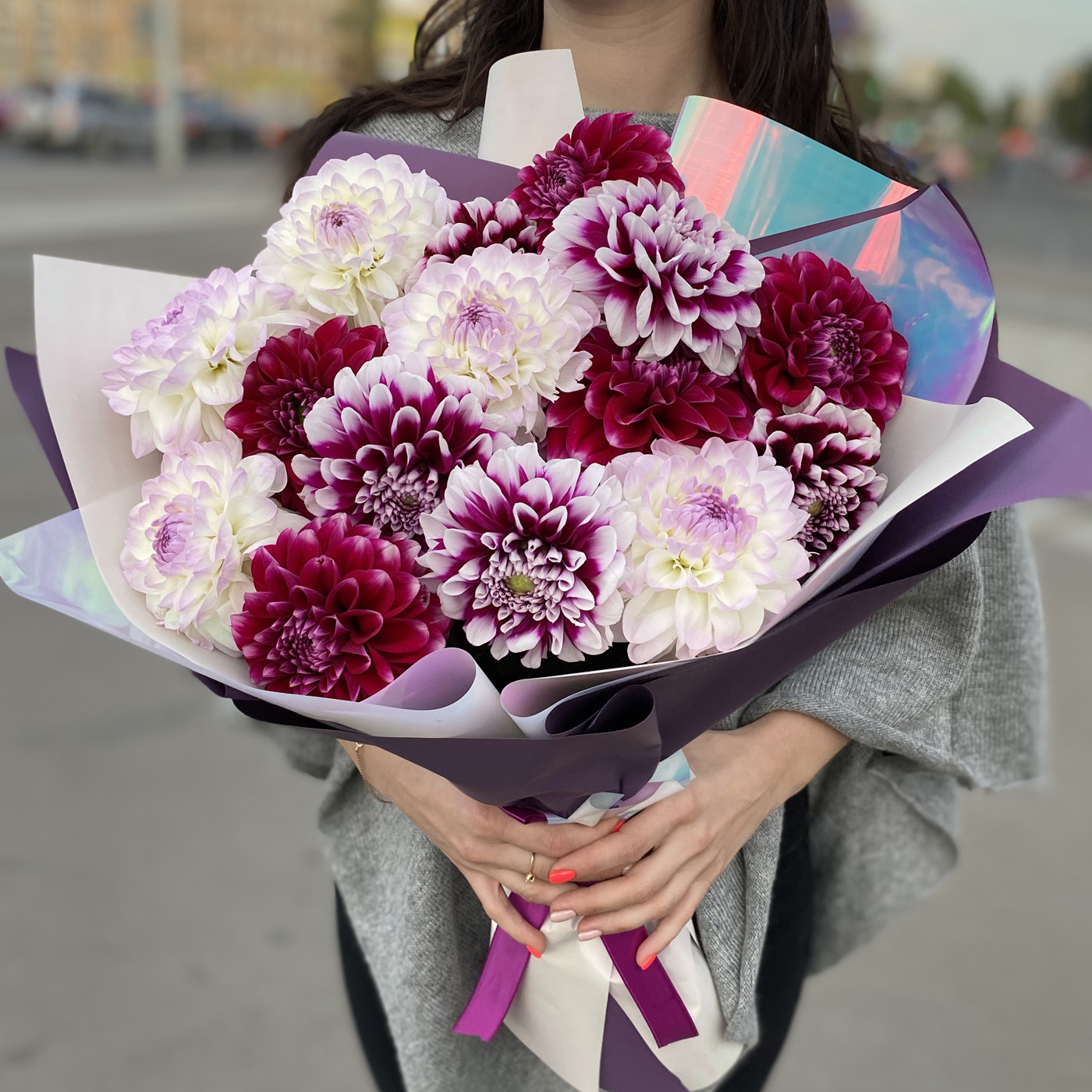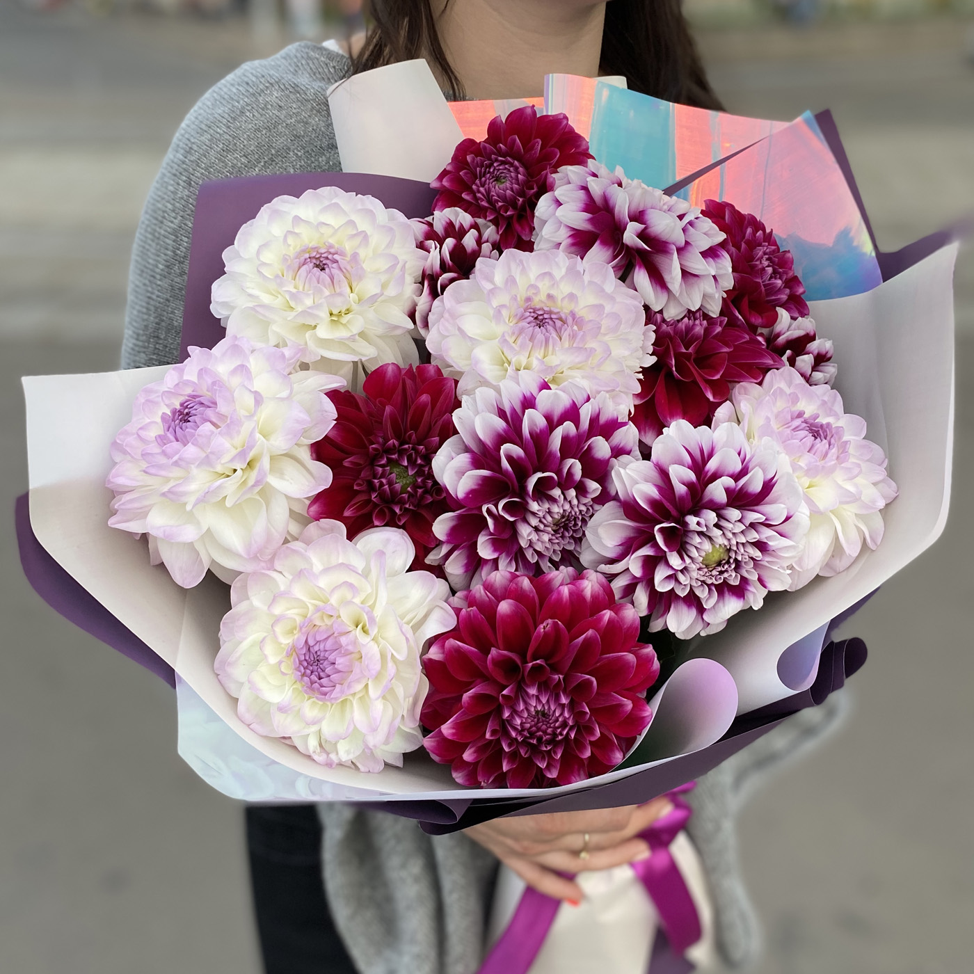 Состав на фото: букет из 15 георгин в упаковке.