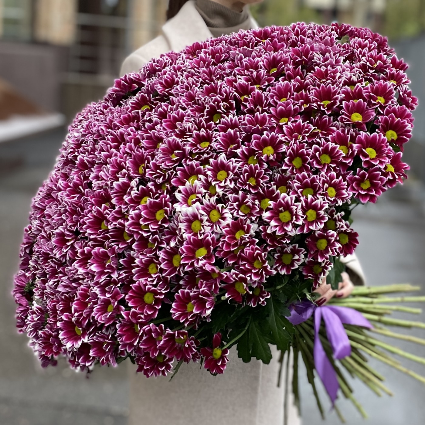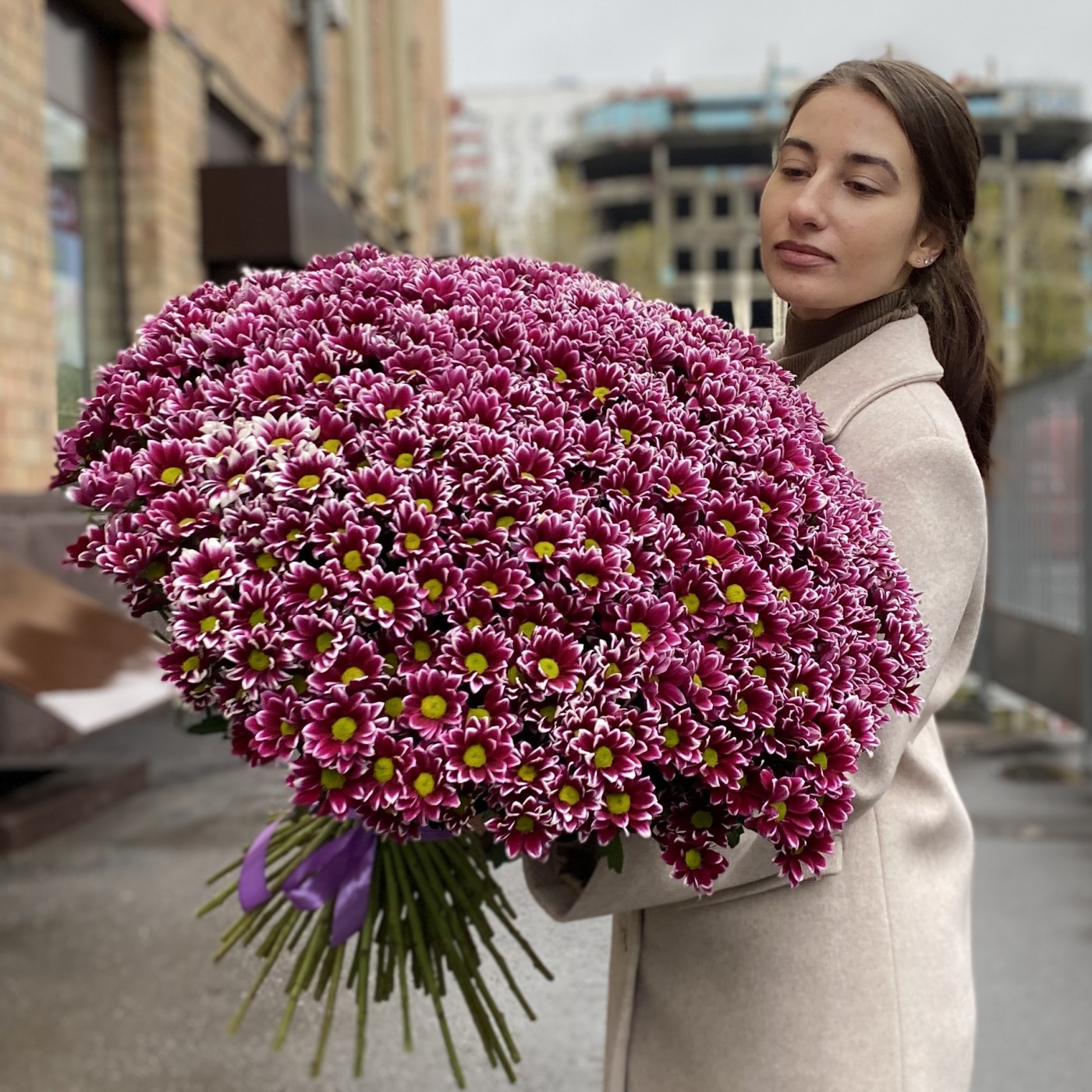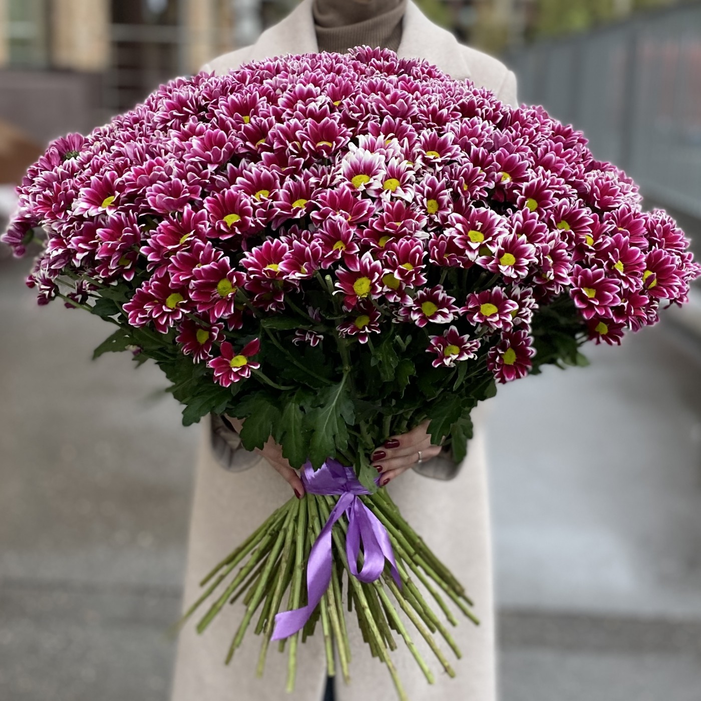 Яркий, большой букет из 101 хризантемы – это отличный вариант подарка девушке или женщине по любому поводу.