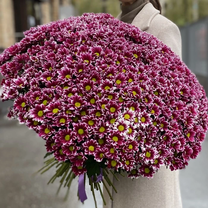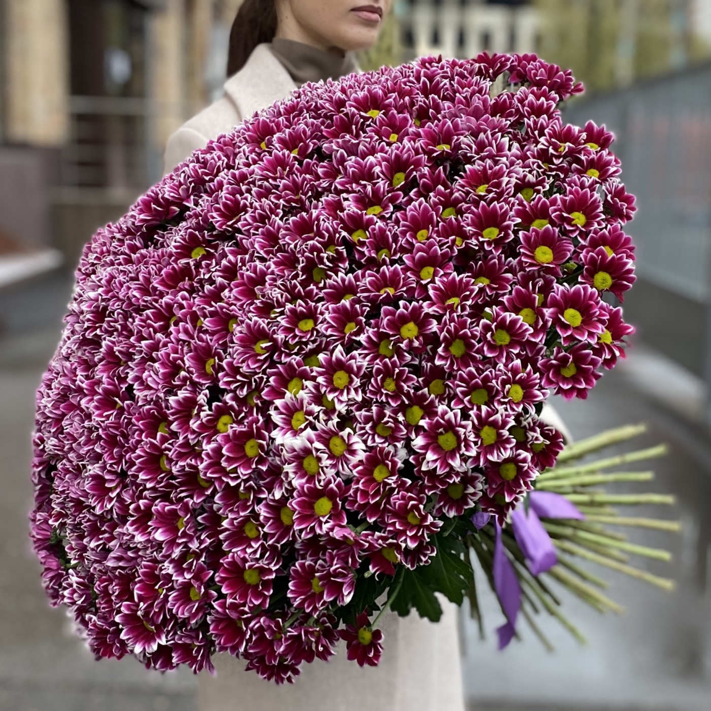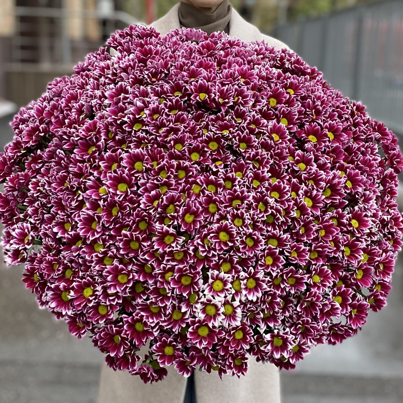 Яркий, большой букет из 101 хризантемы – это отличный вариант подарка девушке или женщине по любому поводу.