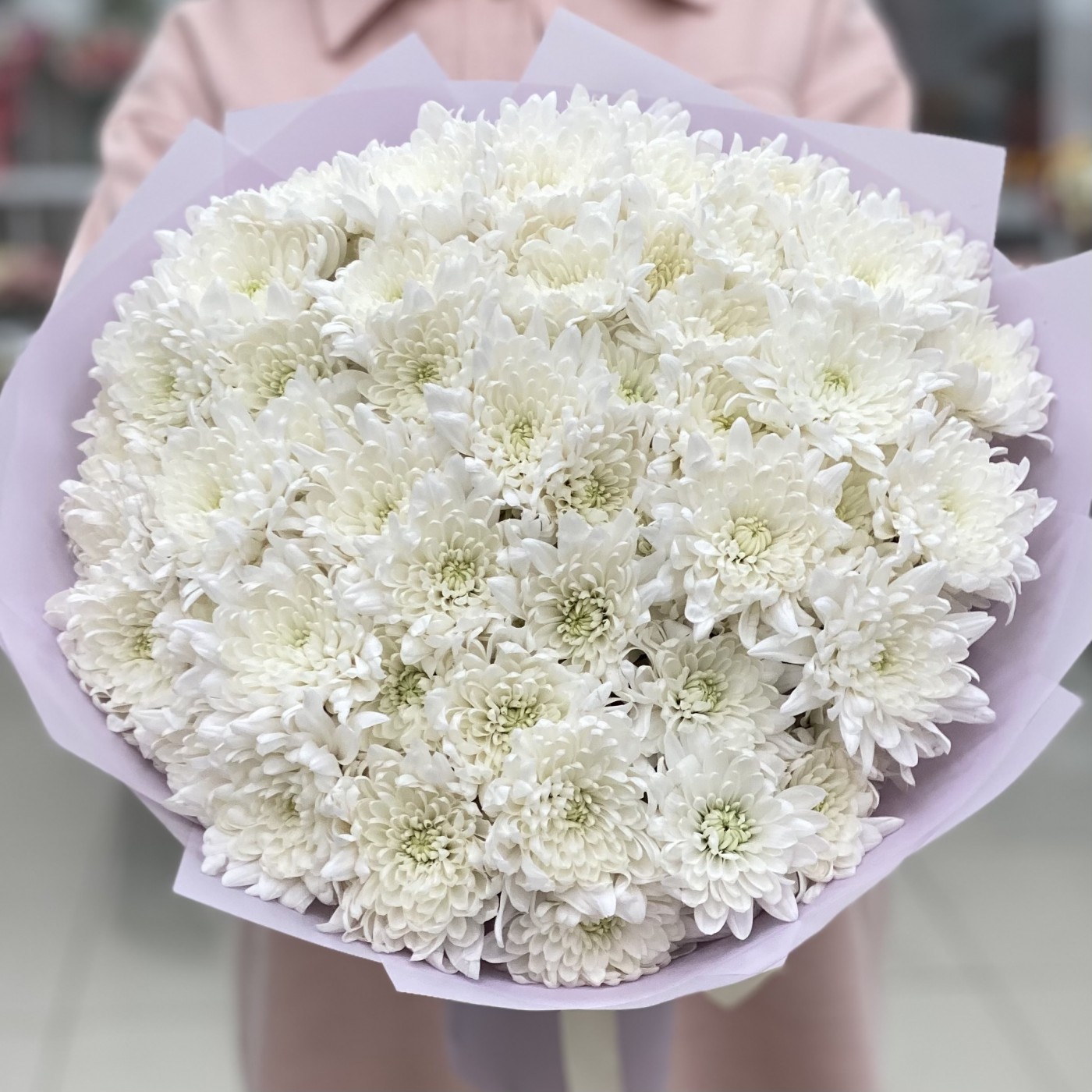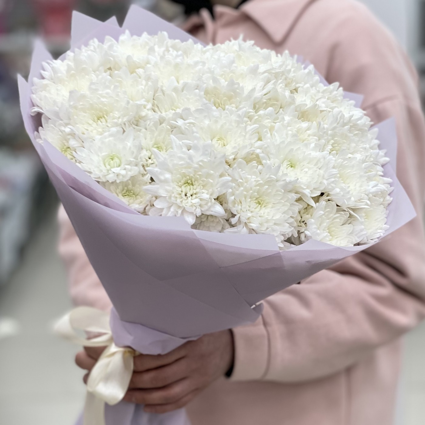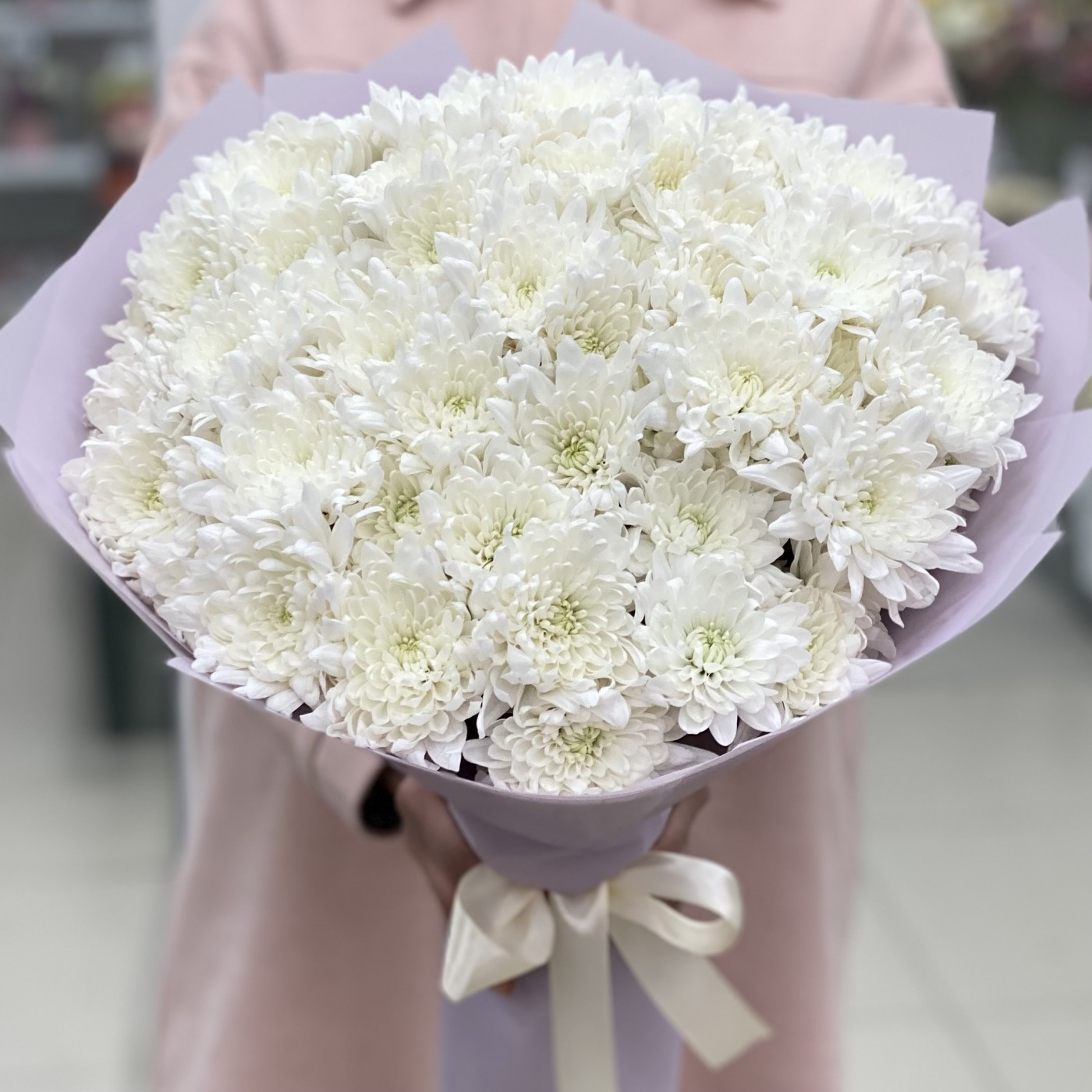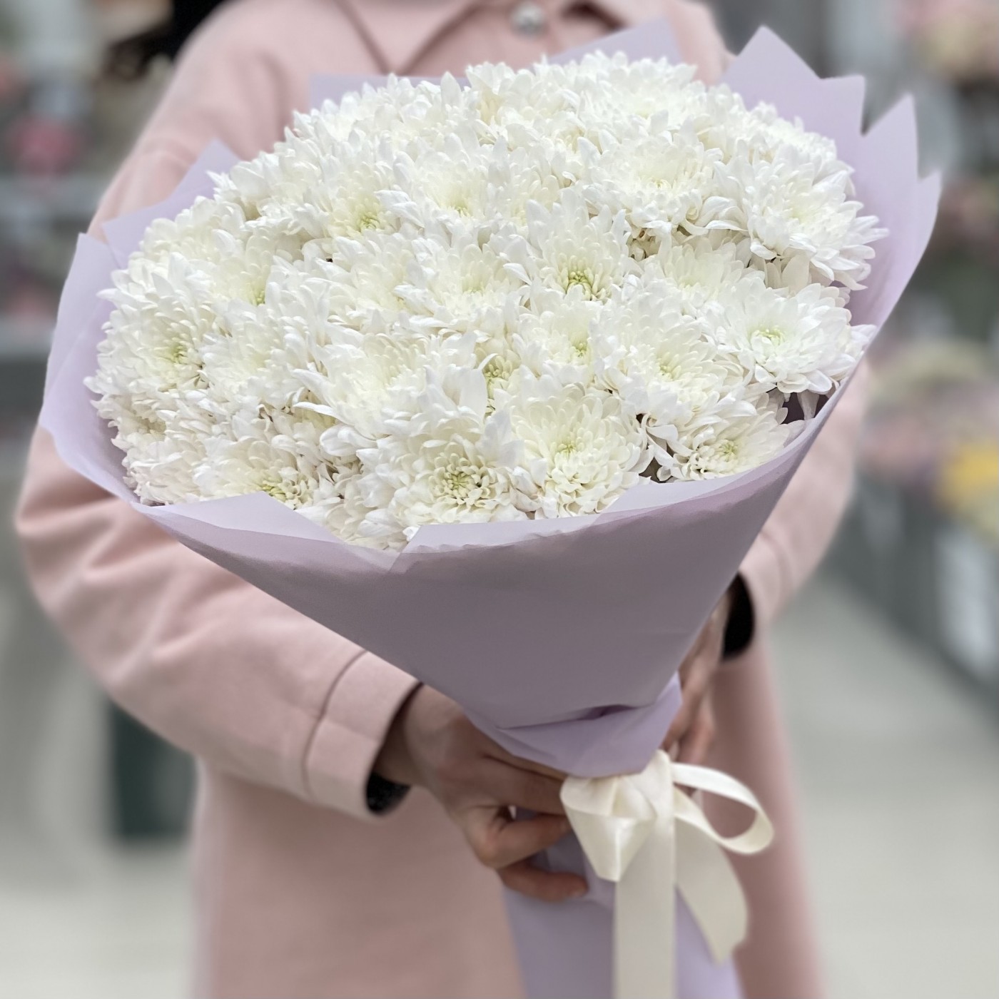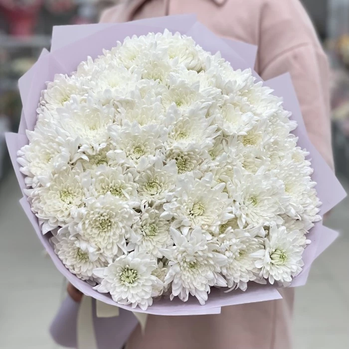 Букет из 15 белоснежных кустовых хризантем сорта Балтика — это отличный вариант подарка девушке или женщине по любому поводу. Белый оттенок символизирует чистоту и бескорыстность побуждений, поэтому такая композиция лучше любых слов расскажет об открытости и искренности чувств.