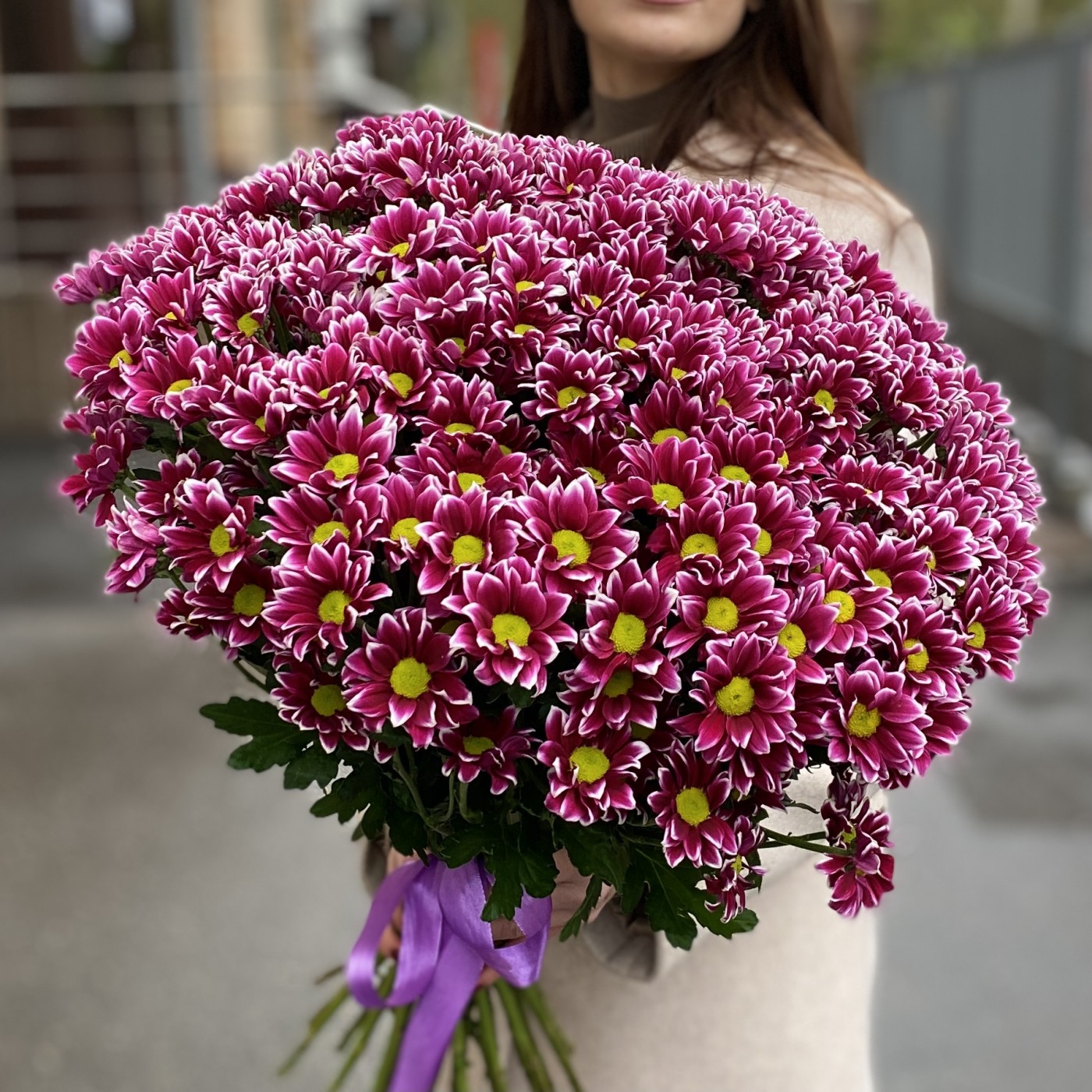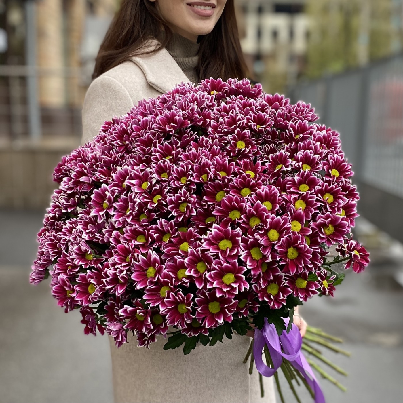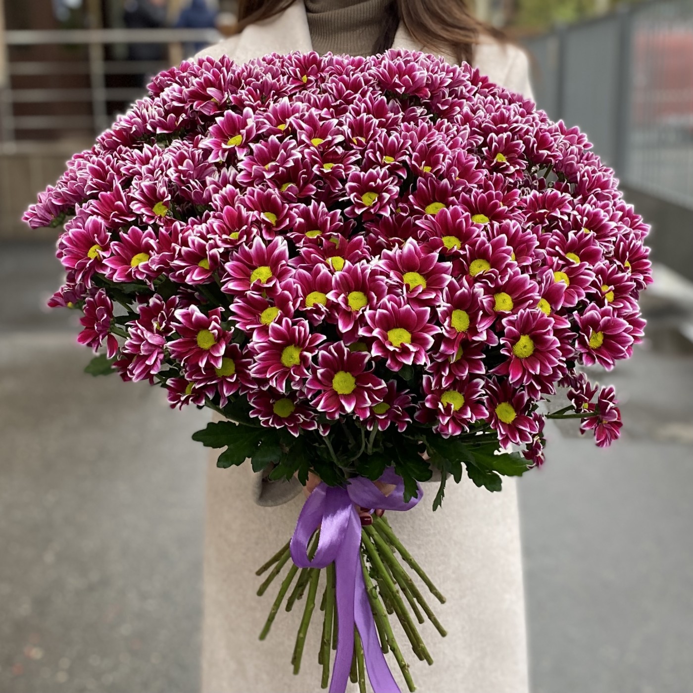 Яркий, большой букет из 51 хризантемы – это отличный вариант подарка девушке или женщине по любому поводу.
