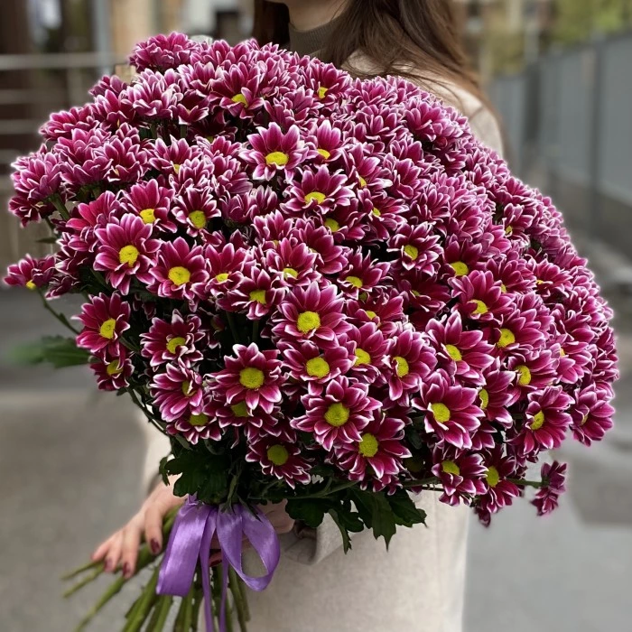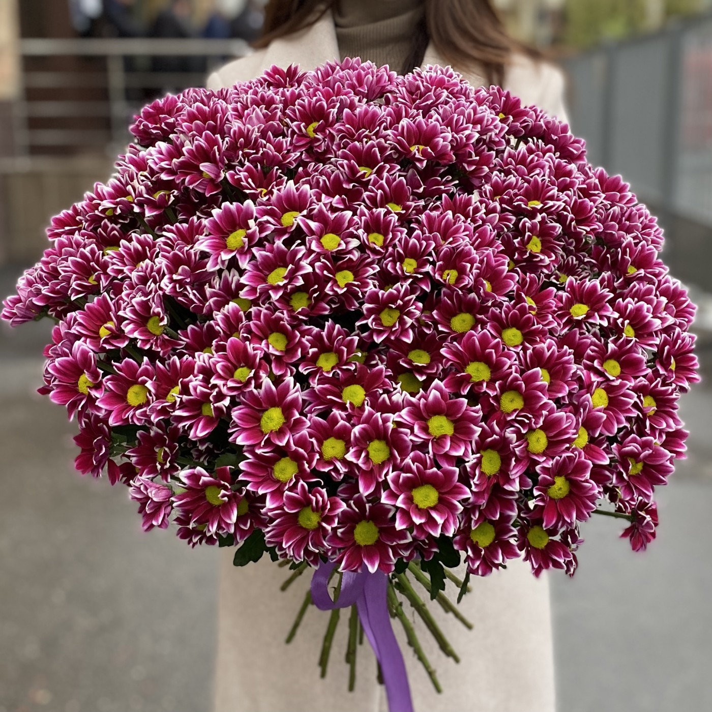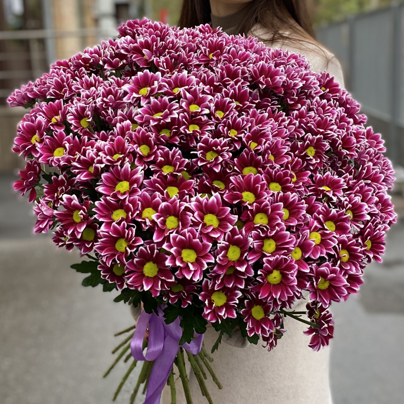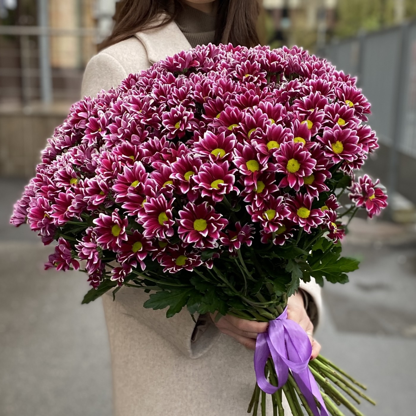 Яркий, большой букет из 51 хризантемы – это отличный вариант подарка девушке или женщине по любому поводу.