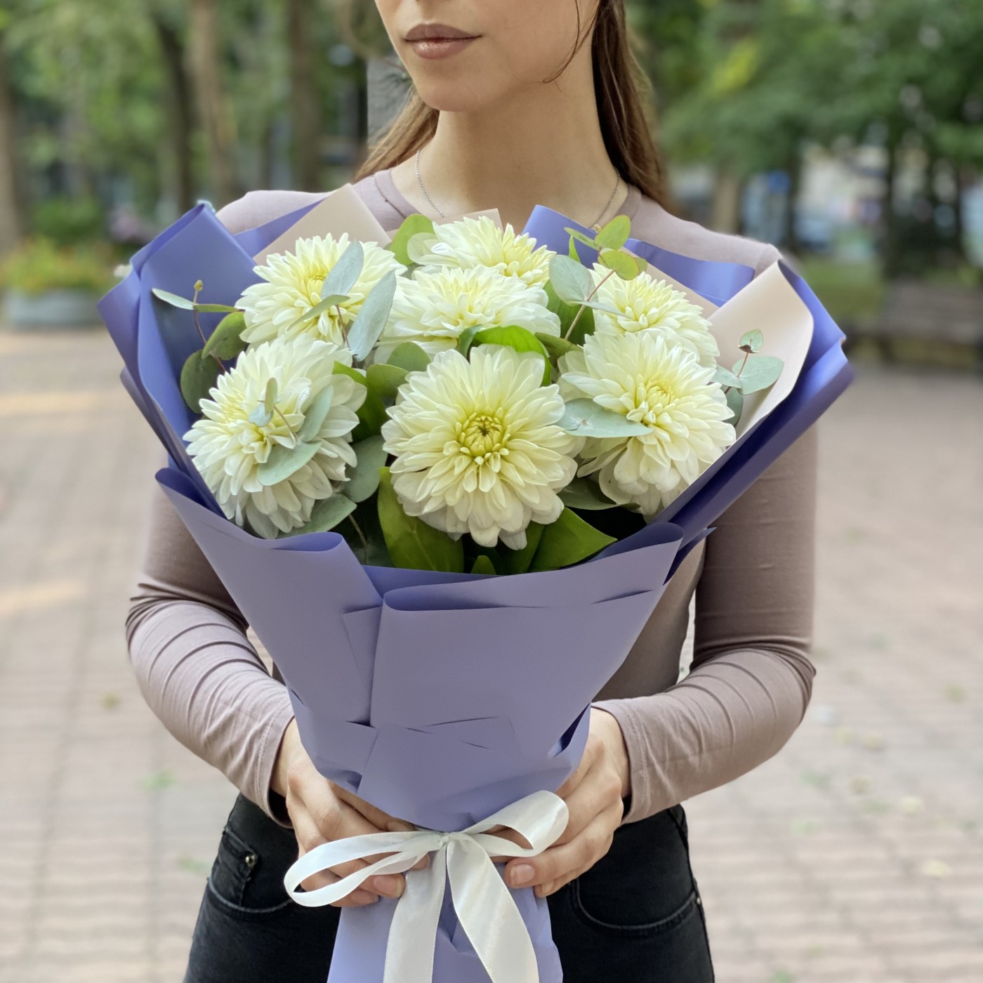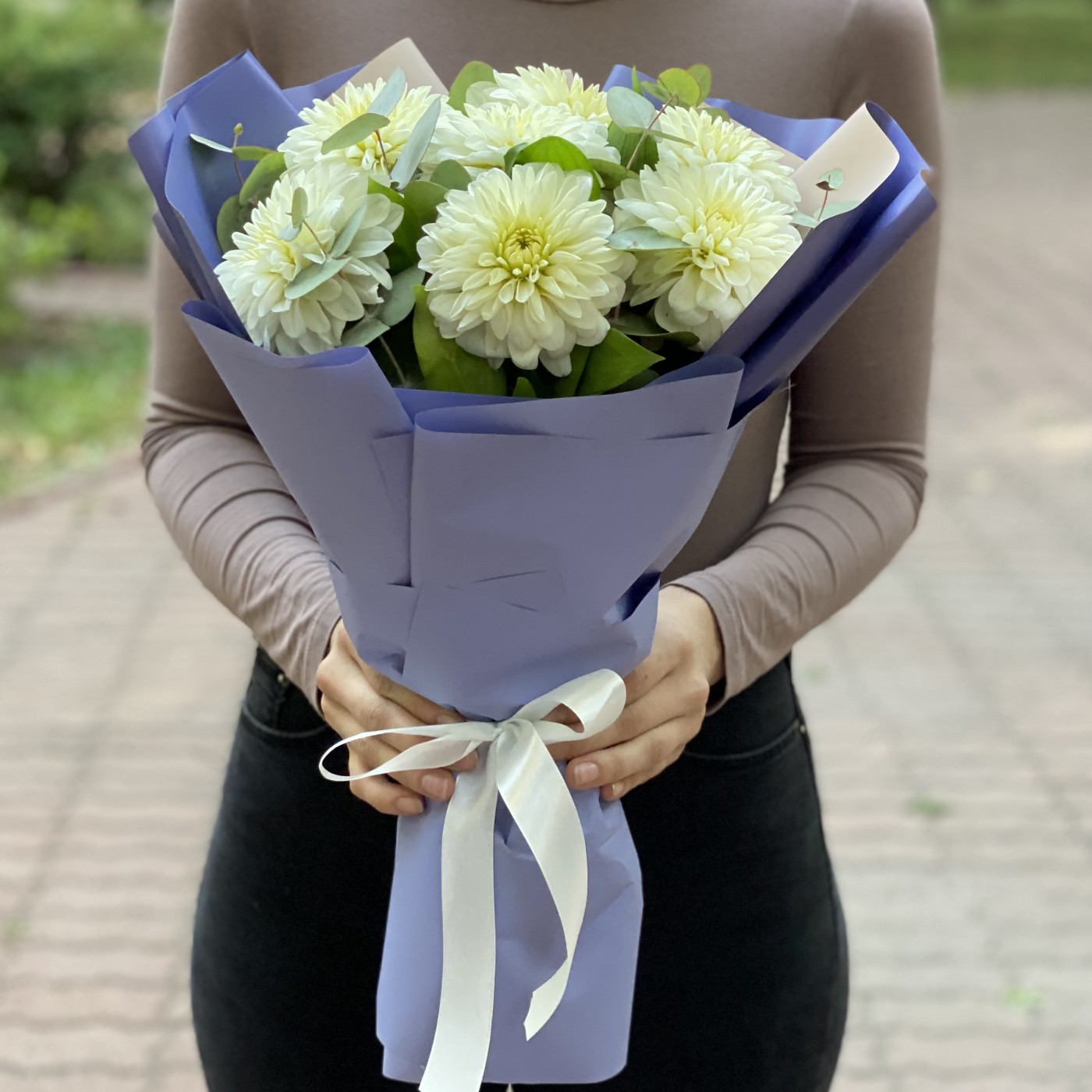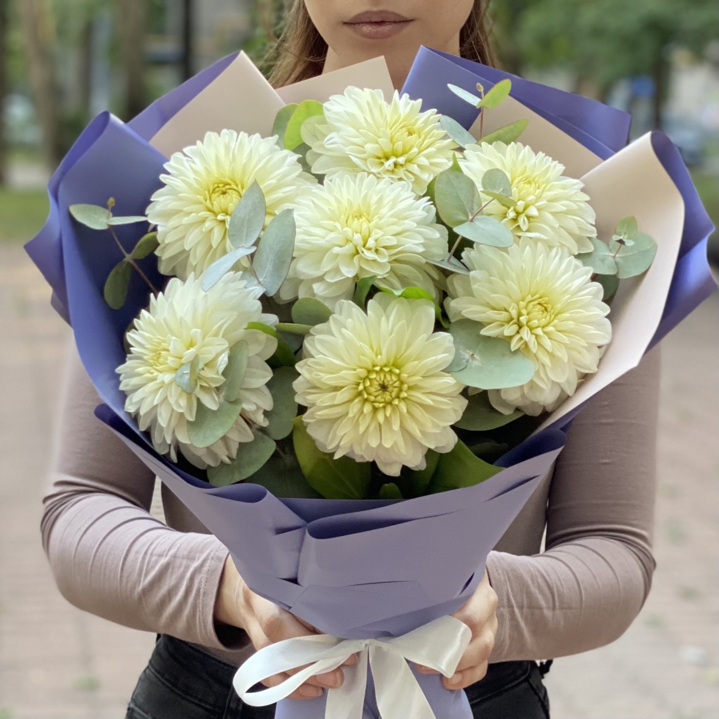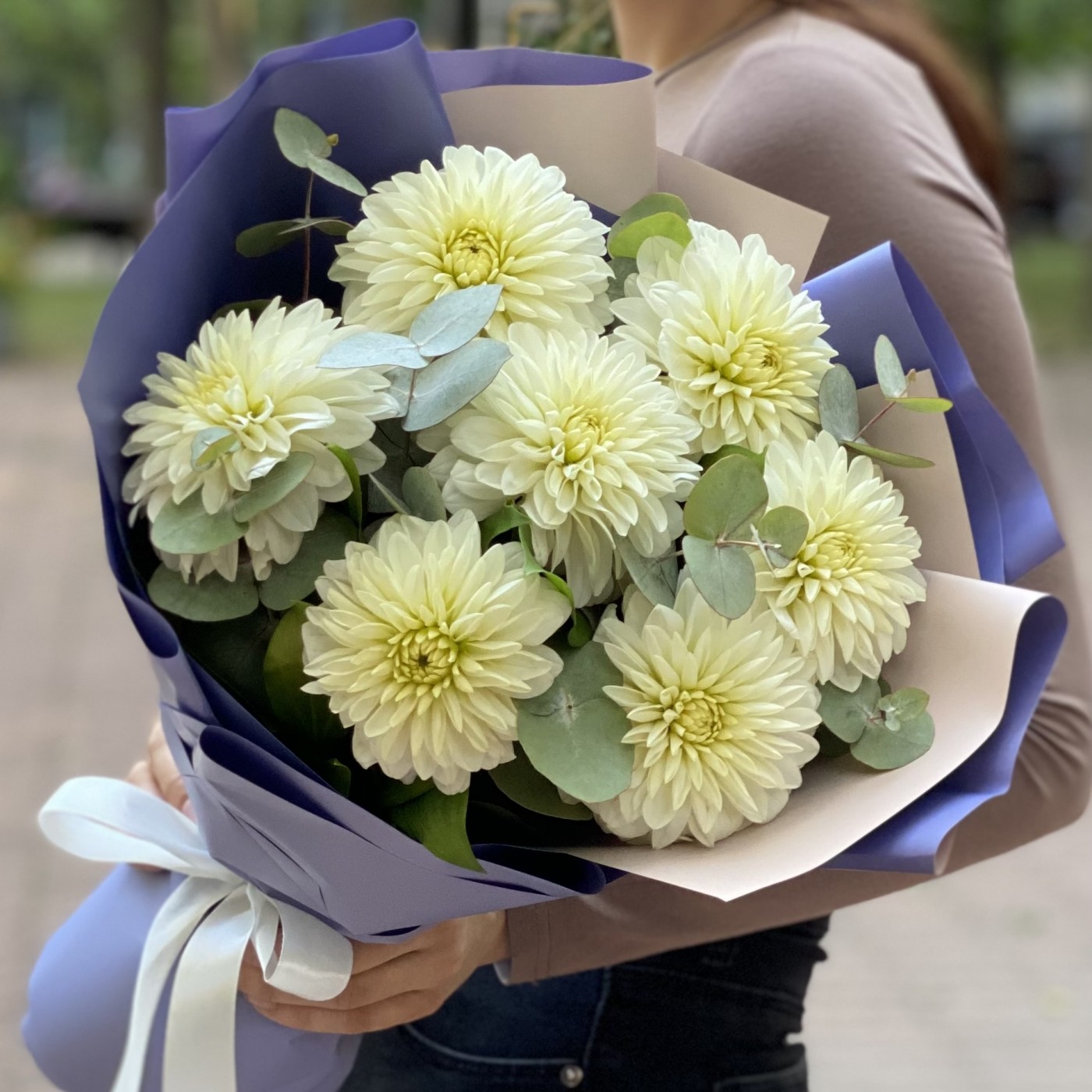 Букет из красивых сезонных белых георгинов. В сочетании с эвкалиптом получается изящный и выразительный букет.