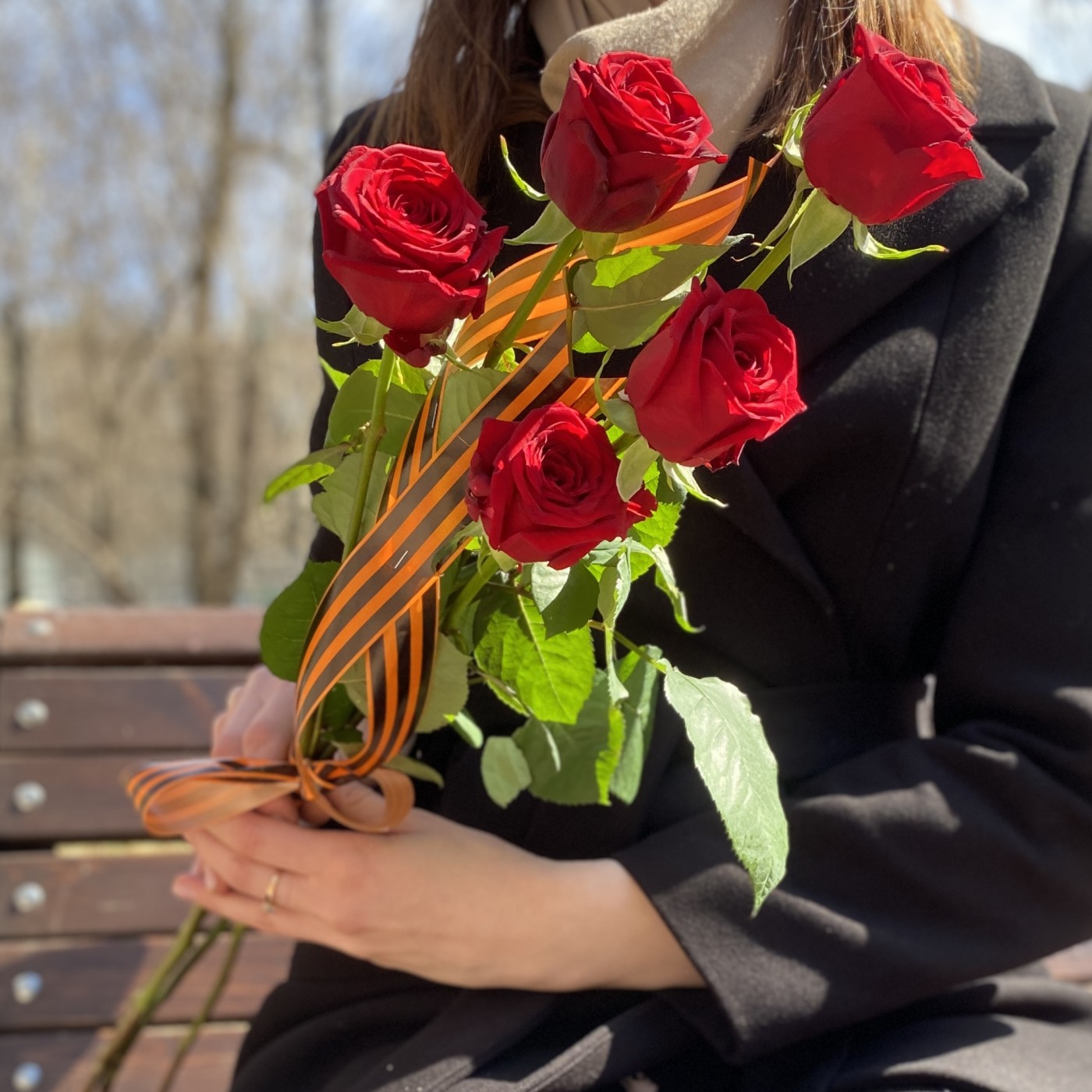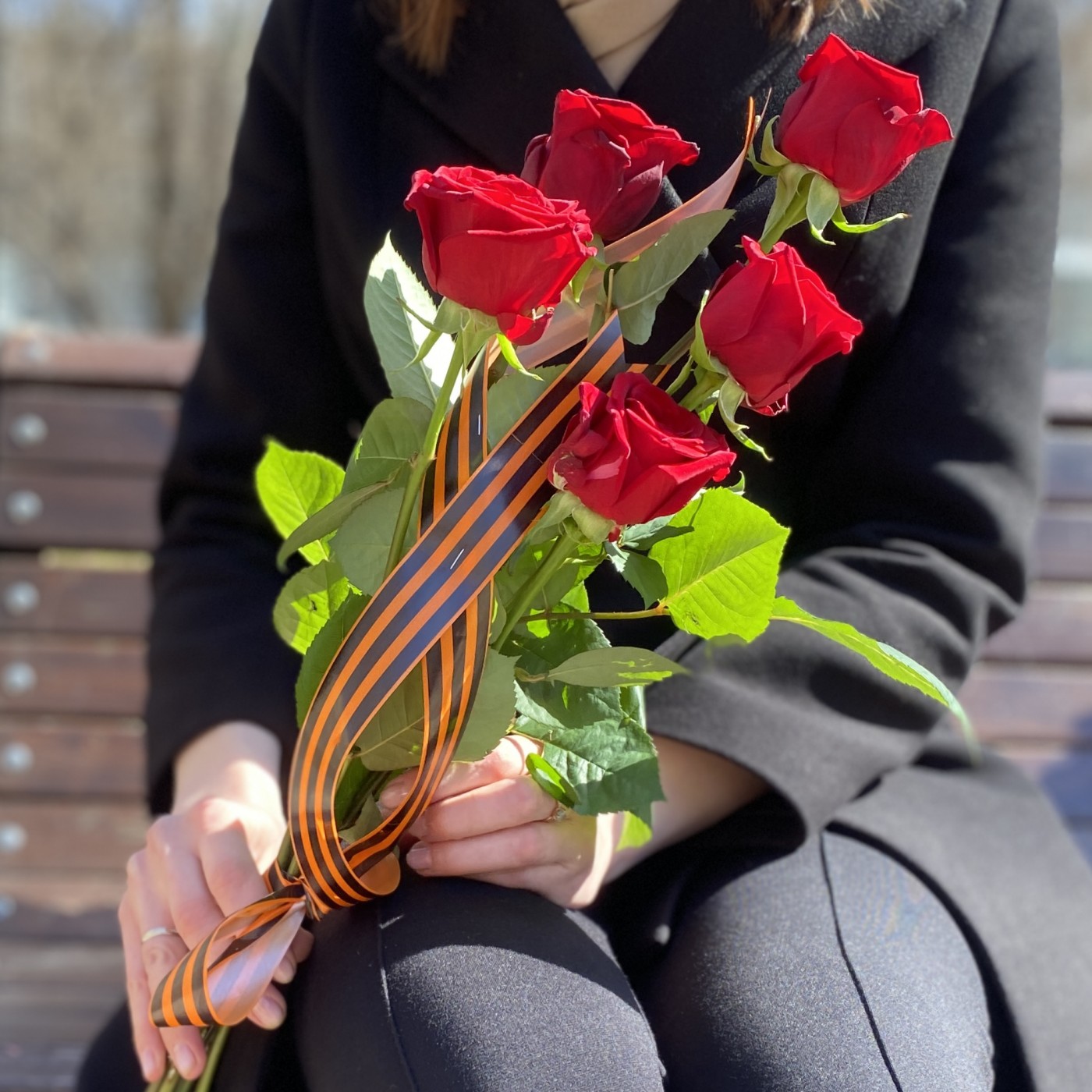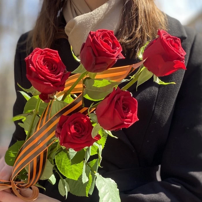 Букет из 5 красных роз для подарка на 9 мая. Цветы перевязаны Георгиевской лентой.