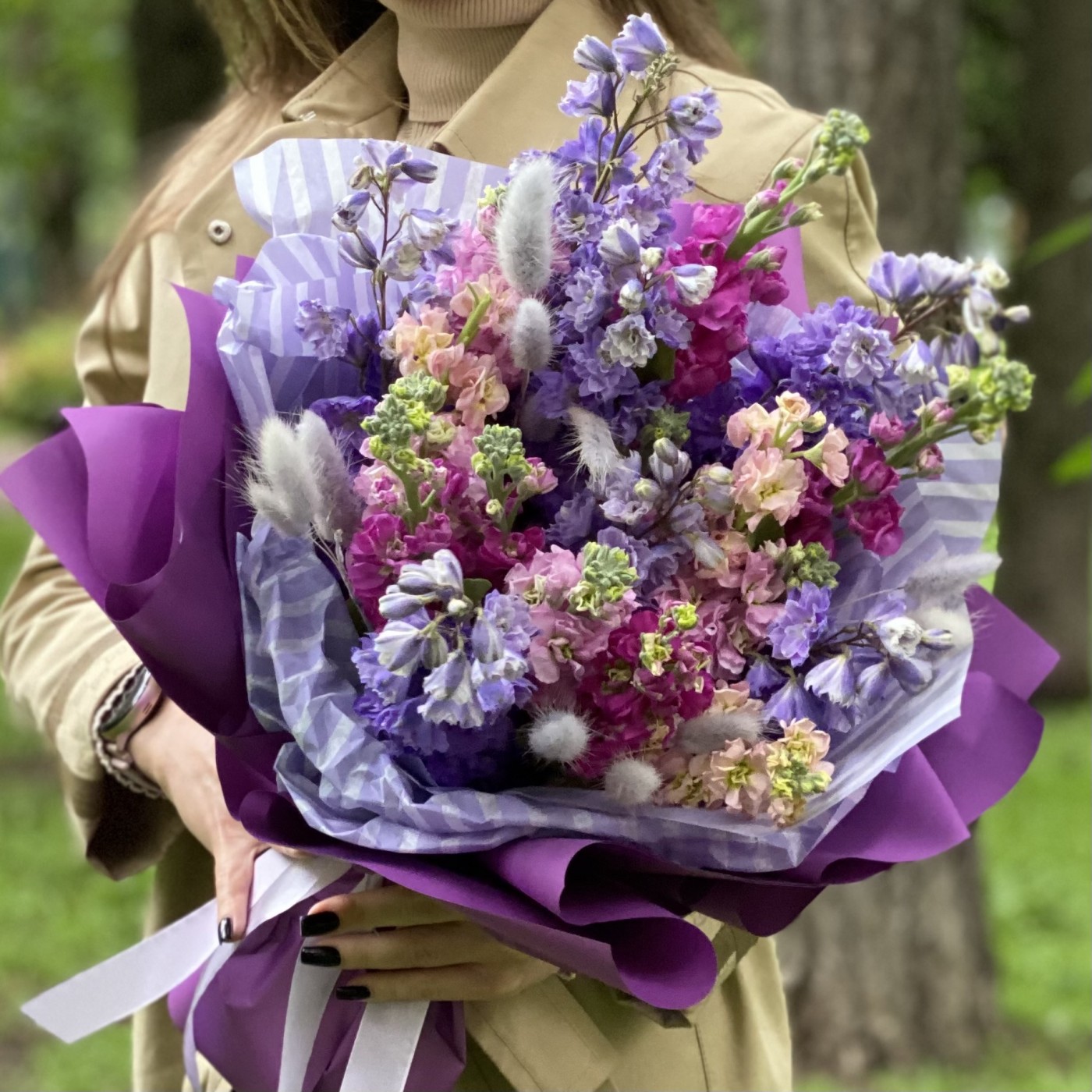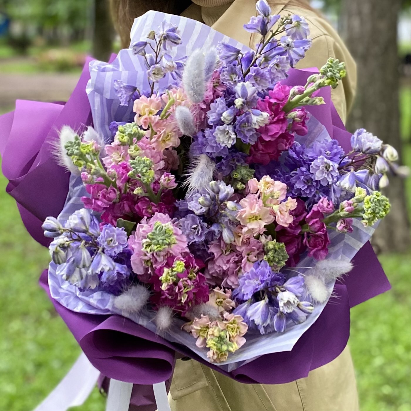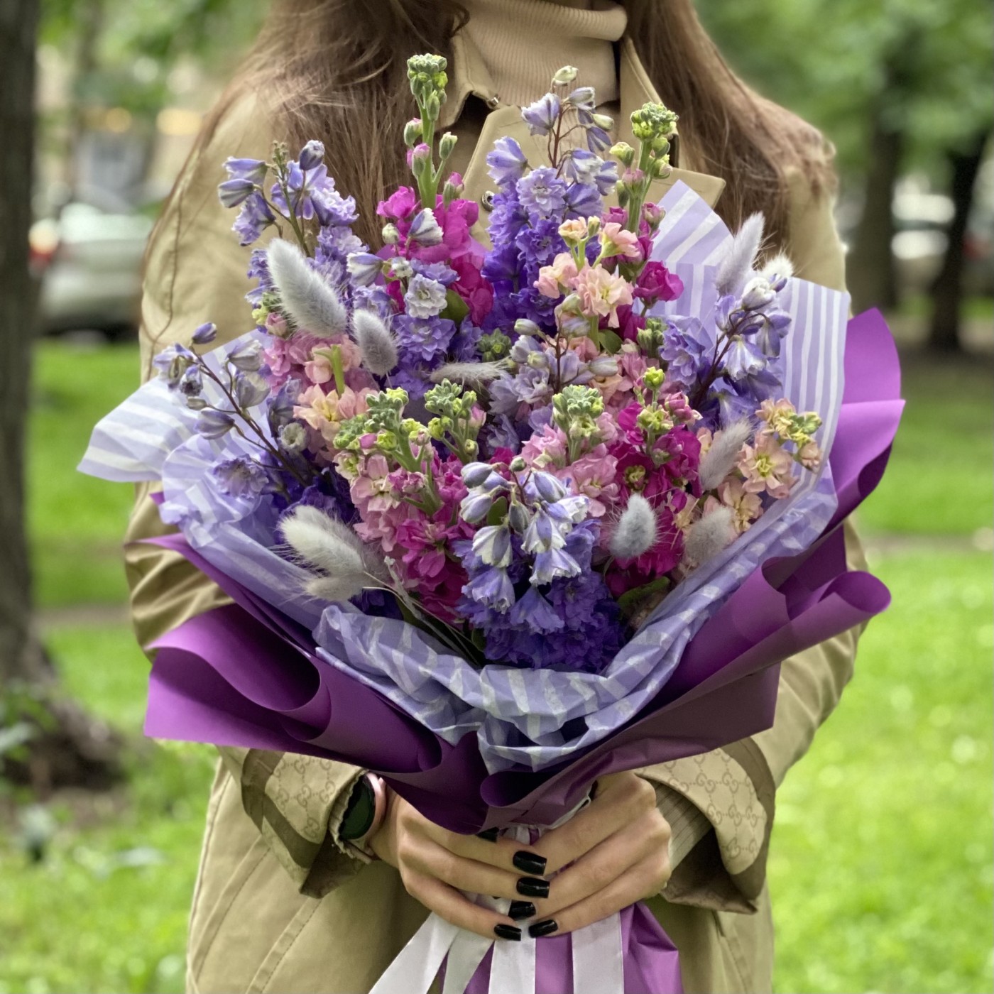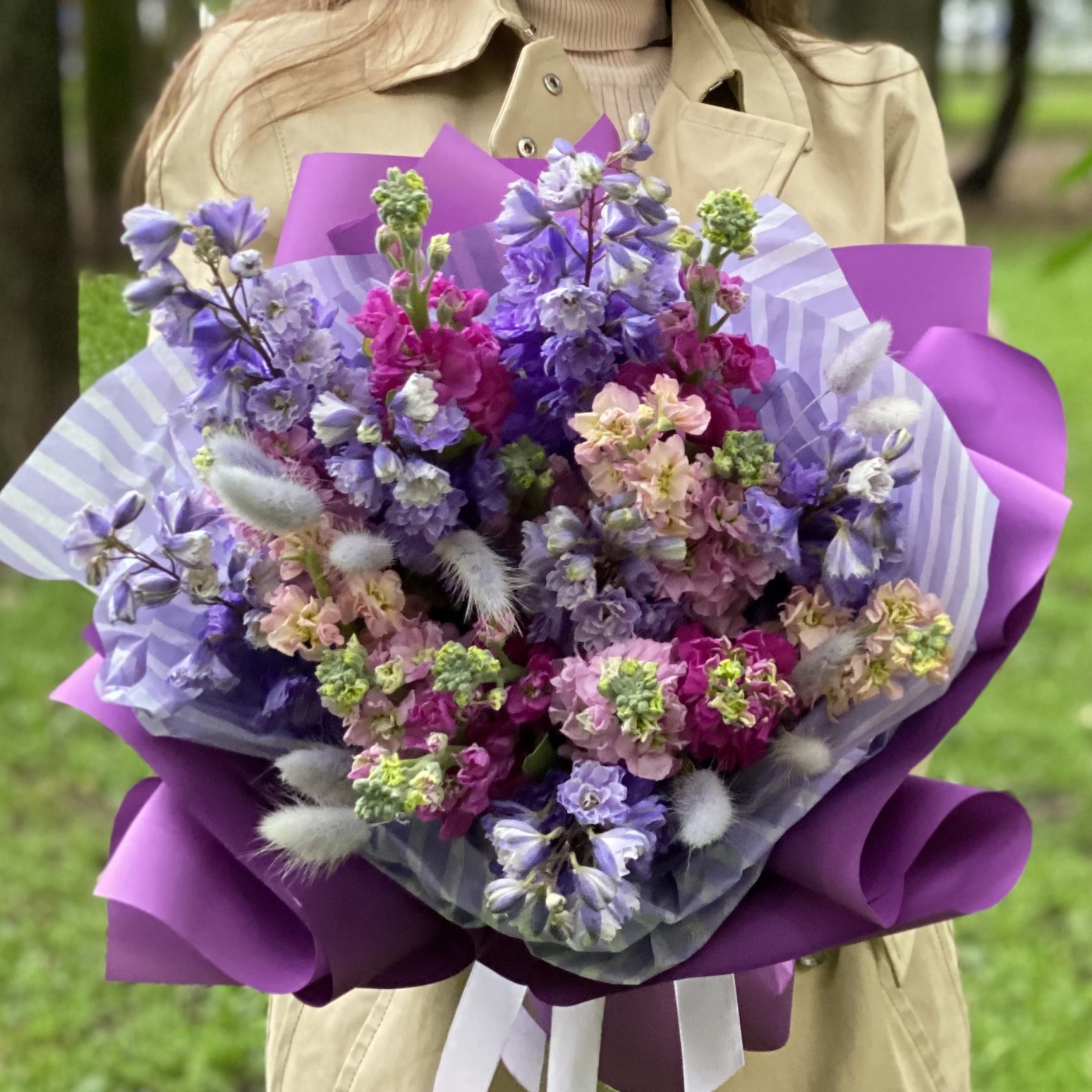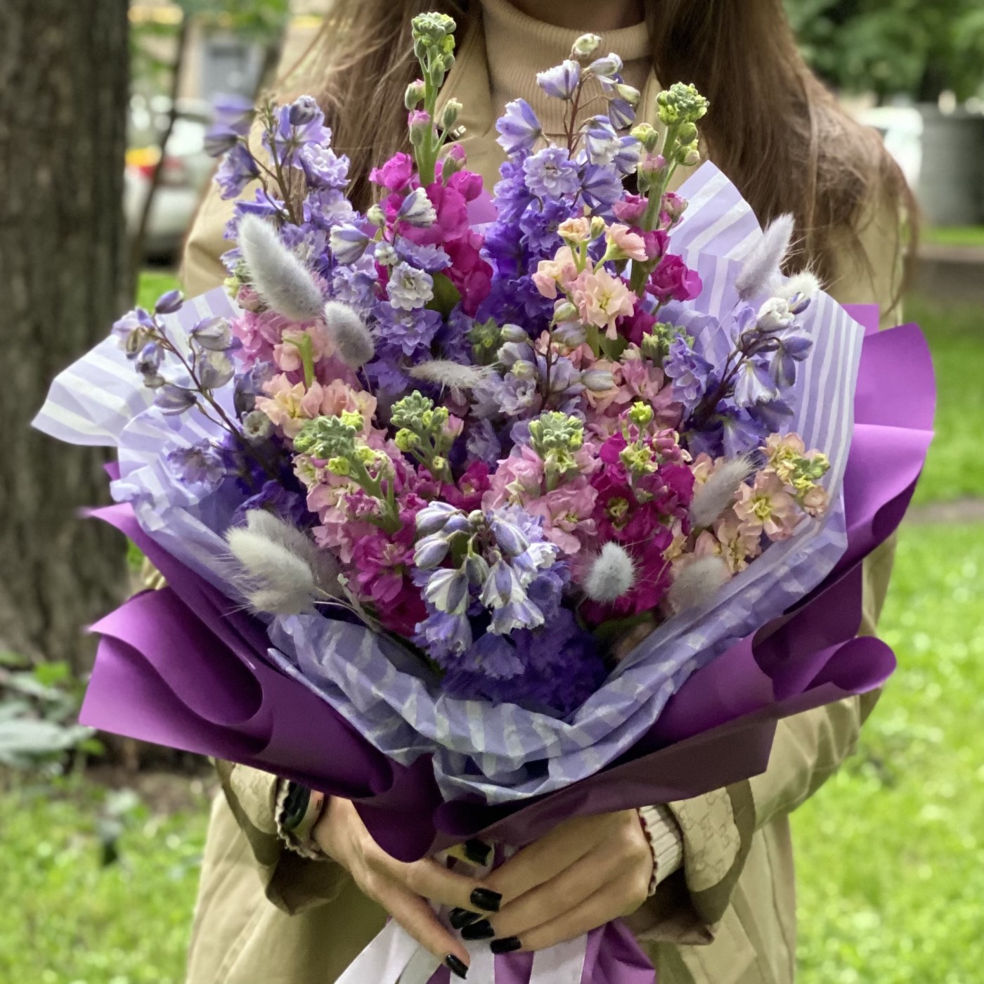 Букет из ароматных маттиол и пушистого фиолетового дельфиниума. Такой букет можно преподнести в качестве комплимента или подарить ребенку на день рождения.