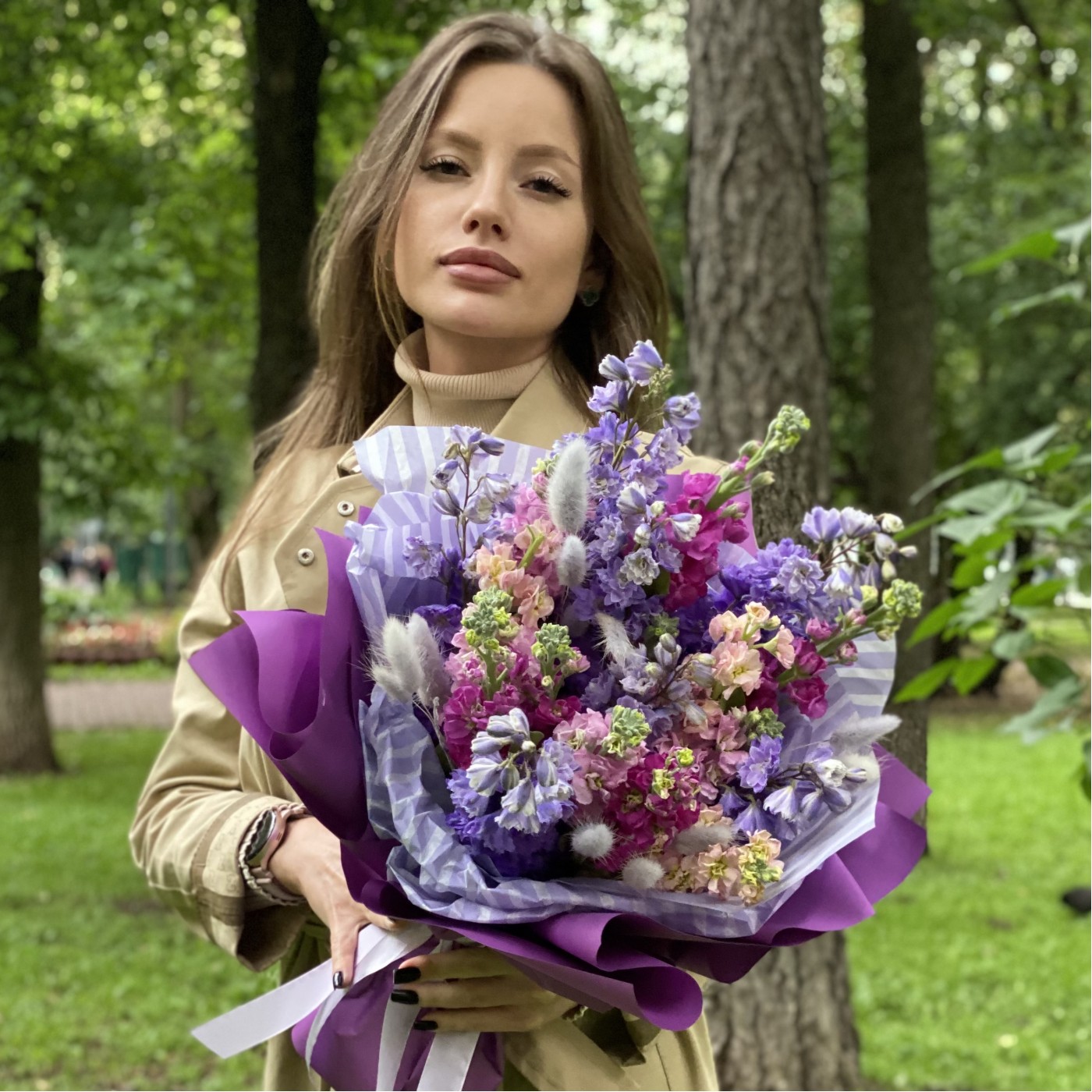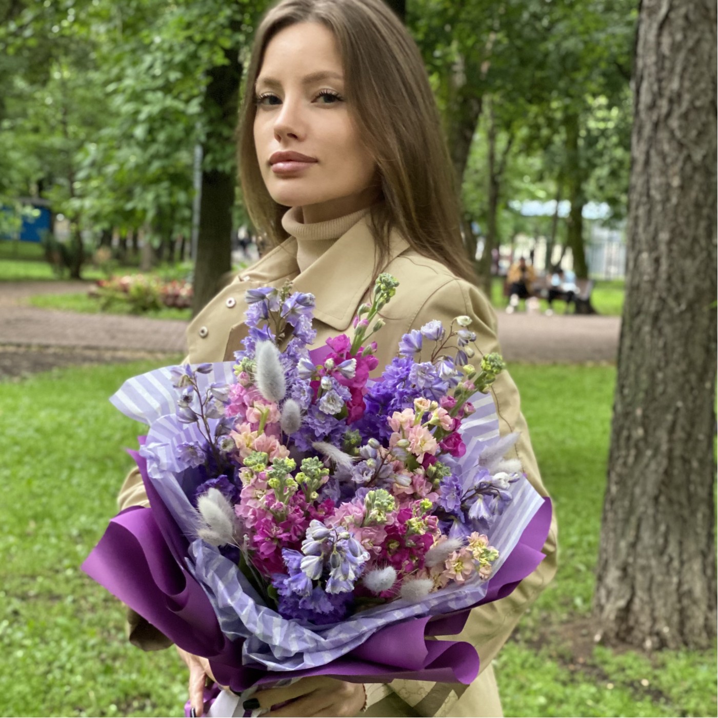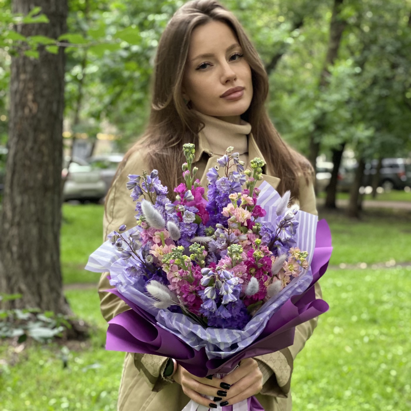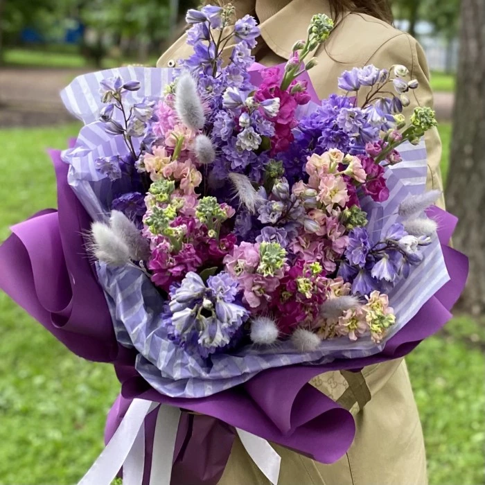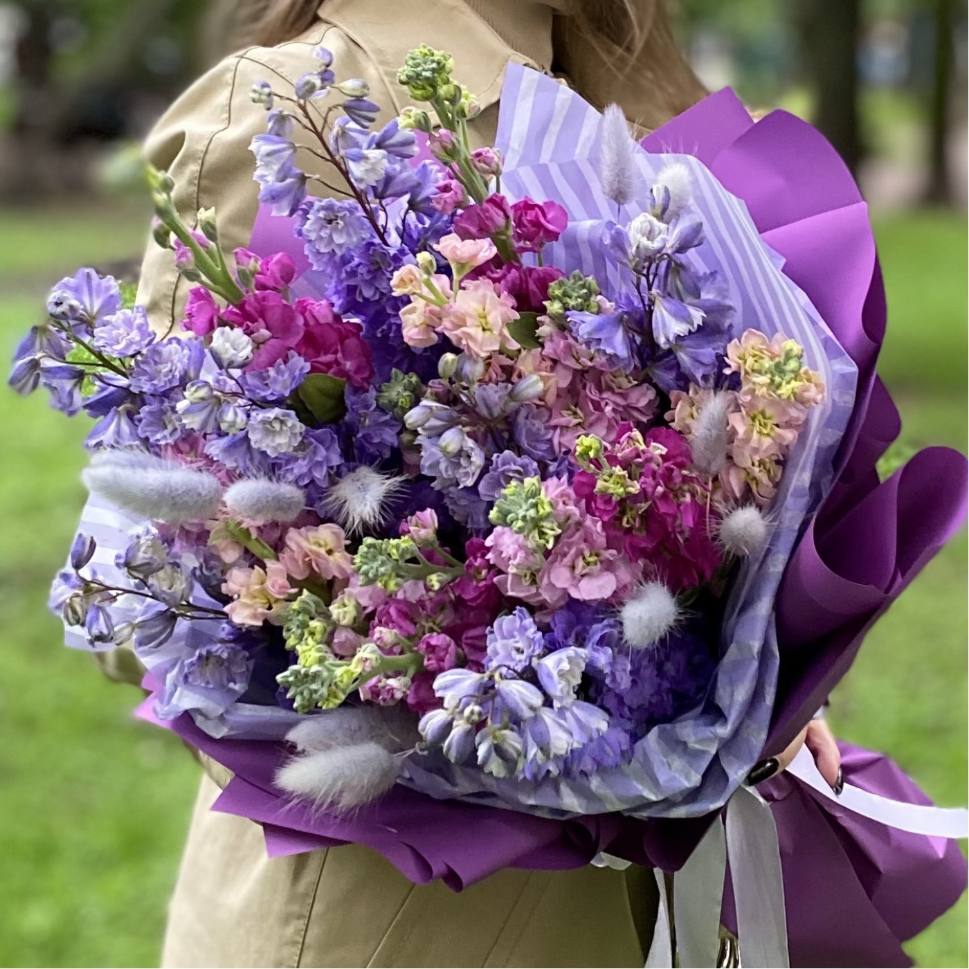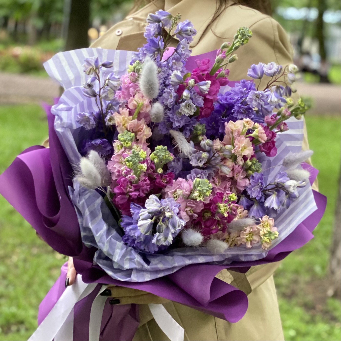 Букет из ароматных маттиол и пушистого фиолетового дельфиниума. Такой букет можно преподнести в качестве комплимента или подарить ребенку на день рождения.