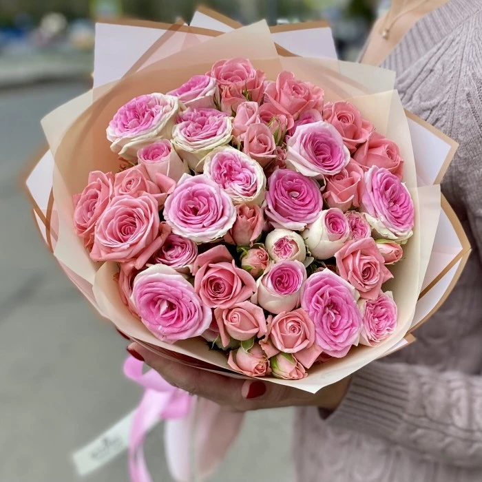 Красивый букет из двух сортов розовых роз. Такой букет из пионовидных роз и кустовых роз, прекрасно подойдет в качестве подарка на день рождения или как букет комплимент. Букет роз всегда актуальный подарок на любое событие.