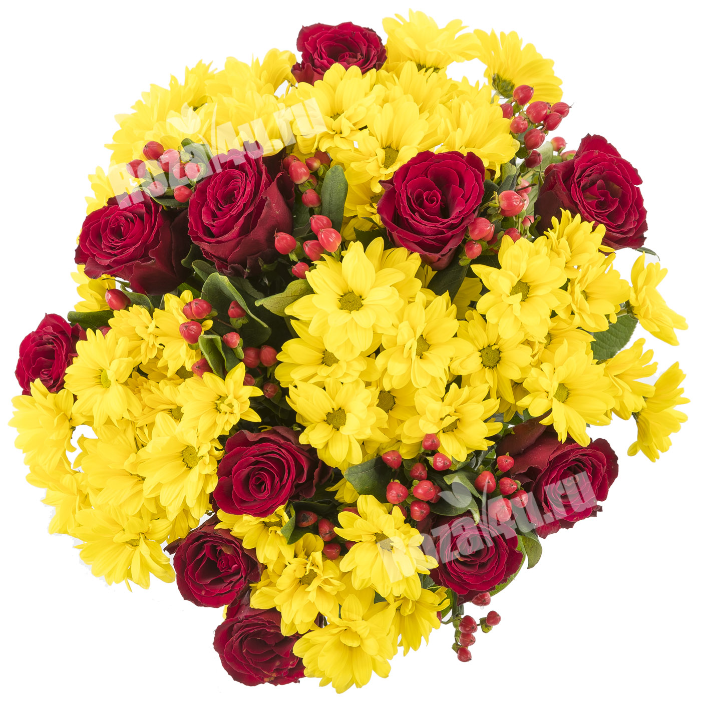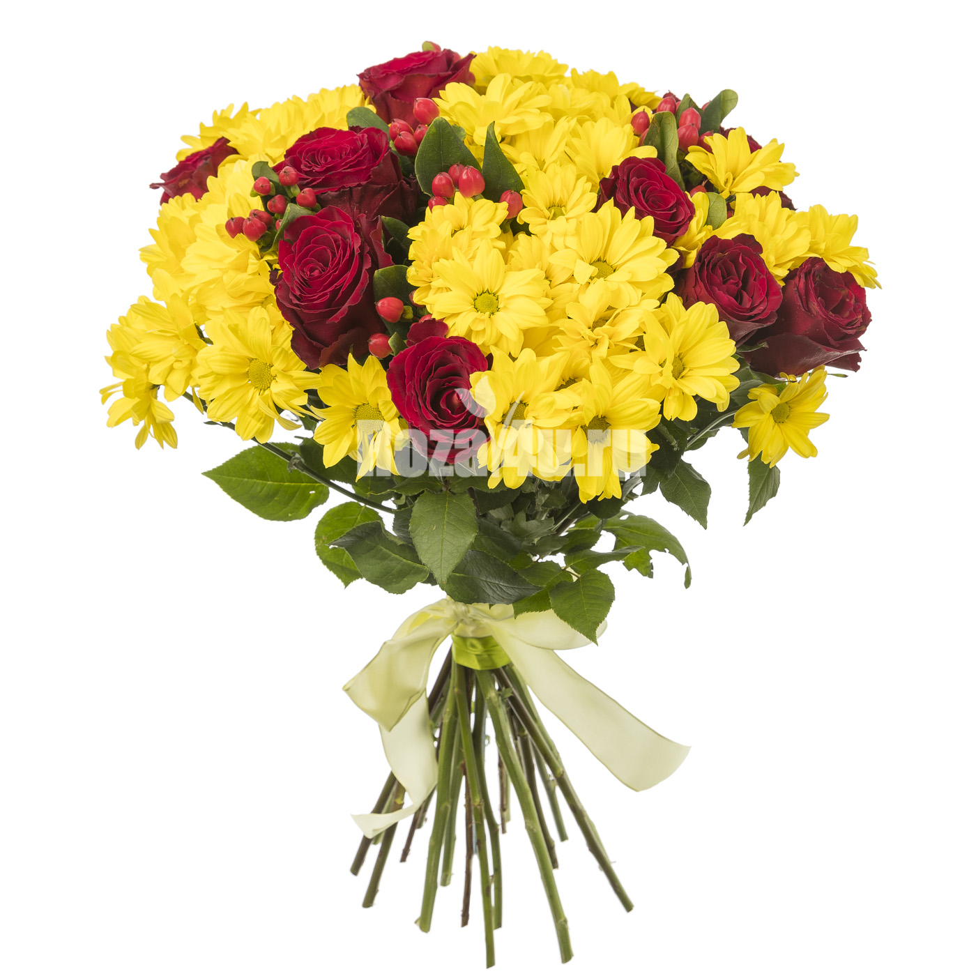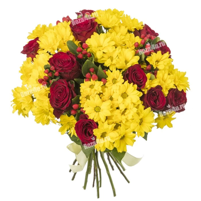 Яркий букет из красных роз и желтых хризантем создан, чтобы Вы могли без слов выразить самые теплые и искренние чувства.