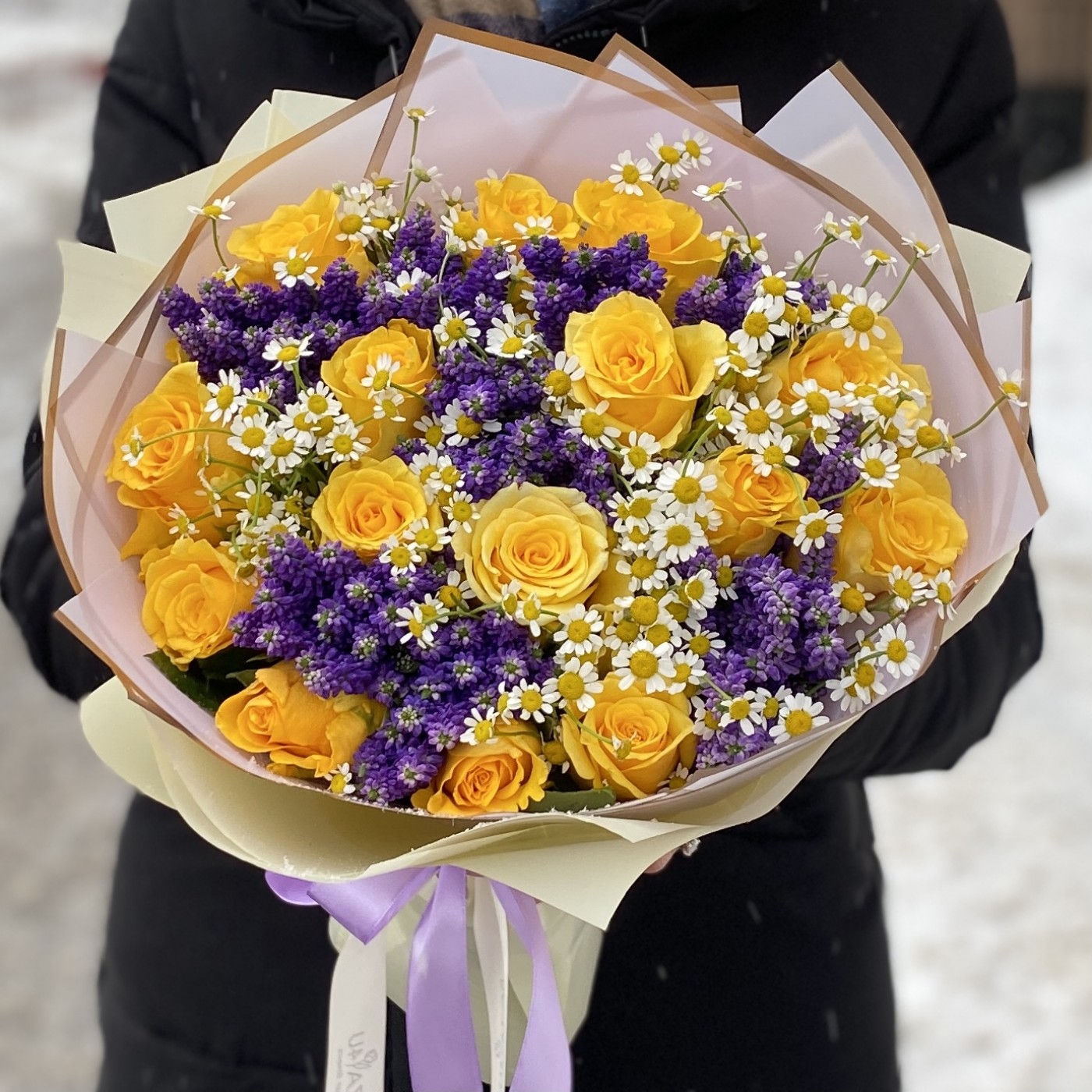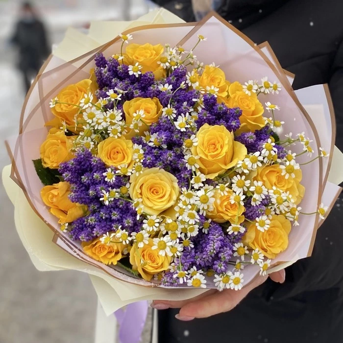 Купить недорого яркий летний букет можно удобно и быстро на нашем сайте. Игривый солнечный букетик из ароматных желтых роз с россыпью нежнейших ромашек поднимет настроение и создаст беззаботную уютную атмосферу. Композиция имеет универсальное предназначение, ее можно преподнести любимой девушке, близким родственникам, коллегам или подруге. Раскрасьте день близкого человека самыми яркими летними красками!