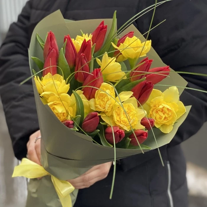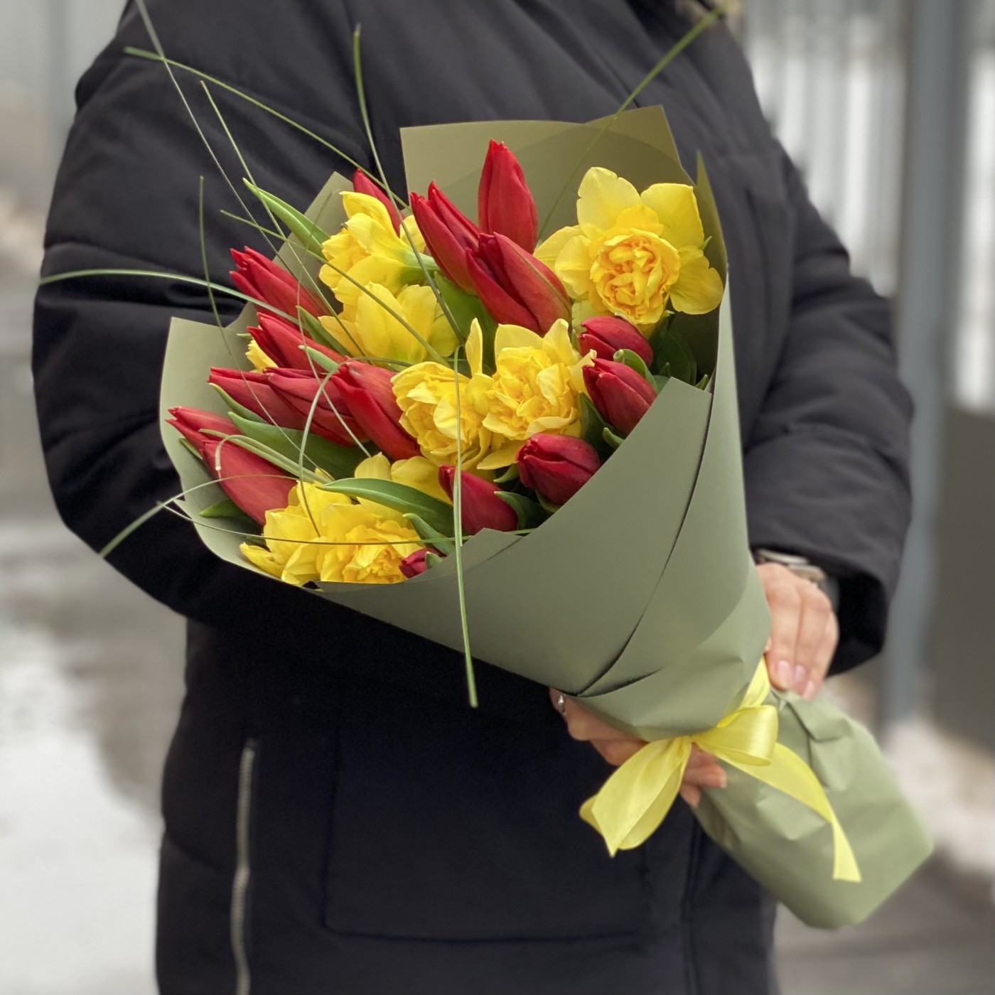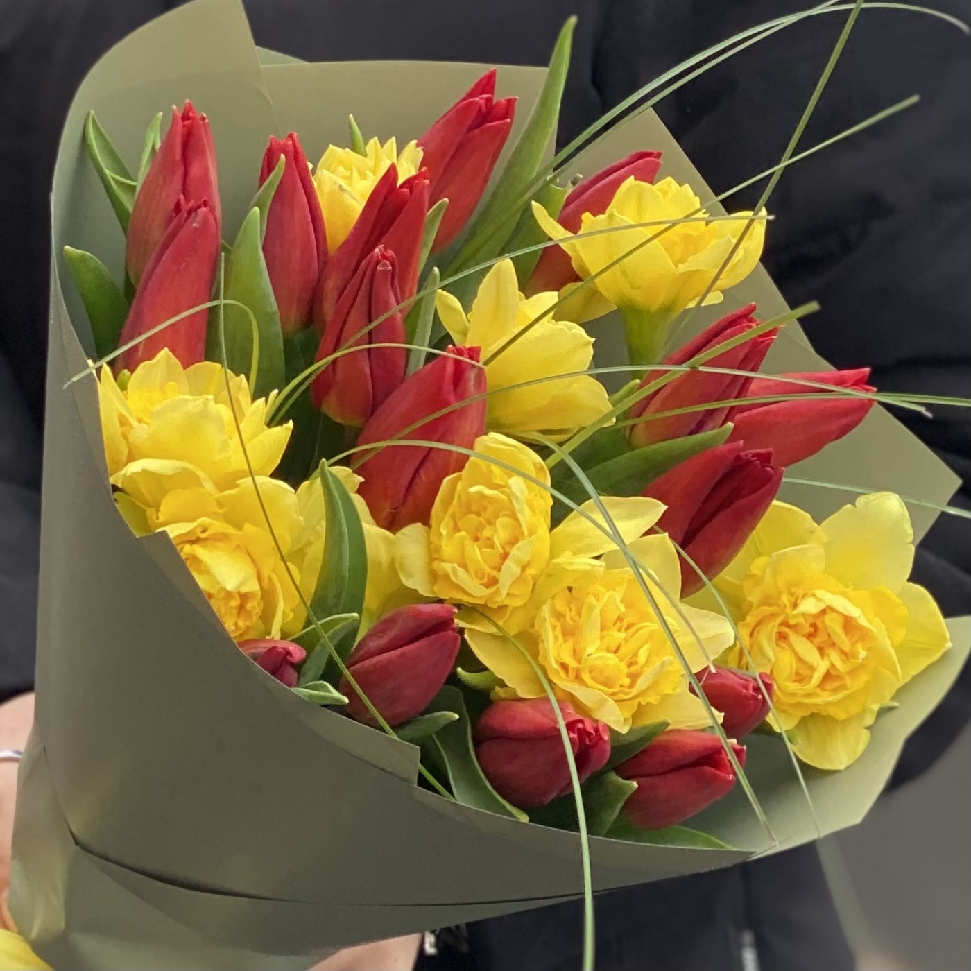Яркий, радостный букет из красных тюльпанов и ароматных, желтых нарциссов подарит радость и восторг.