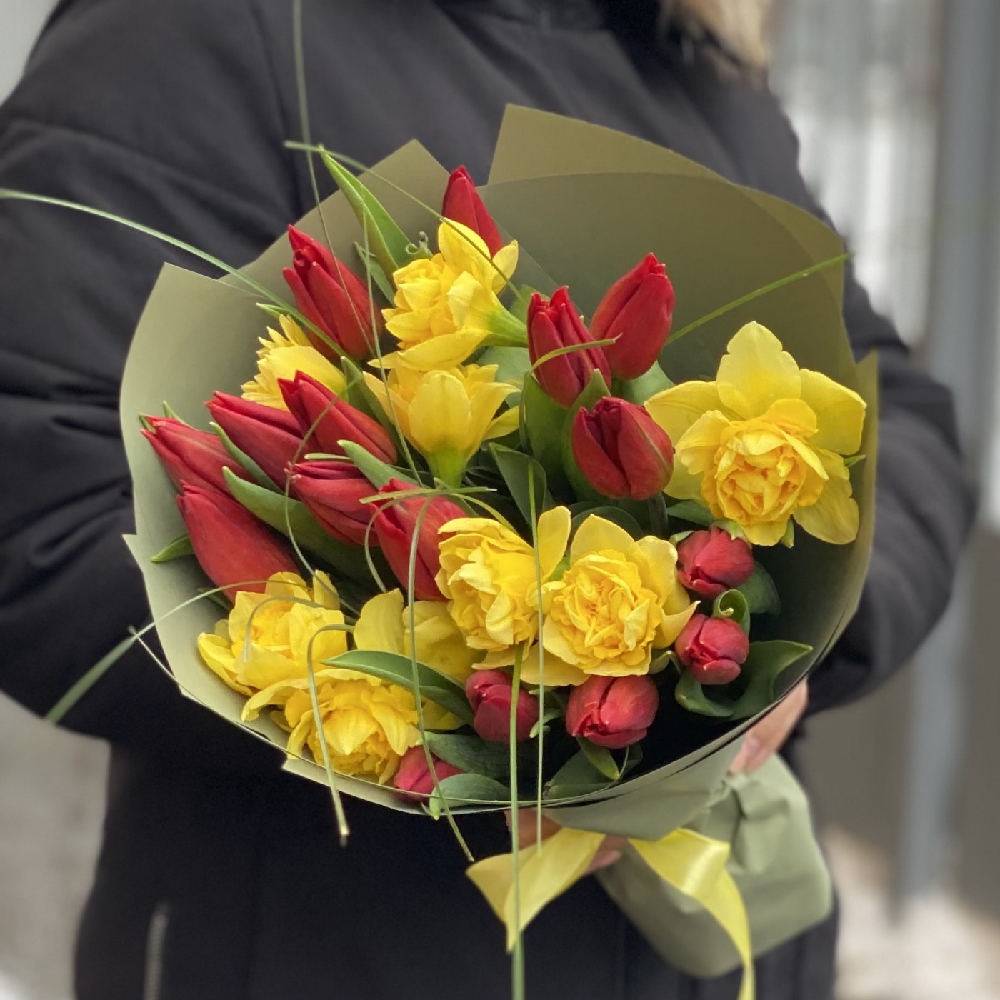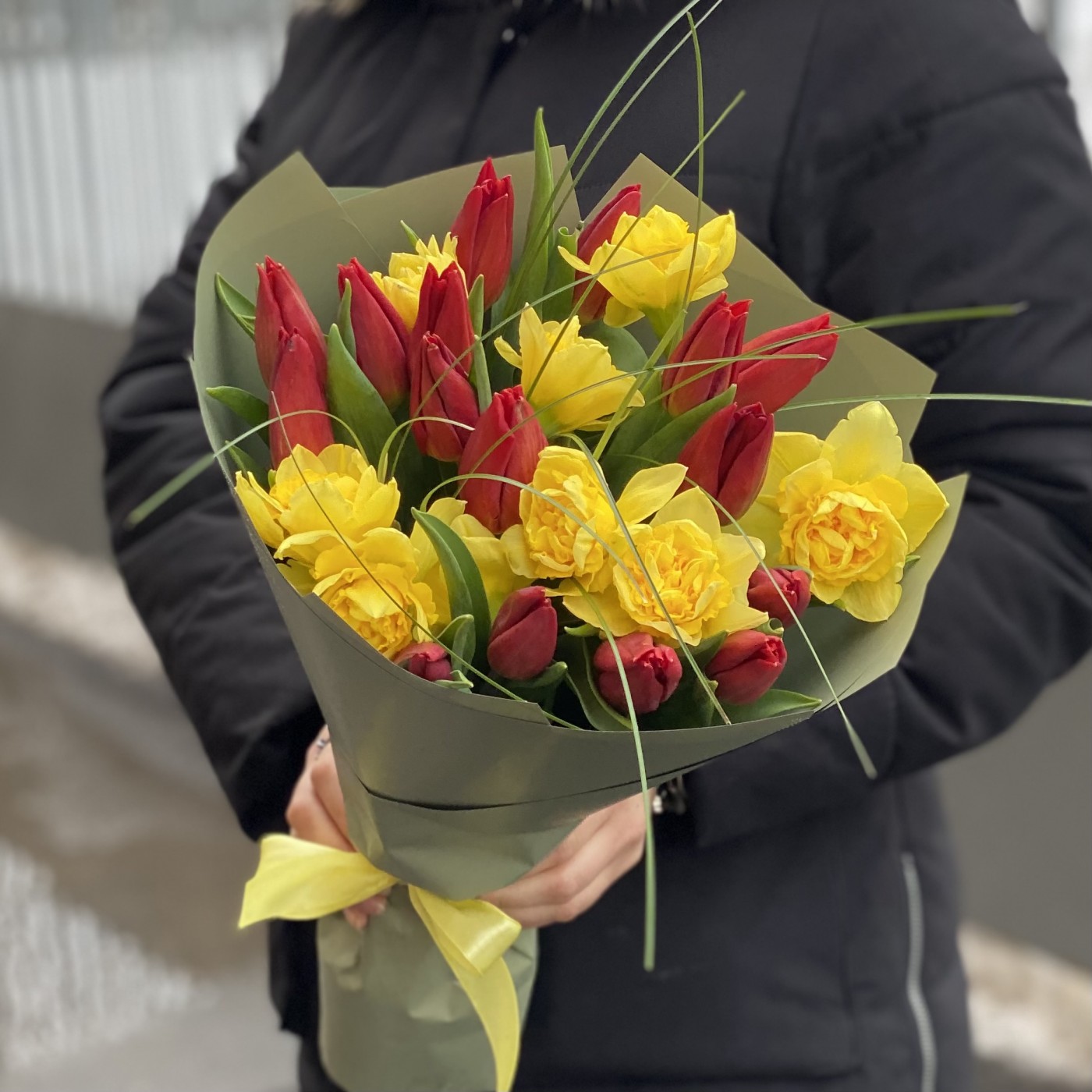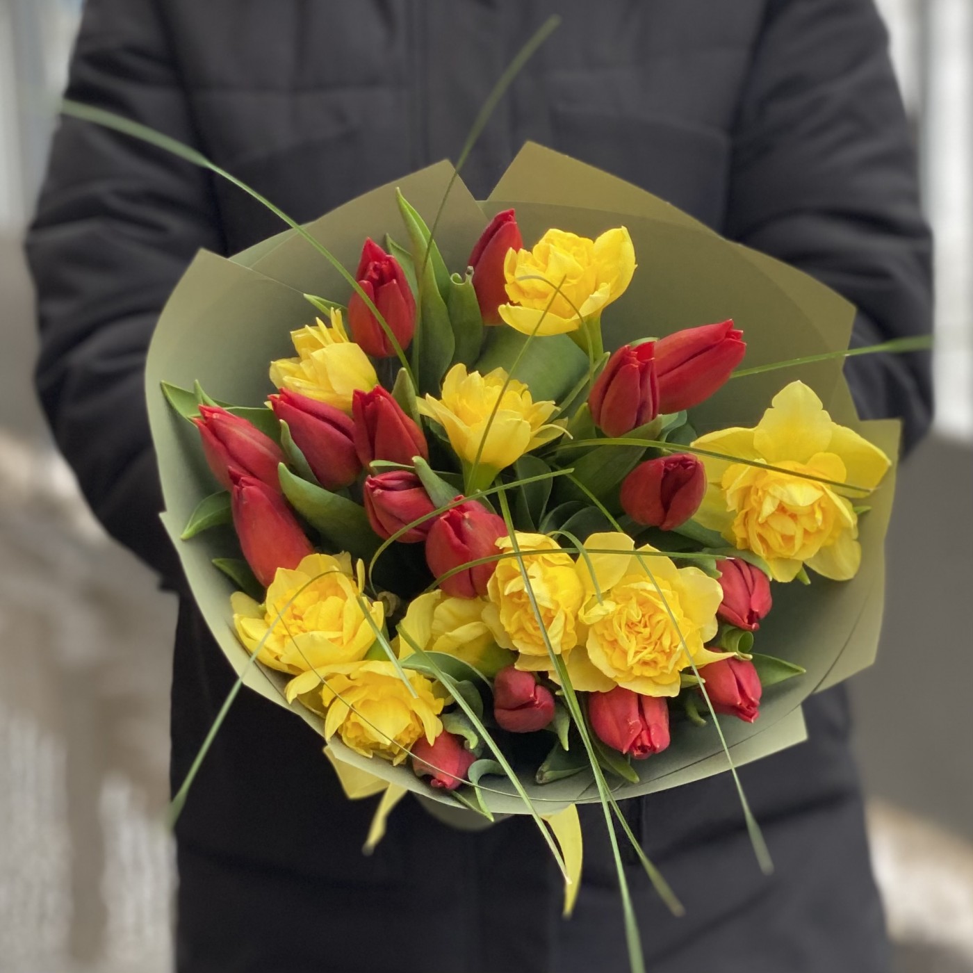 Яркий, радостный букет из красных тюльпанов и ароматных, желтых нарциссов подарит радость и восторг.