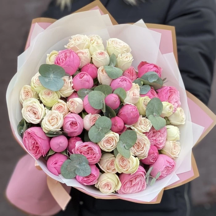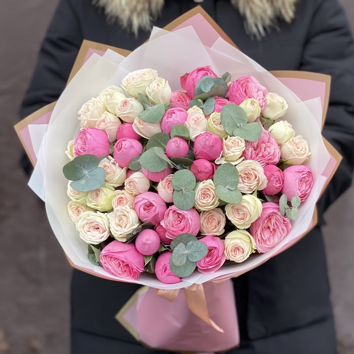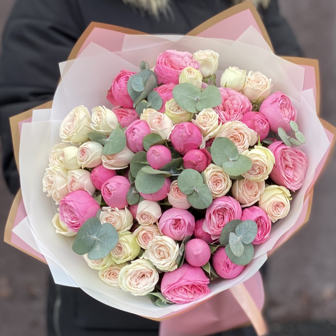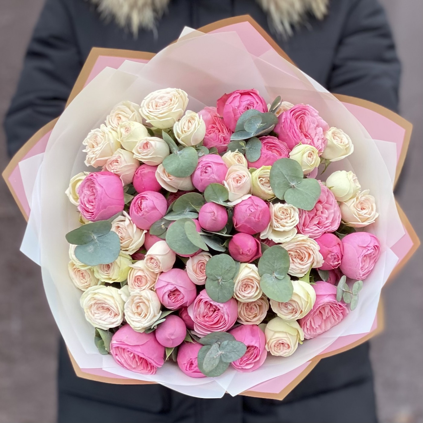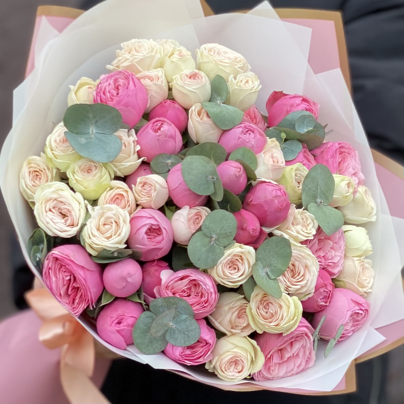 Светлый букет кустовых пионовидных роз который непременно вызовет чувственный трепет у получателя, чьё сердце вы хотели бы порадовать или растопить.
