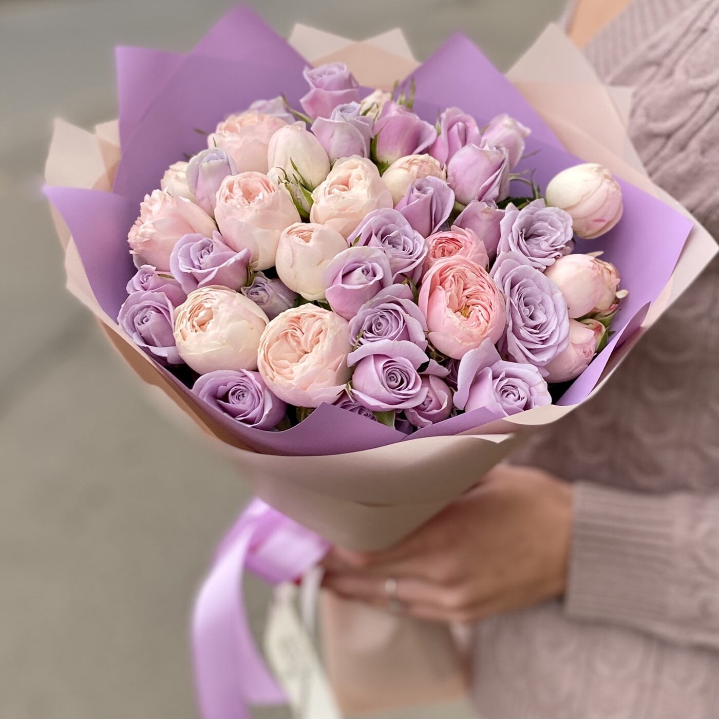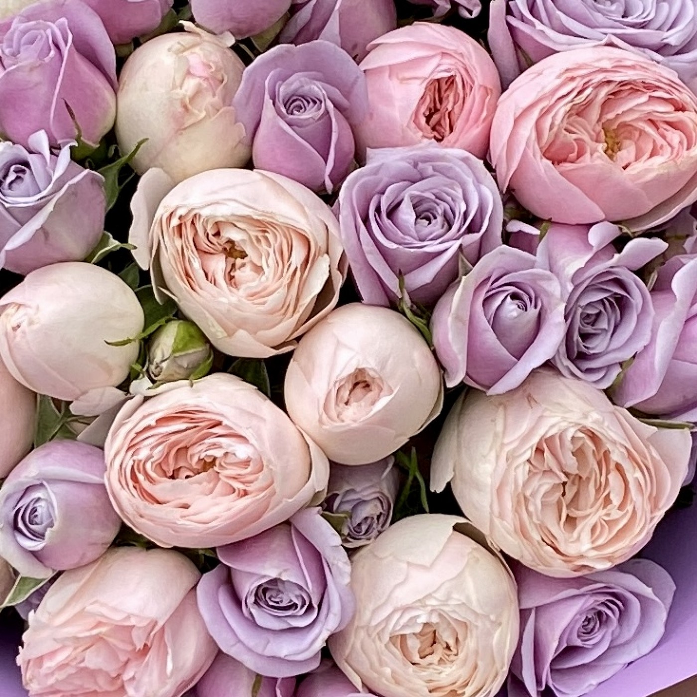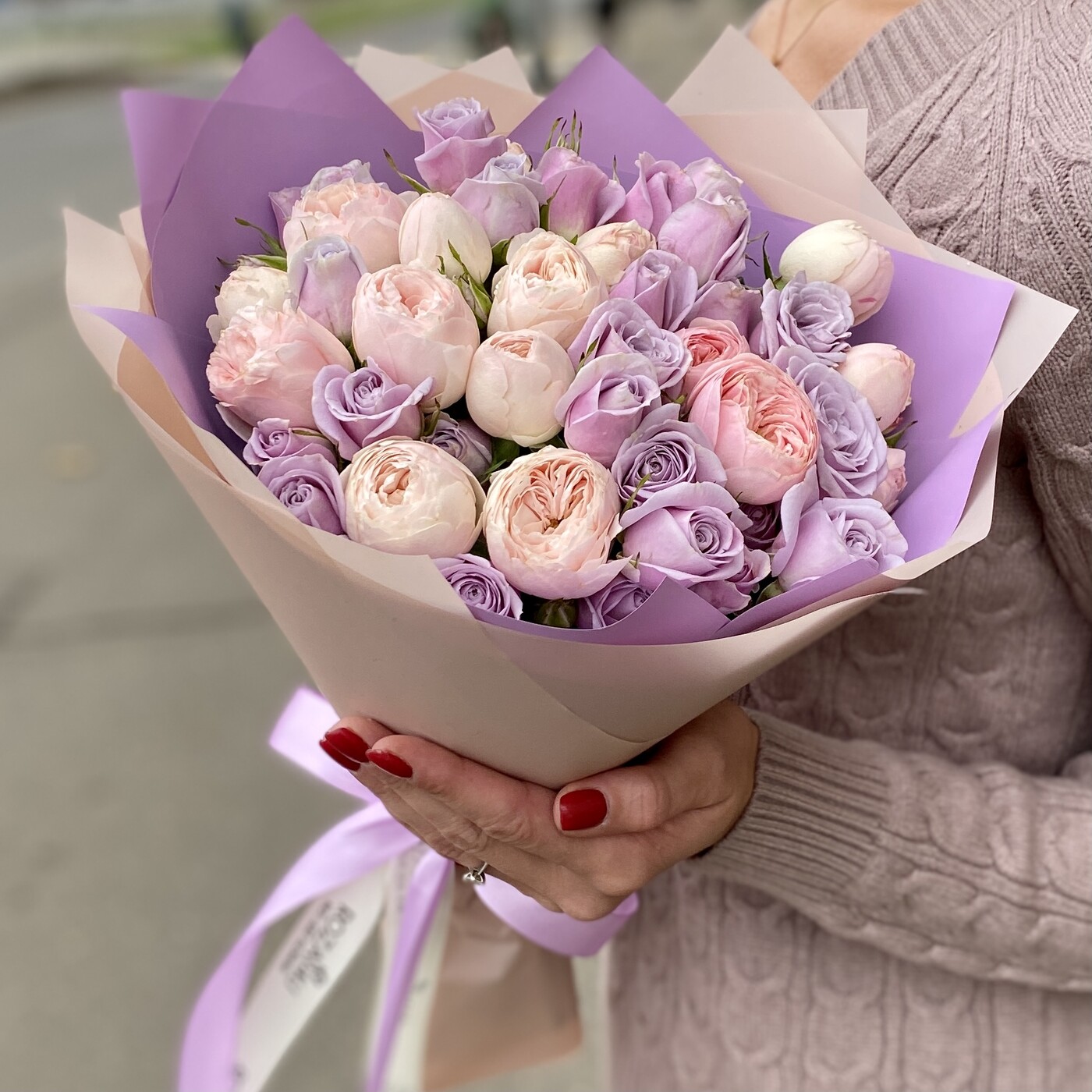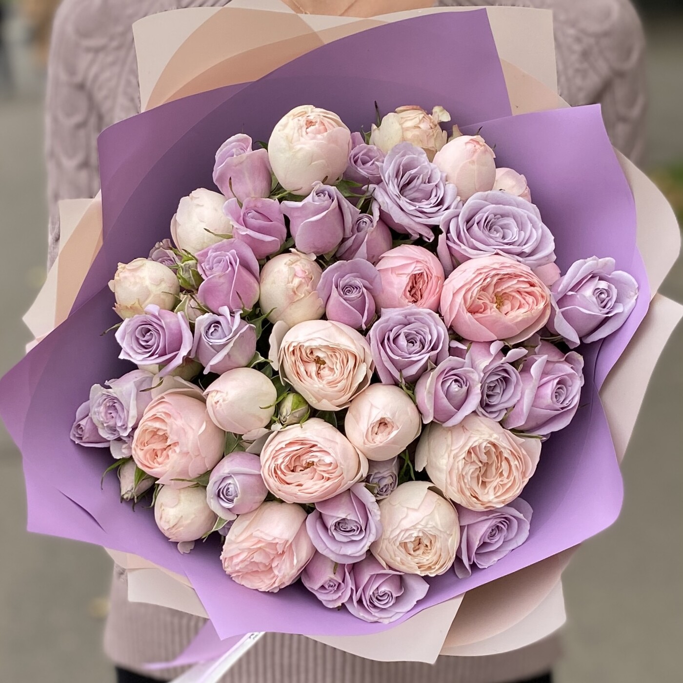 Нежный букет с лавандовыми кустовыми розами и пионовидными кустовыми розами сорта Мансфилд Парк. Букет прекрасно подойдет в качестве подарка на день рождения или вы можете отправить его в качестве комплимента и благодарности.