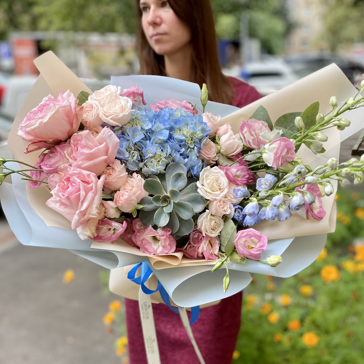 Состав большого букета: гортензия – 2, дельфиниум – 3, маттиола – 5, эхеверия – 2, гвоздика – 5, роза кустовая пионовидная – 5, эустома – 3, эвкалипт, нарине – 2, упаковка.