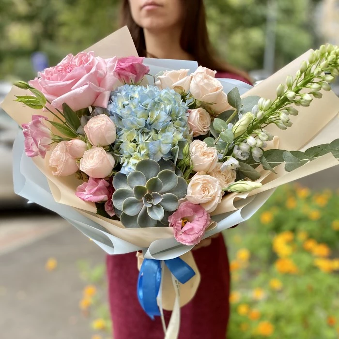 гортензия – 1, дельфиниум – 1, эхеверия – 1, роза пионовидная – 1, роза кустовая пионовидная – 3, эустома – 1, эвкалипт – 1, рускус, упаковка. Размер: ширина 35, высота 45.