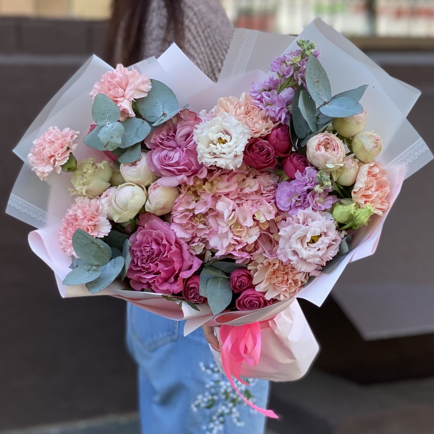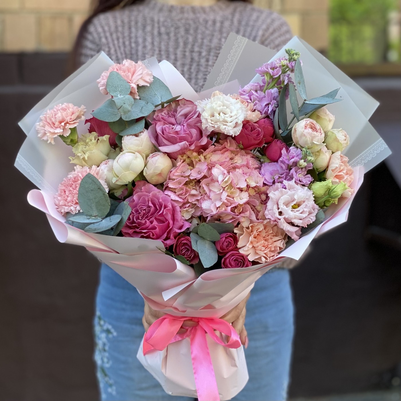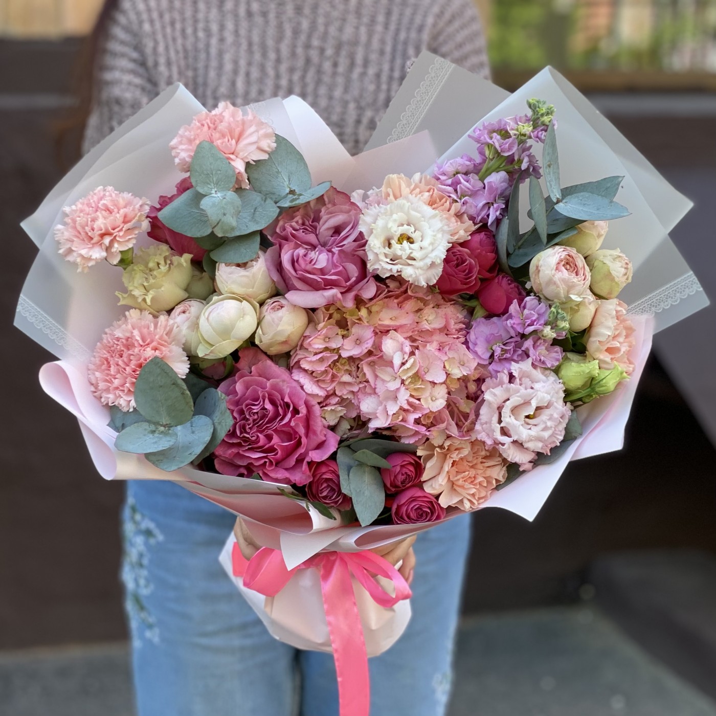 Разноцветный букет с пушистой гортензией и пионовидными розаами. Букет упакован в стильную корейскую пленку.