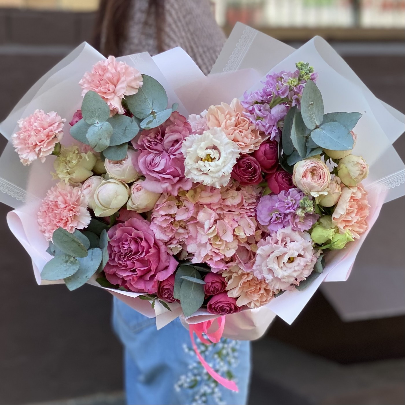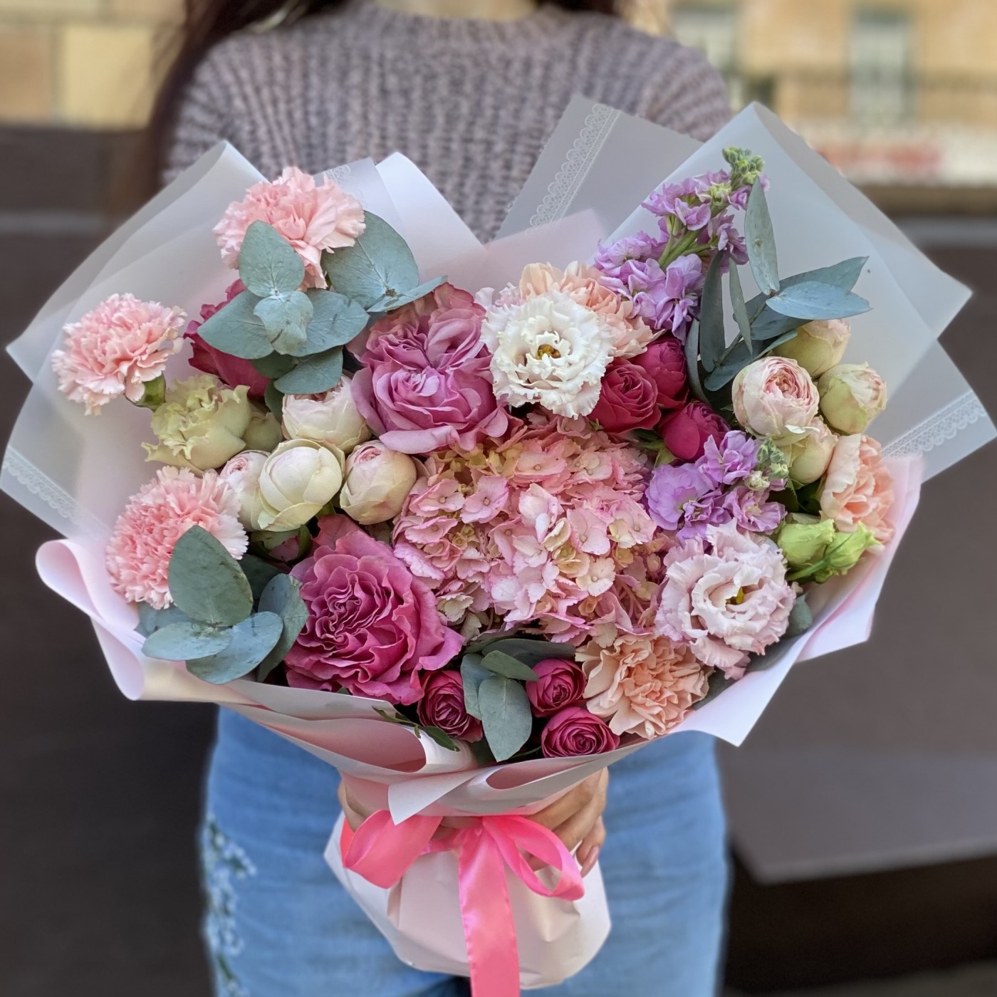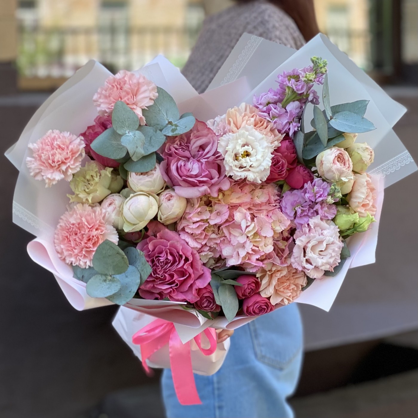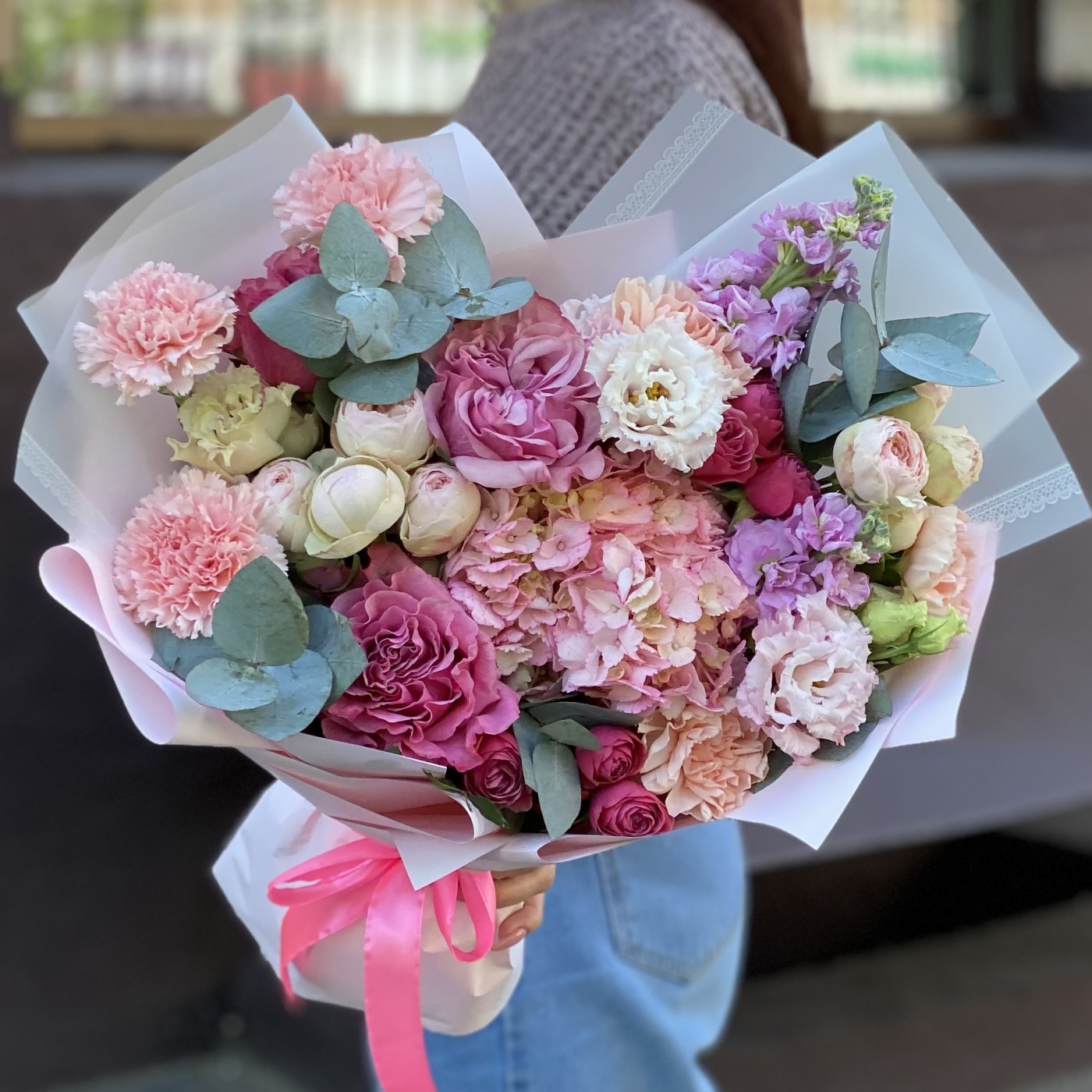 Разноцветный букет с пушистой гортензией и пионовидными розаами. Букет упакован в стильную корейскую пленку.